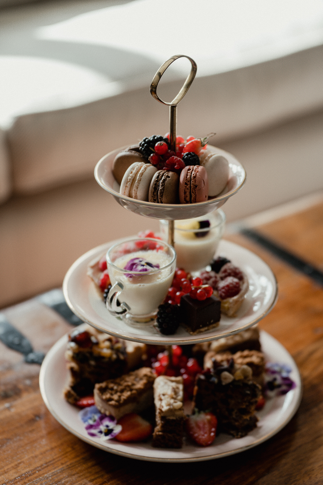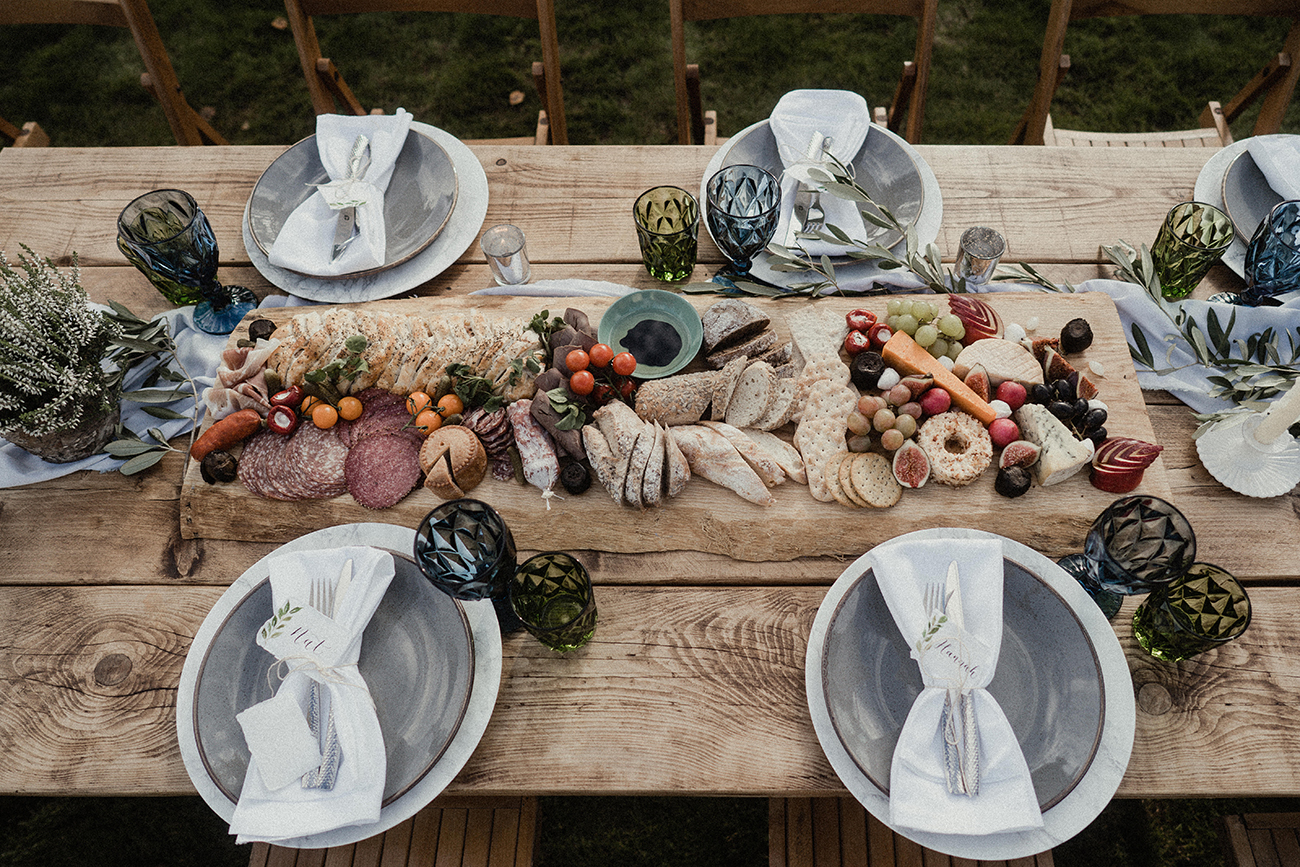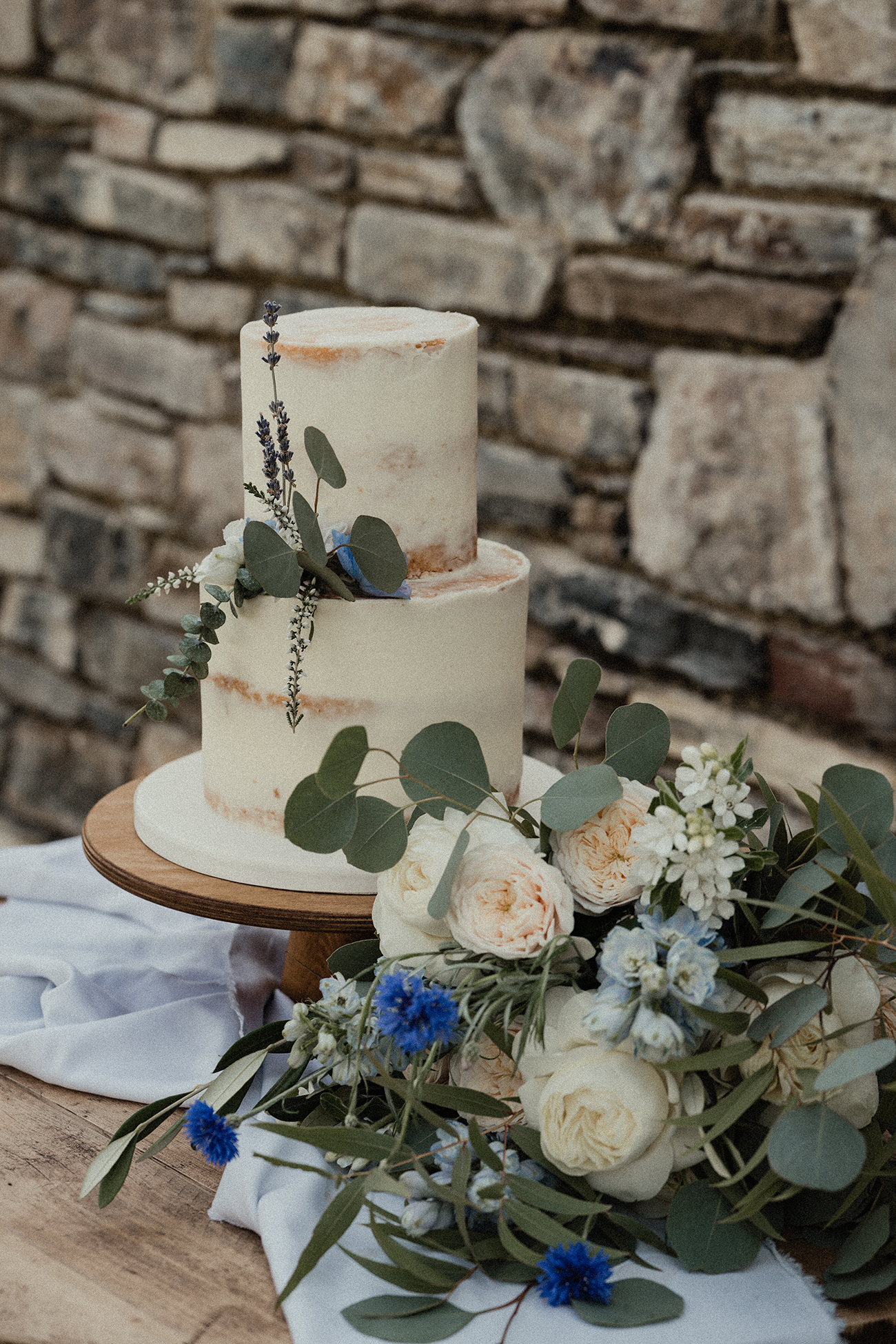 Set amidst the walled garden with far-reaching views across the surrounding meadows, the tablescape offers natural, unfussy styling, where the colours of the glassware, bunches of lavender and hearty sharing platters of fruits, meats and cheeses pop against the wooden table and slate grey tableware. A semi-naked cake and colourful hand-painted stationery adds to the charm.