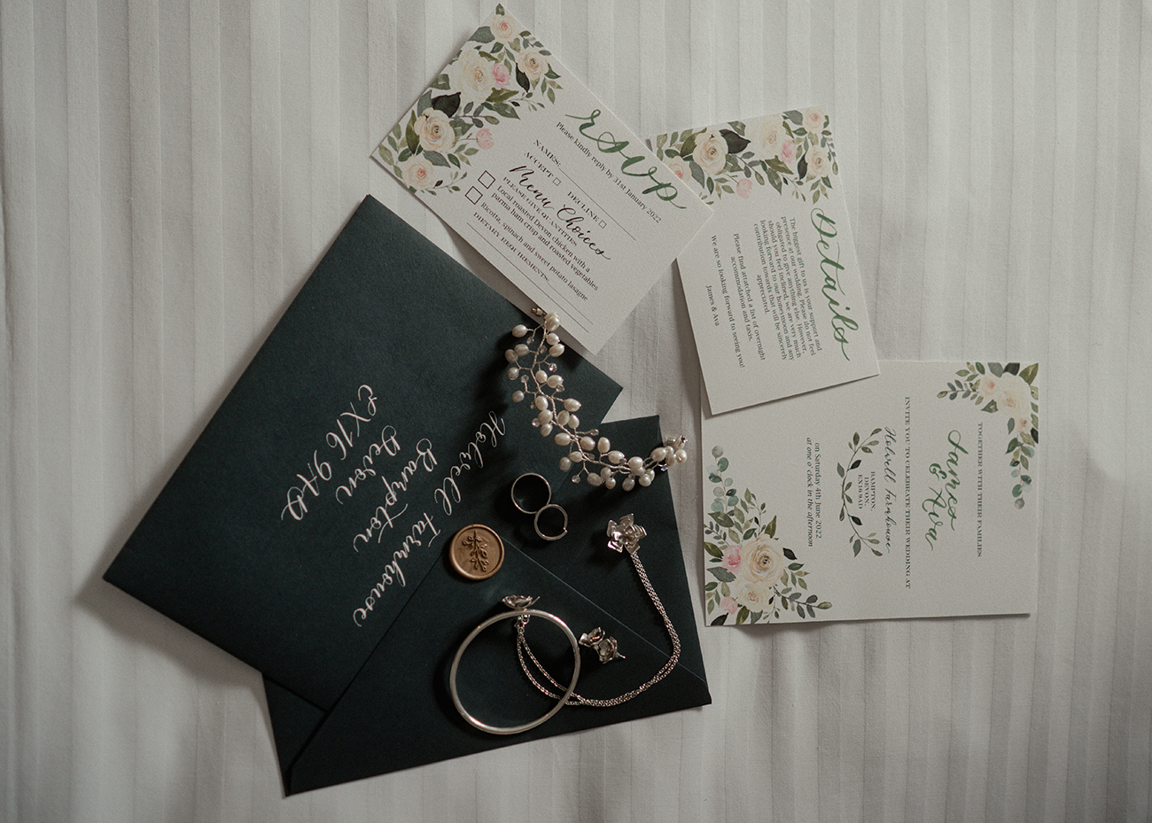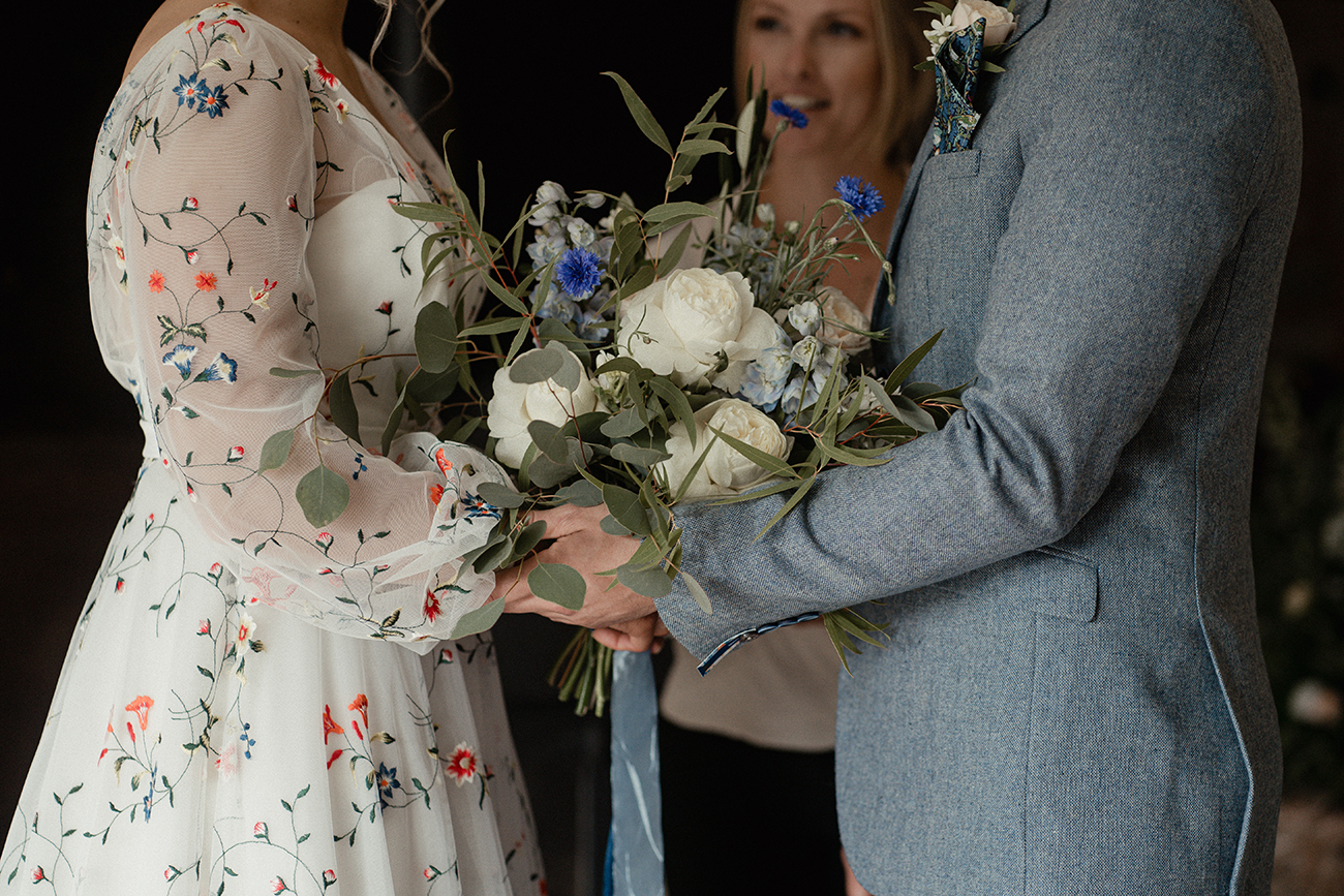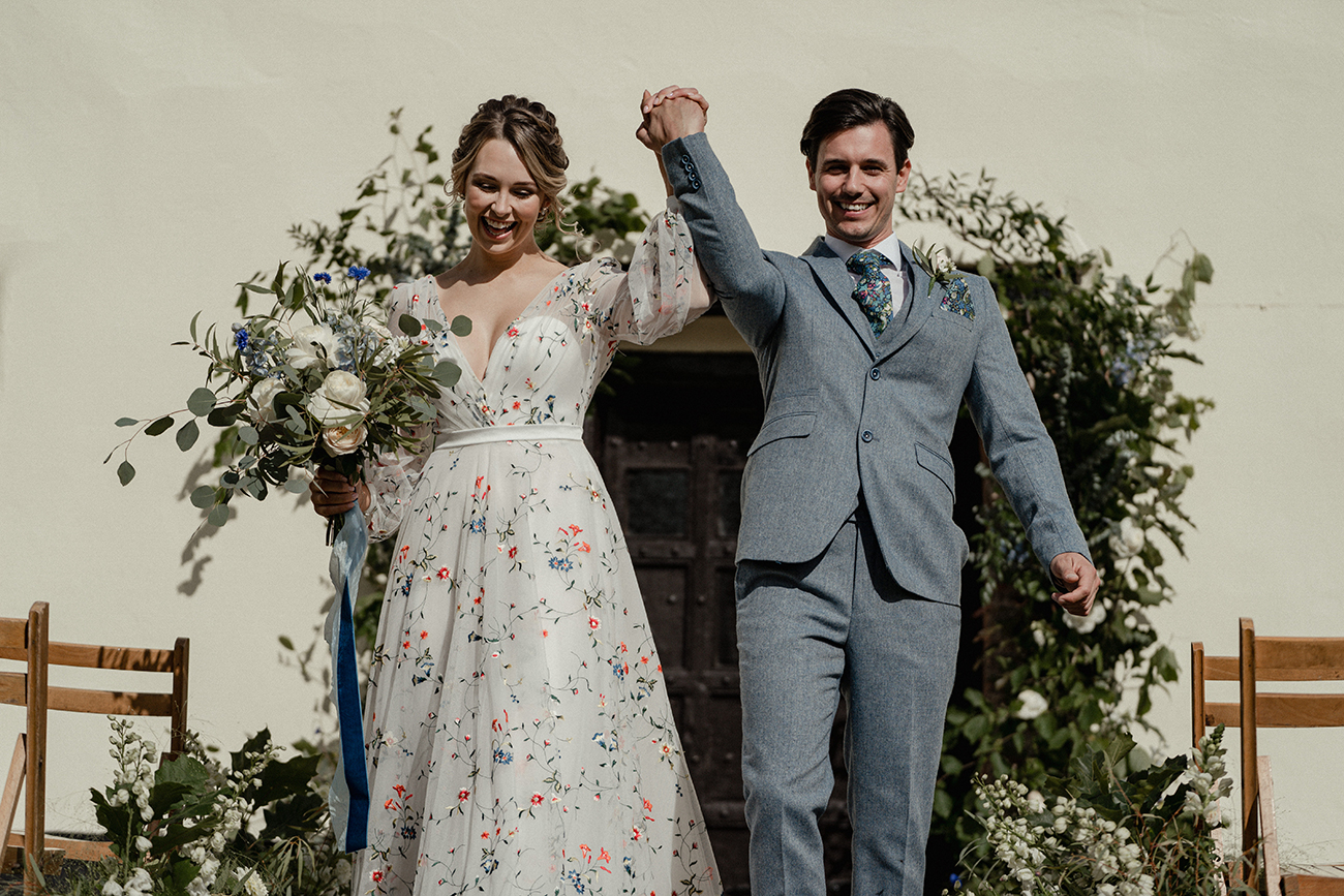 The Sassi Holford gown – an ethereal vision of delicately embroidered tulle with florals in shades of amber, cornflower and evergreen – also inspired much of the styling. “We picked accents from the gown to flow through the details throughout,” says Hazel.