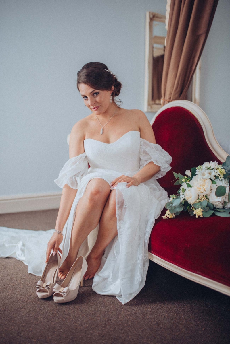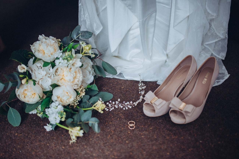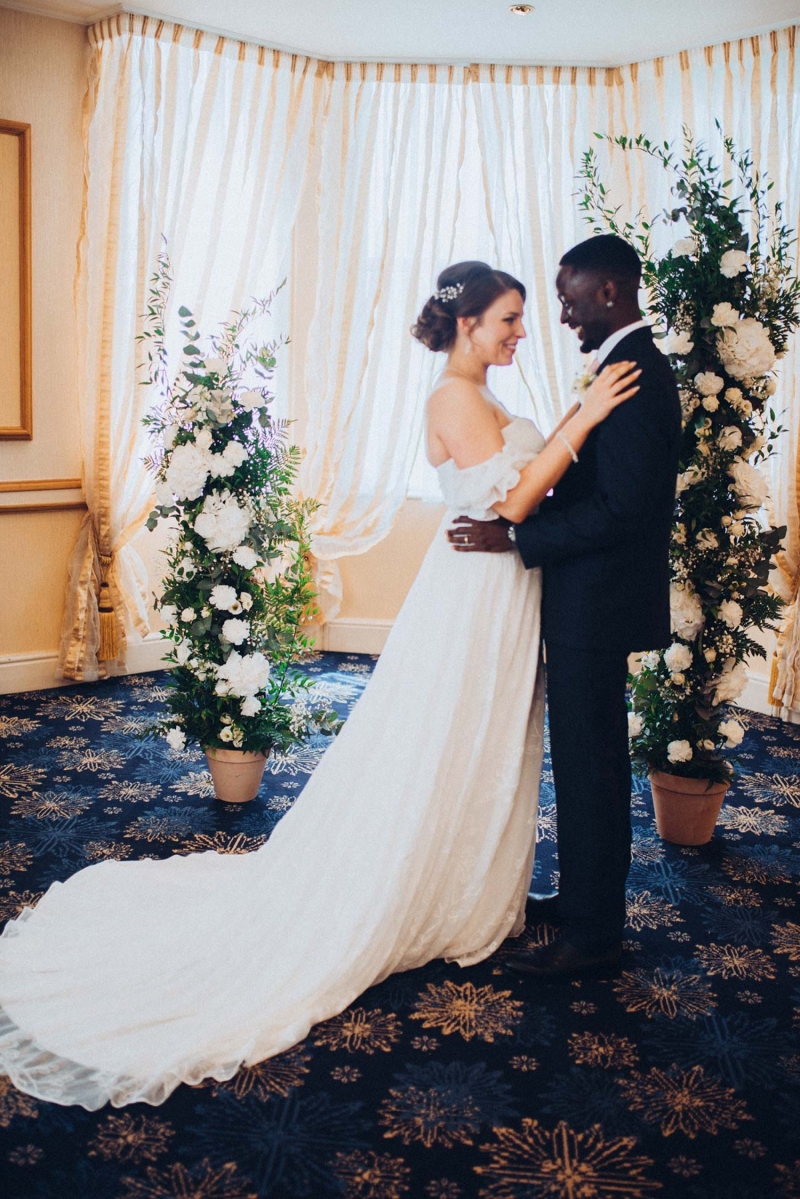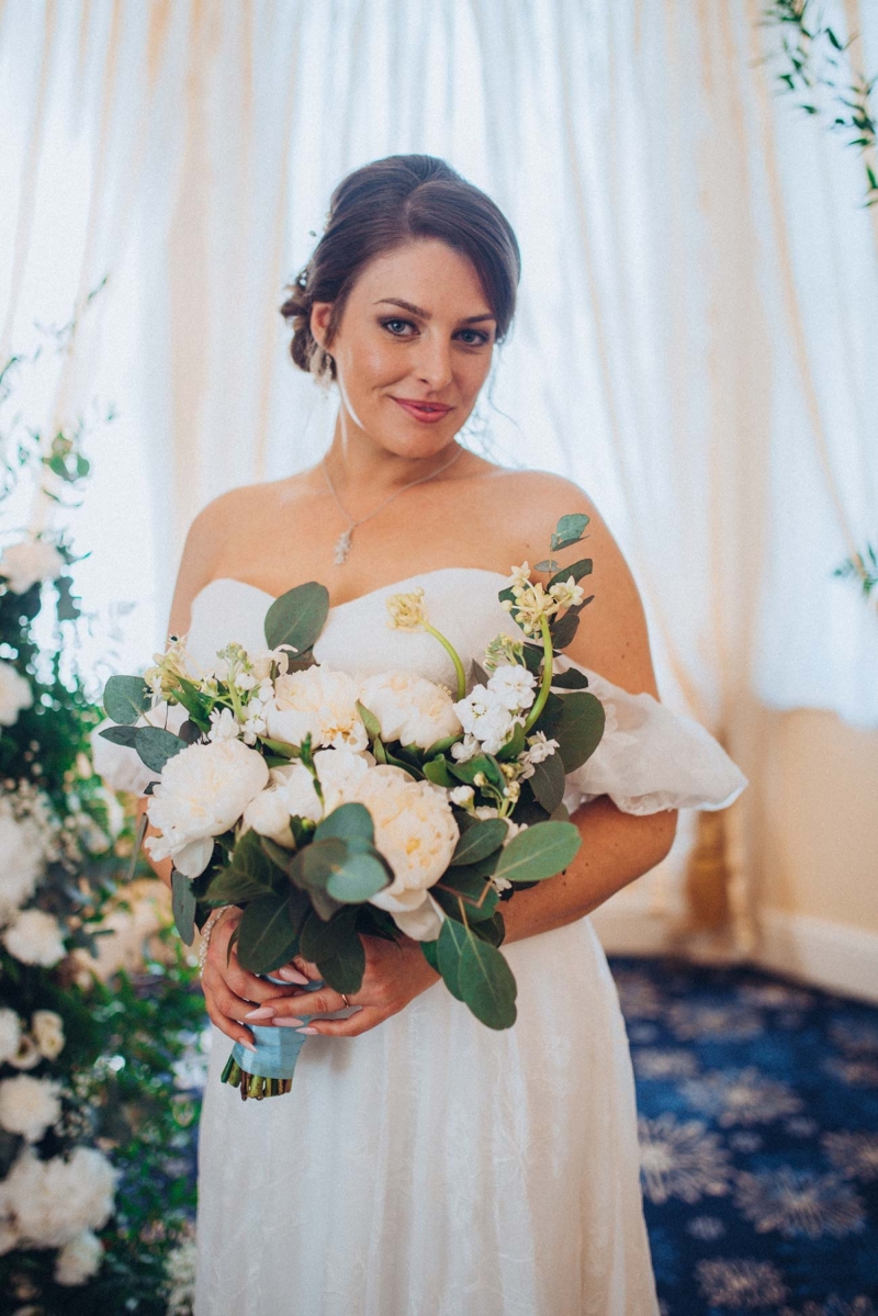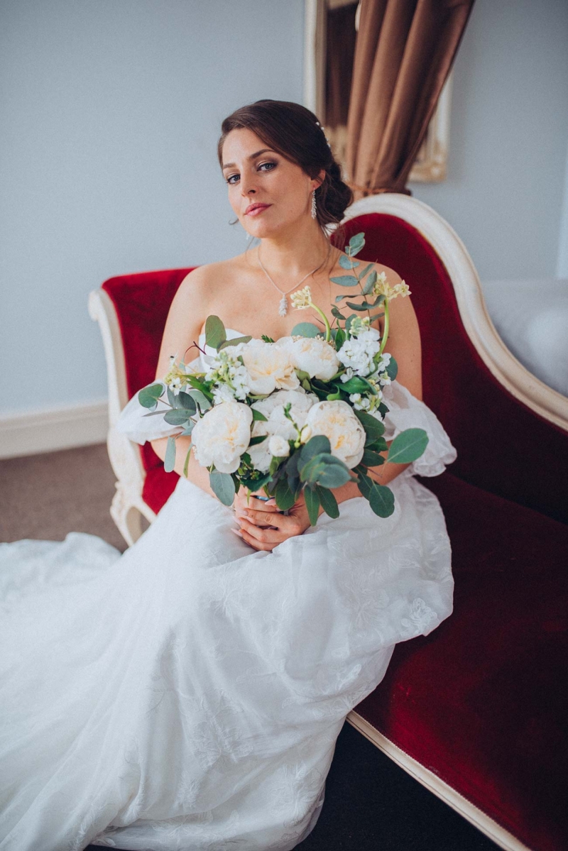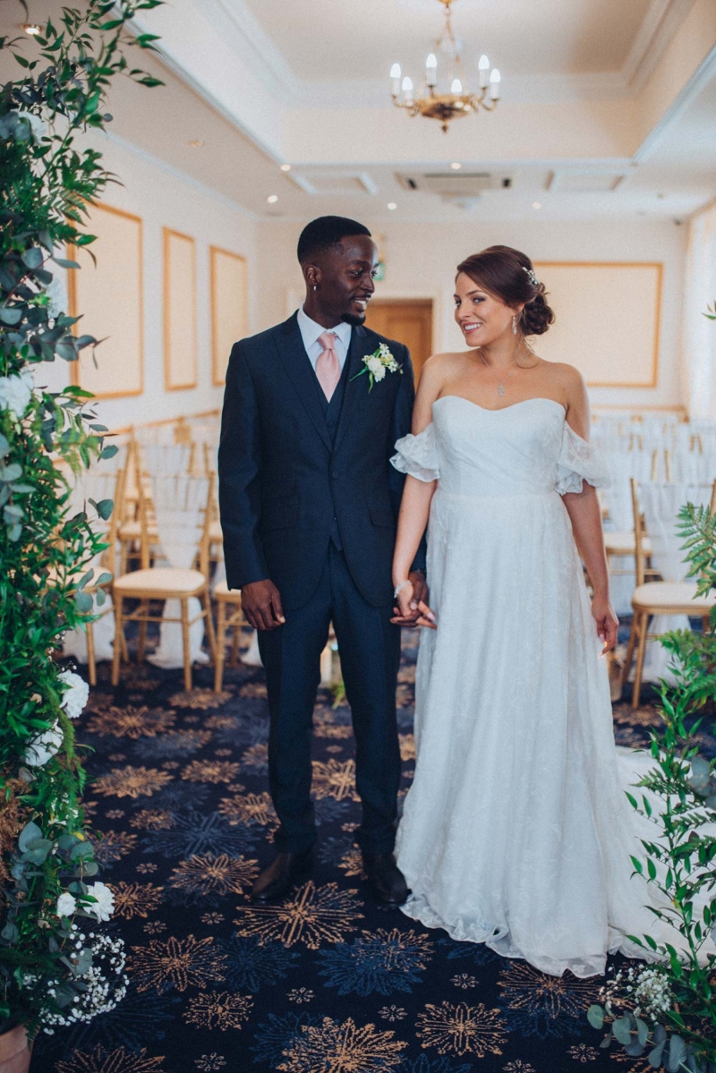 The floristry continues its role with the striking, yet subtle white and green bridal bouquet and towering aisle-end arrangements that frame the couple who echo this vision of modern vintage style. His slate grey three-piece suit with blush tie and buttonhole is as understated as it is dapper, while the bride's strapless sweetheart gown with sheer off-the-shoulder sleeves, nude peep-toe heels, elegant updo and delicate jewellery further reflect the sophisticated, on-trend aesthetic.