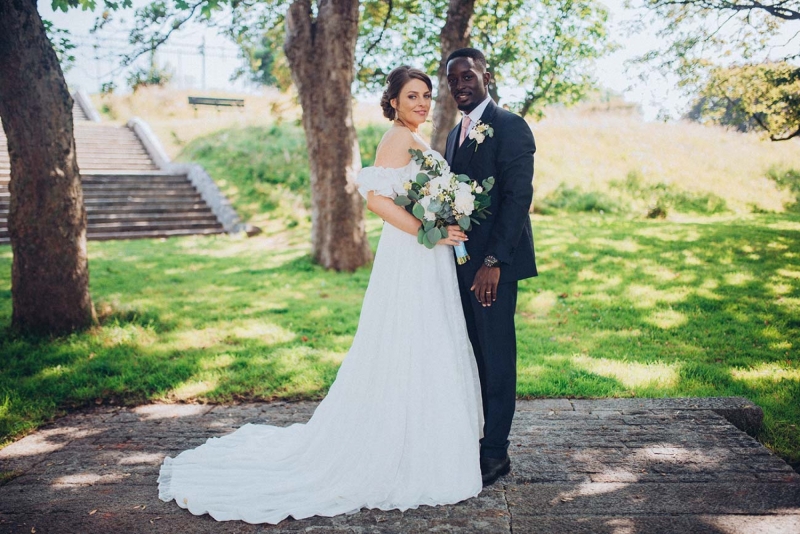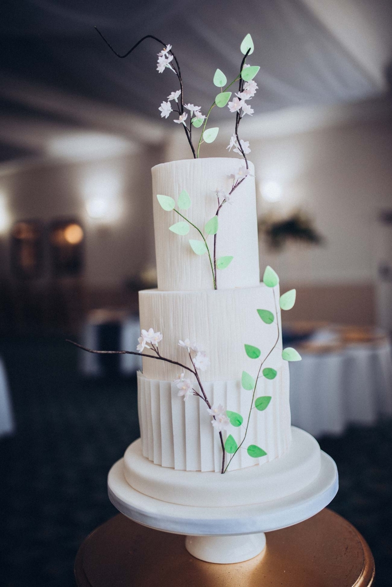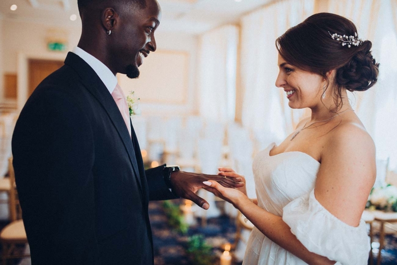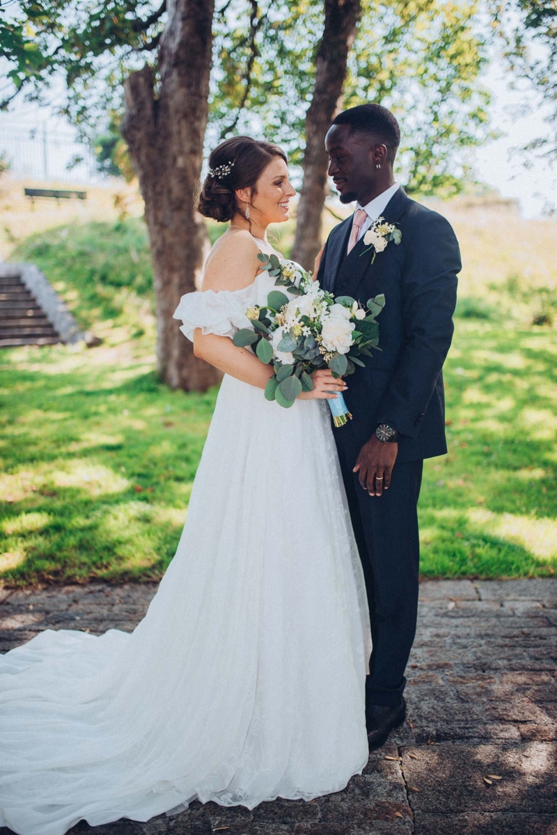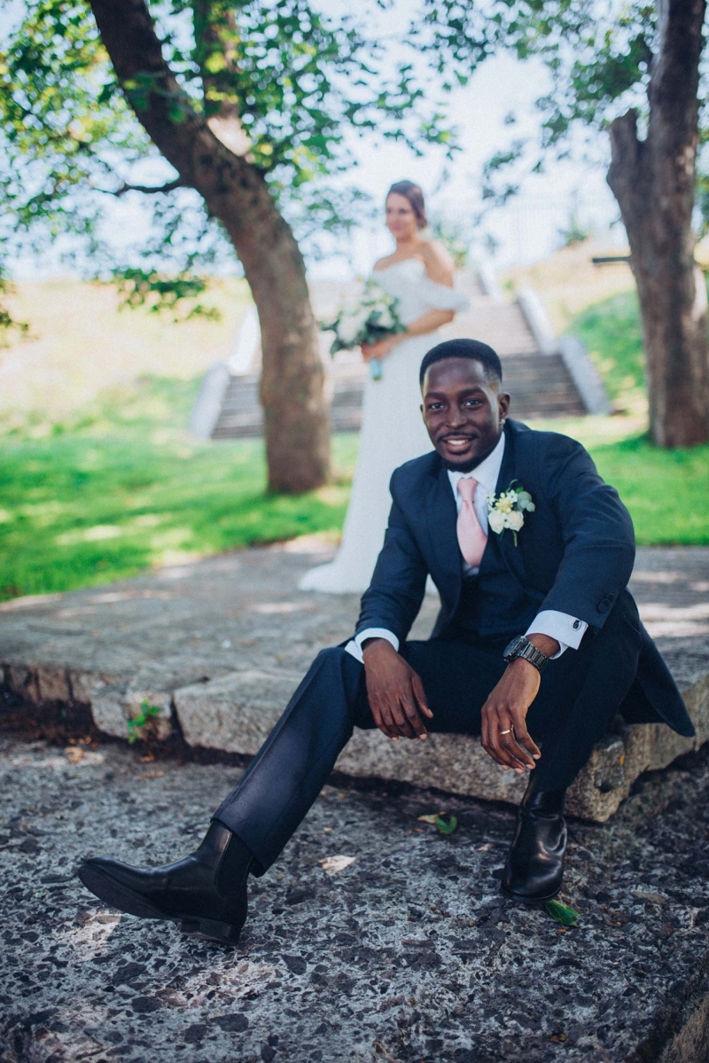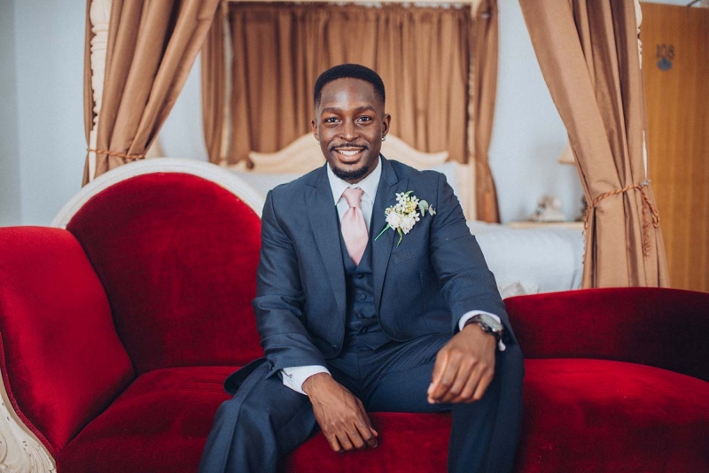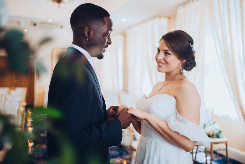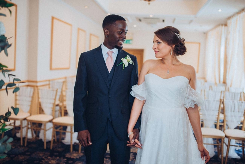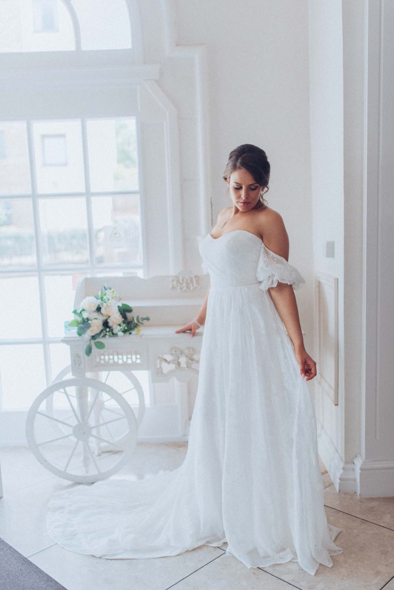 The floristry continues its role with the striking, yet subtle white and green bridal bouquet and towering aisle-end arrangements that frame the couple who echo this vision of modern vintage style. His slate grey three-piece suit with blush tie and buttonhole is as understated as it is dapper, while the bride's strapless sweetheart gown with sheer off-the-shoulder sleeves, nude peep-toe heels, elegant updo and delicate jewellery further reflect the sophisticated, on-trend aesthetic.