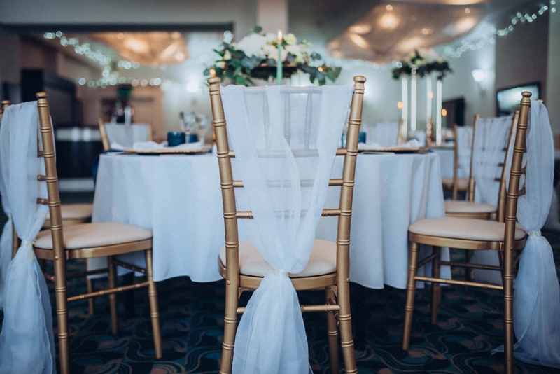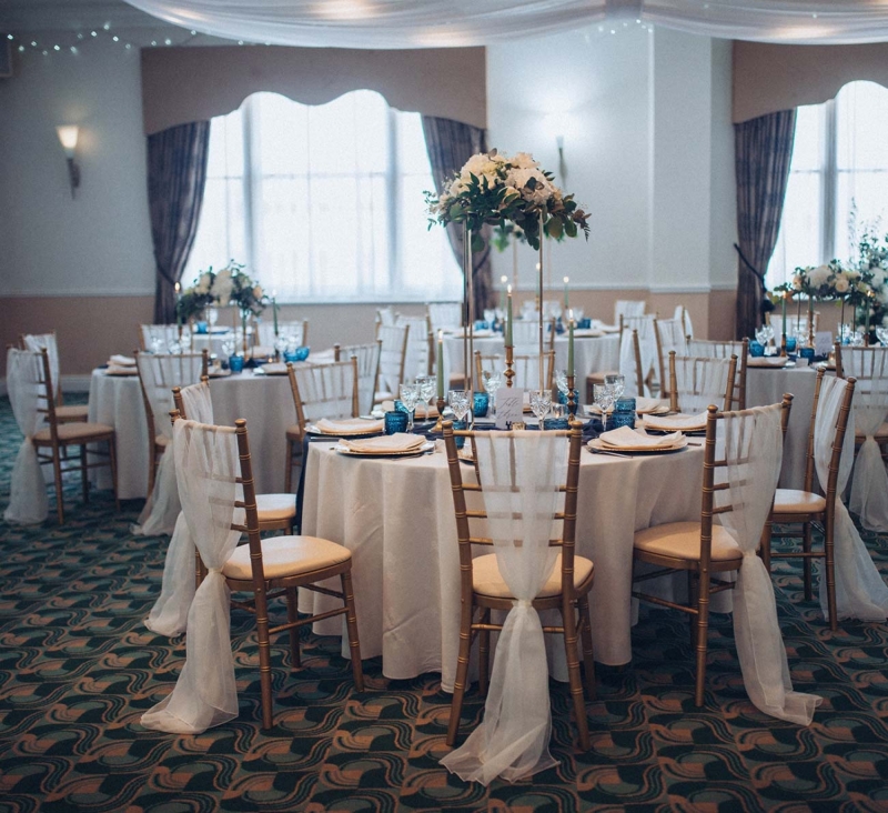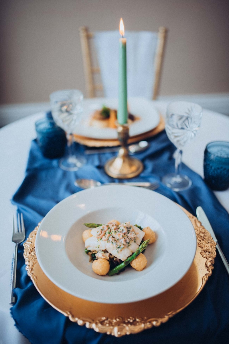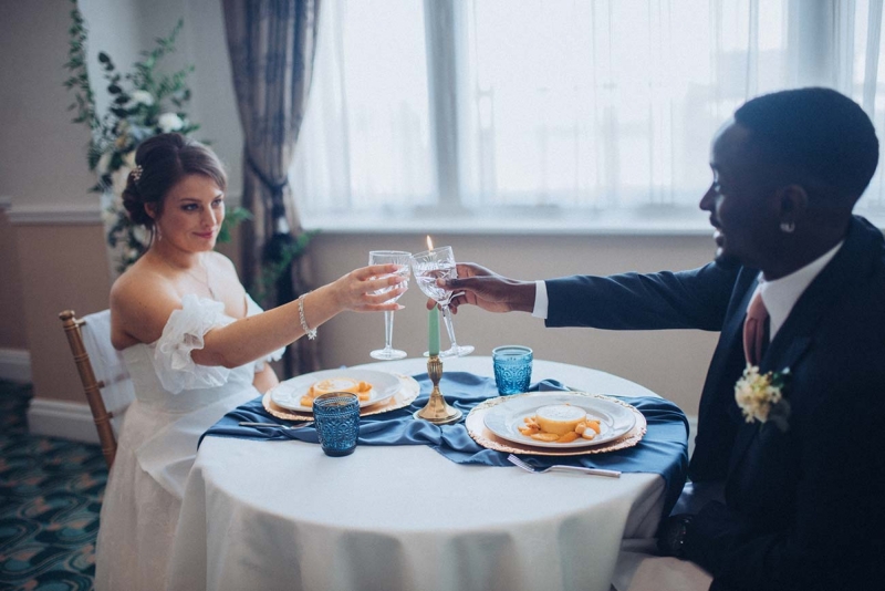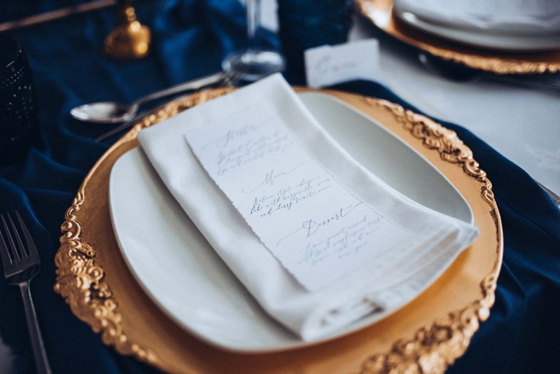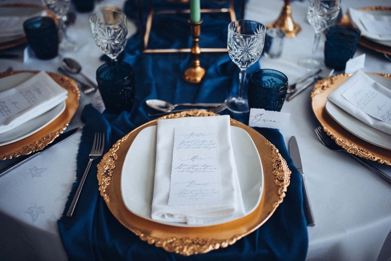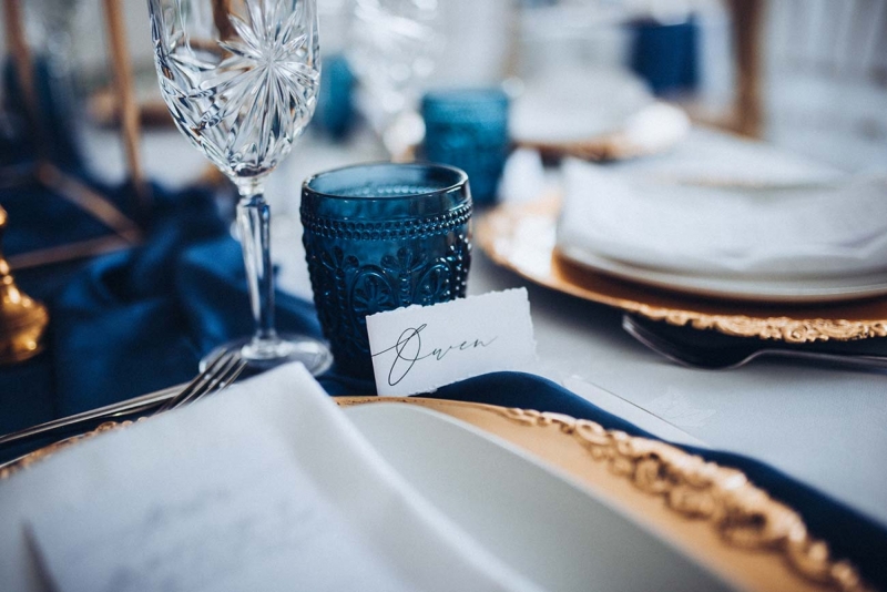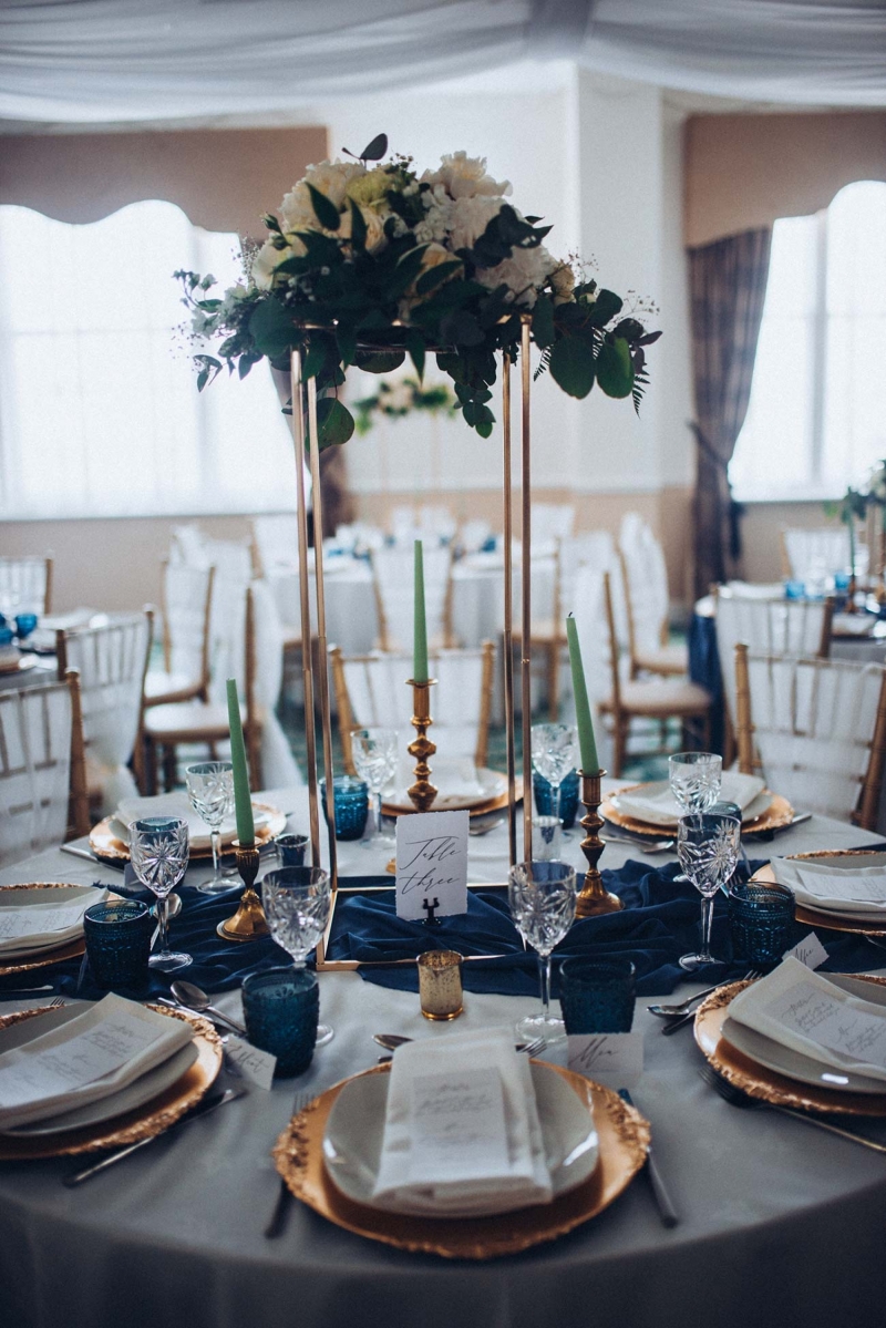The New Continental is a classic space to say "I do", presenting couples with a chic setting courtesy of a layering of neutral tones spliced with opulent shades including midnight blues that are picked up and accentuated by the shoot's reception styling. Its sense of old world charm is captured by the luxe tableware: decadent glassware and gold charger plates sit alongside ornate candlesticks and high centrepieces to elevate the scene. Meanwhile, the crisp white table linens ensure a clean and contemporary contrast, with the addition of soft green tones through the candlesticks, cake, and smattering of foliage freshening the look further while also lending an eye-catching modern edge.