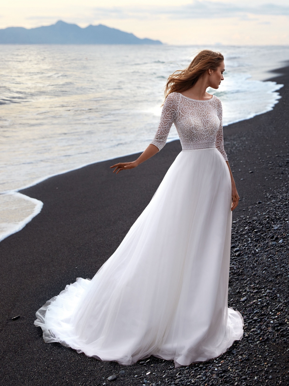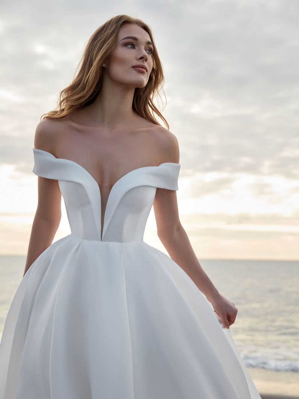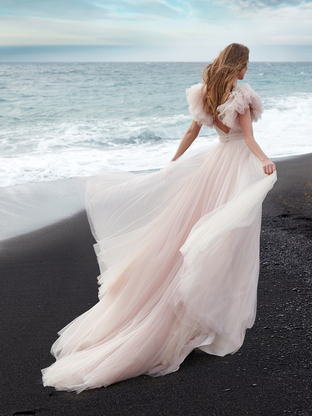 Let's start with Anghel, whose antique rose tulle is finished with sculptural shoulder ruffles. Then there's the Chantilly lace and floral bodice of Selkis, which falls into a gorgeous light pink tulle skirt with royal train; or the clean lines of Tinia's white Miakdo and organza princess gown with off-the-shoulder geometric neckline that is achingly chic.