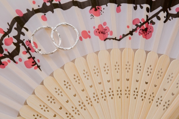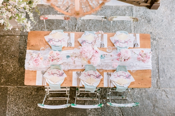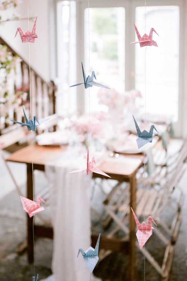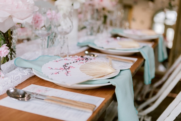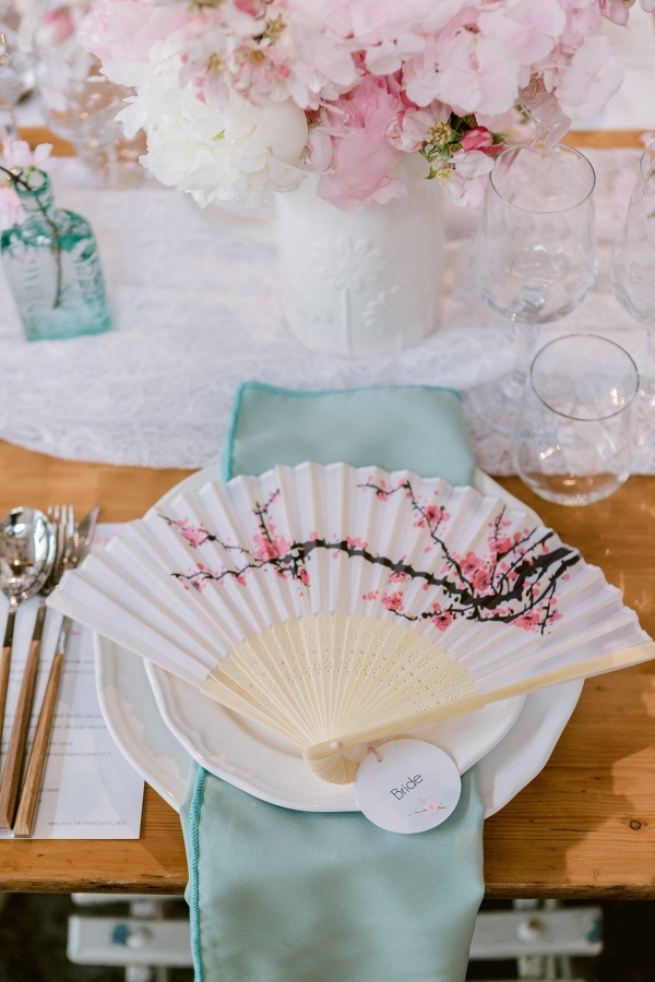 Echoing the gorgeous bouquet, the tablescape is styled with pretty pink hues, offset with accents of aqua. Soft petals spill from cut-glass vases, while the Far Eastern mood is evoked by bamboo cutlery, a carnival of origami cranes ' a powerful symbol of love and fidelity in Japanese legend ' and decorative hand fans decorated with cherry blossom. The stationery also draws on the Japanese flora, capturing the blush pinks, sage greens and fresh whites to complement the romantic mood.