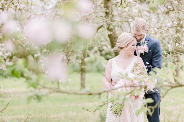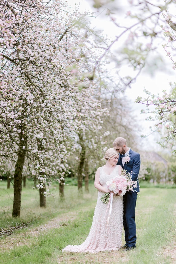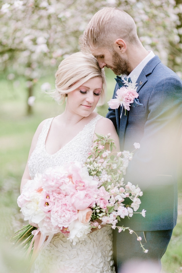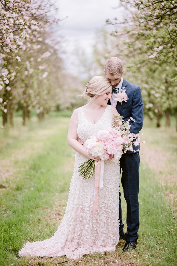 Outside, the blossom is in full bloom: the perfect backdrop for a just-wed couple. 'I used apple blossom to give the same feel as cherry blossom, working with a venue, Pennard House, that had its own orchards,' says Jennifer. 'It is a shoot that is designed to be soft and romantic in its feel, just like the sakura season itself.'