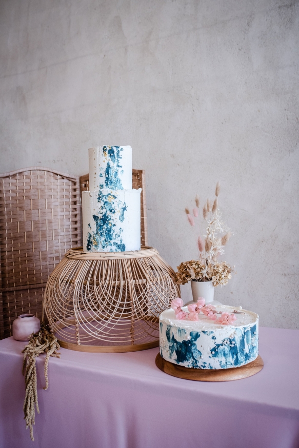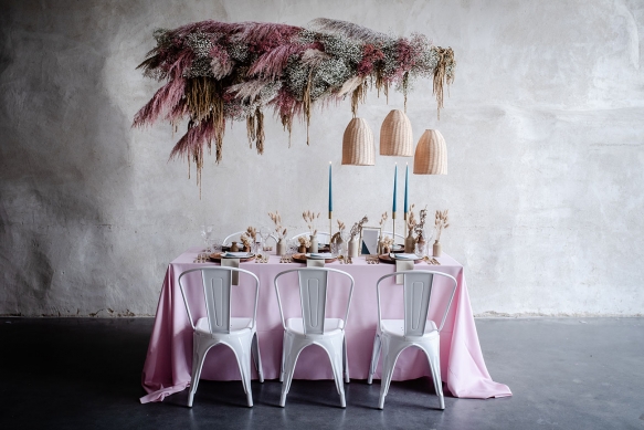 A palette of candy pink and ivory, complemented by shades of turquoise and teal, and accents of natural rattan, wood and gold, sets the scene for a modern look with a boho twist. Mixed with fresh pinks and gypsophila, stunning swathes of pampas grass and dried flowers create a striking hanging arrangement above the table, with natural rattan lampshades adding a further touch of boho style. Rattan also features on the cake table, elevating the texture-rich confection, while the splashes of teal and gold, together with the candy pink tablecloth, echo the palette.