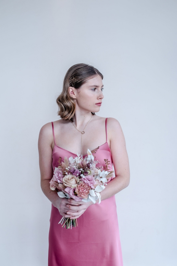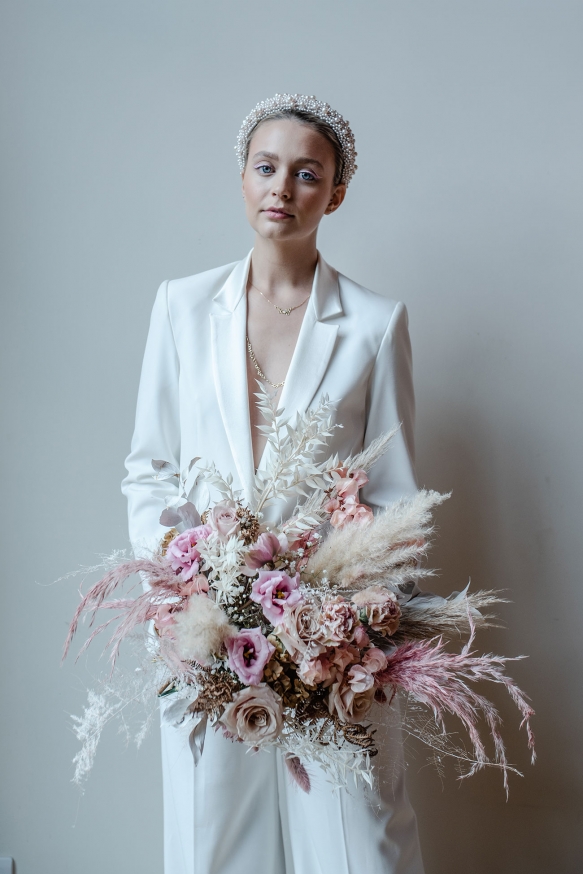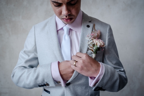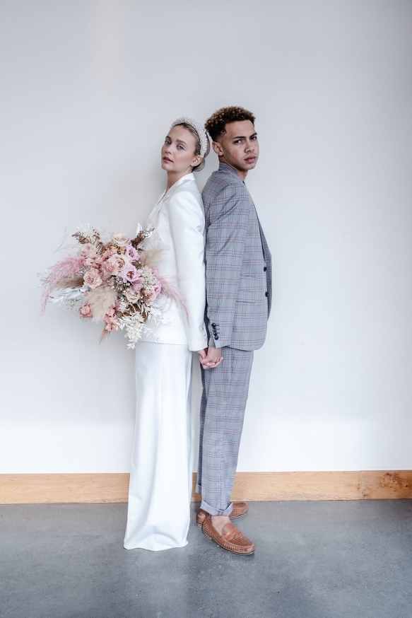 In keeping with the modern aesthetic, the bridal wear ranges from a shimmering sequin skirt paired with a crisp high-neck top for the ceremony to a sharp tuxedo suit and sleek jumpsuit, while the bridesmaid dons a chic satin slip. Pearl-encrusted headbands add the perfect modern finish alongside exquisite handcrafted jewellery. The groom, meanwhile, wears a silver-grey suit and pink shirt for the ceremony followed up with a more casual pink and grey checked suit teamed with a T-shirt for later in the day.