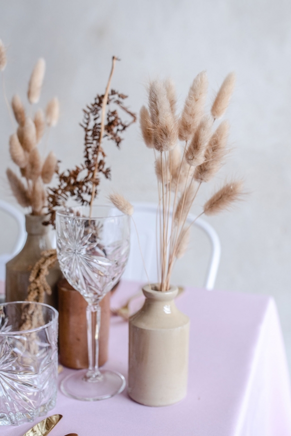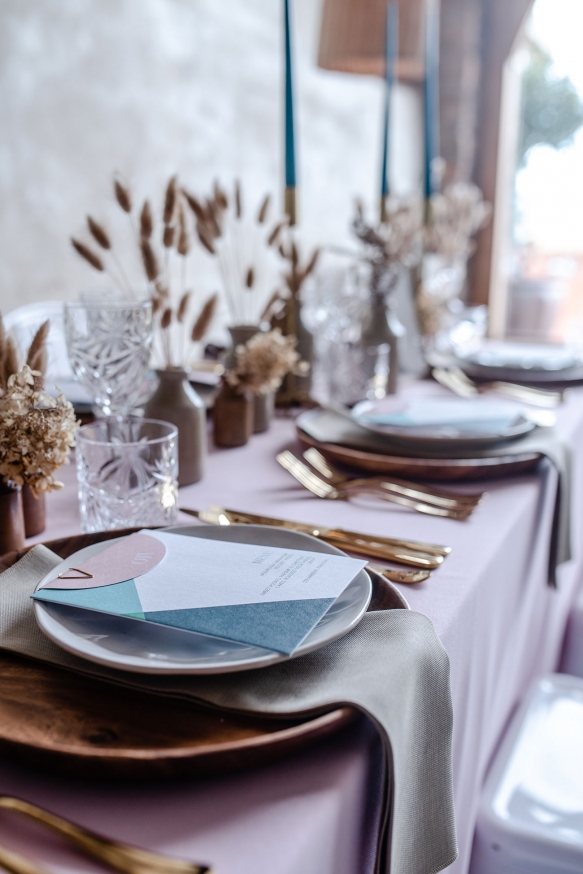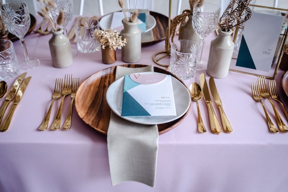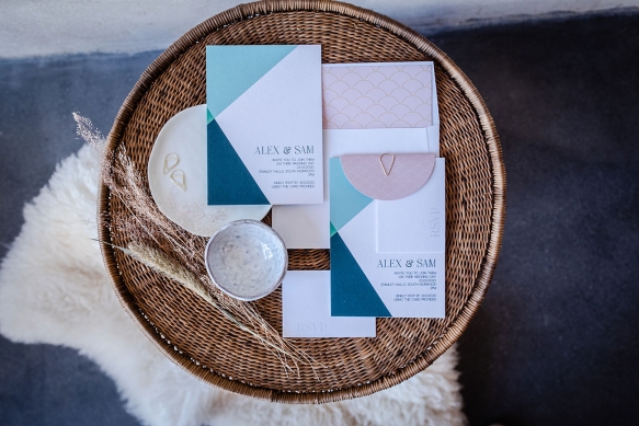 “Stationery was pops of pink, teal and gold with modern geometric clips and natural curved lines,” says Nikki. “This theme ran throughout the wedding and included a modern gold frame table plan, accented with more beautiful boho flowers and pampas.”