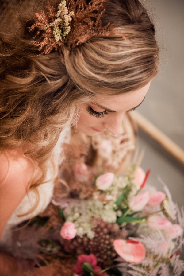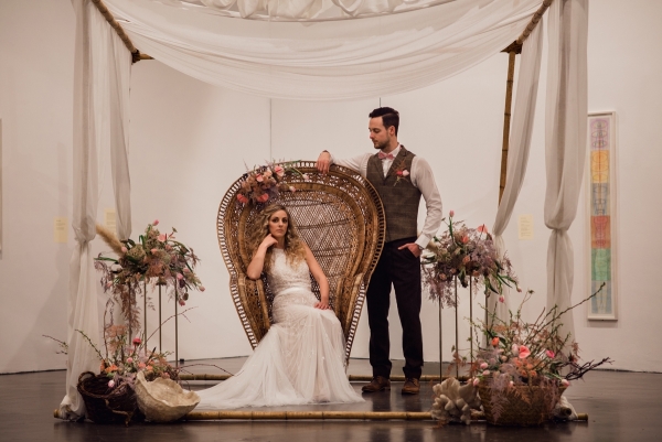 Lounging on a beautifully boho peacock chair adorned with pink petals, the bridal look marries a relaxed Californian mood with a pretty aesthetic; soft curls tumble over a light and delicately embellished gown, while the flawless make-up combines dramatic smoky eyes with a soft blush sweep on the cheeks and lips.