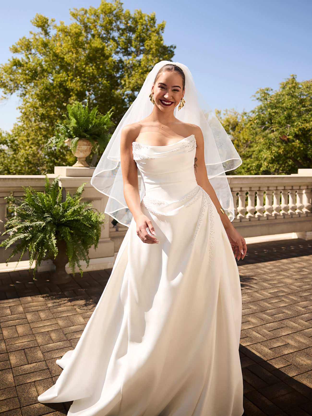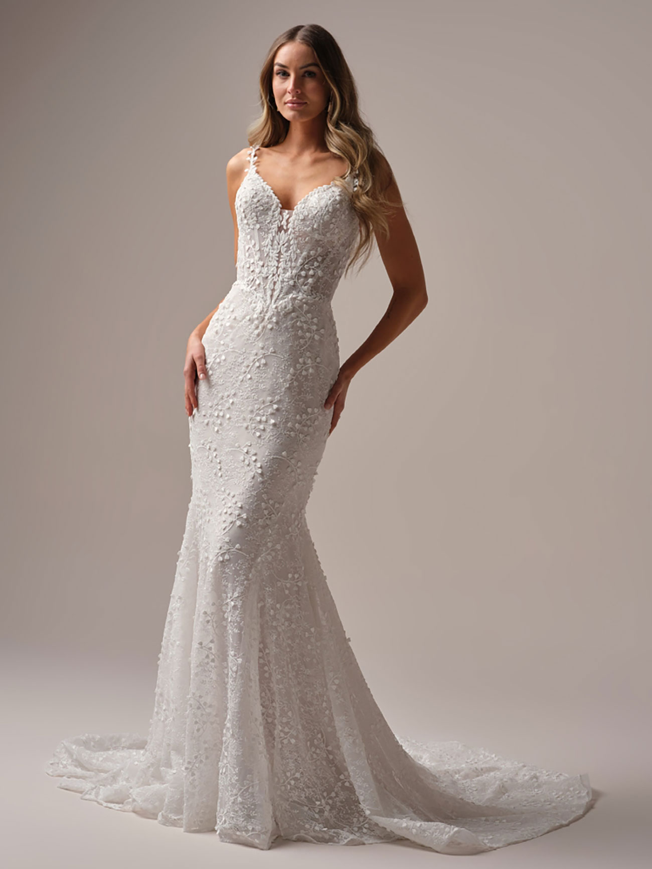 Among the latest arrivals is Dublin by Sottero & Midgley – an ethereal beaded lace illusion gown with a basque waist – alongside Kincaid, a beaded satin ballgown complete with a thigh-high slit and effortless sophistication. For timeless romance, there’s Ruby by Rebecca Ingram, featuring cottagecore-inspired floral lace and swish-worthy skirts made for dancing, as well as Kendall, a striking design with luxe ruching and printed organza that pairs classic romance with a contemporary edge.