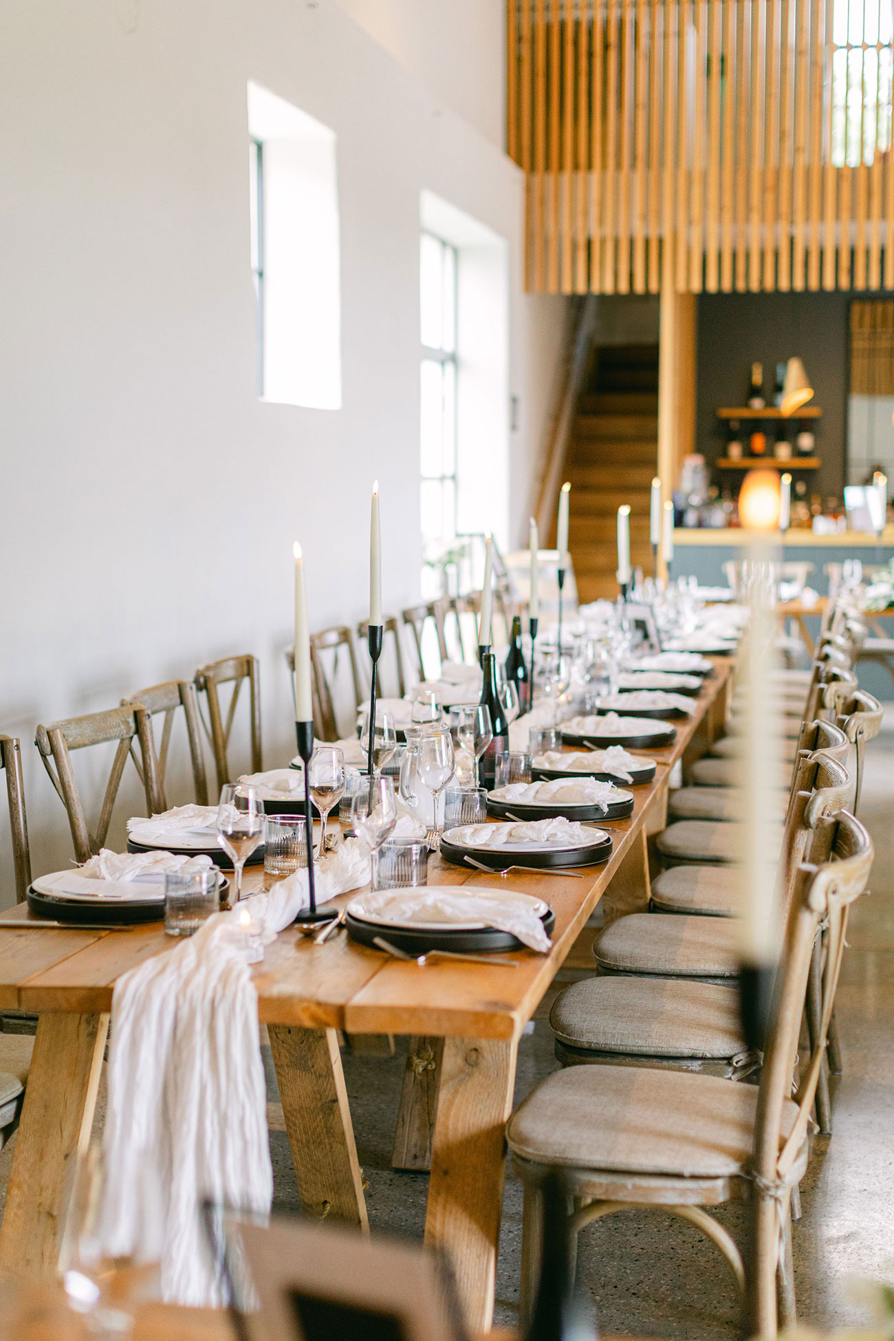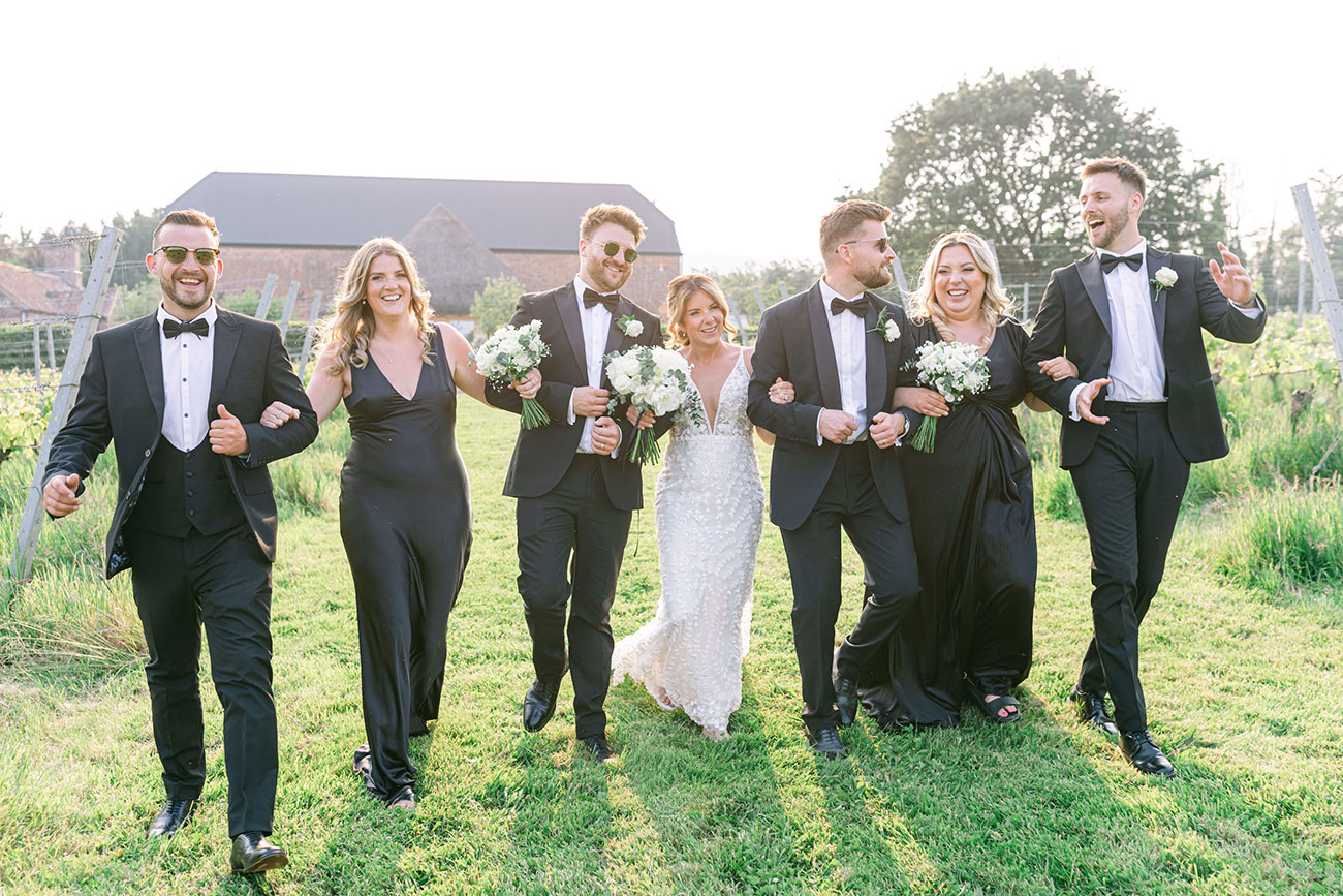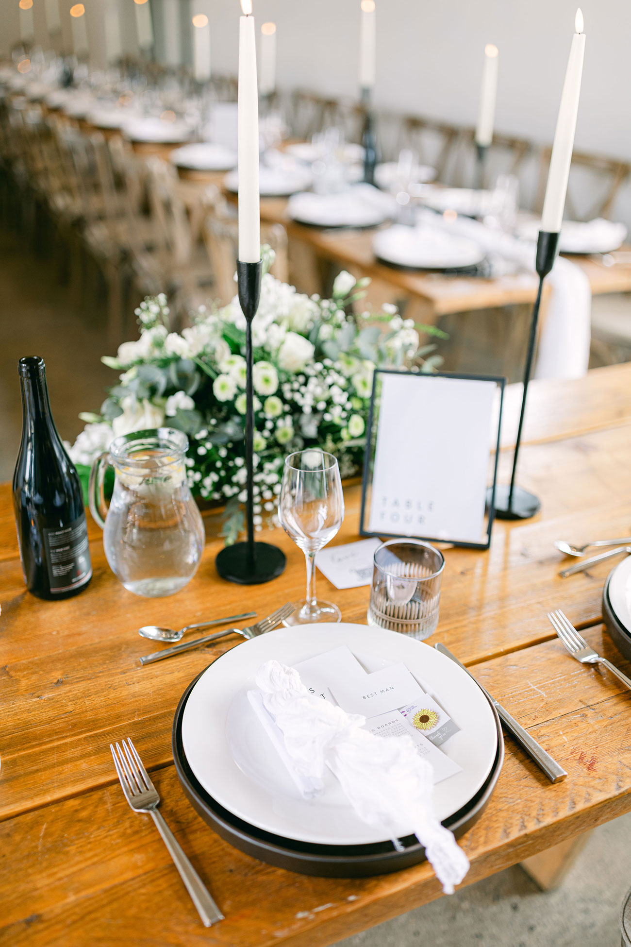 As soon as the couple set eyes on the rustic-luxe aesthetic of Brickhouse Vineyard, they knew it would be the perfect backdrop for their wedding day. Deciding on a minimal black-and-white colour scheme, Guy and his groomsmen opted for timeless black-tie, while the bridesmaids wore sleek black gowns. The contemporary monochrome styling carried throughout the tablescapes, which were dressed with crisp white linens and chic black candleholders and charger plates.