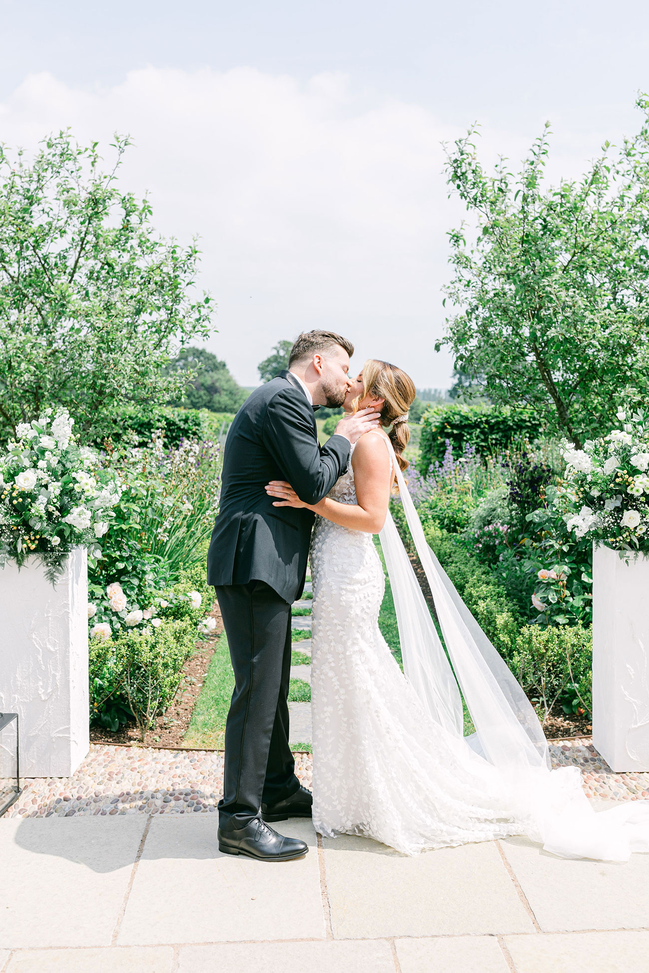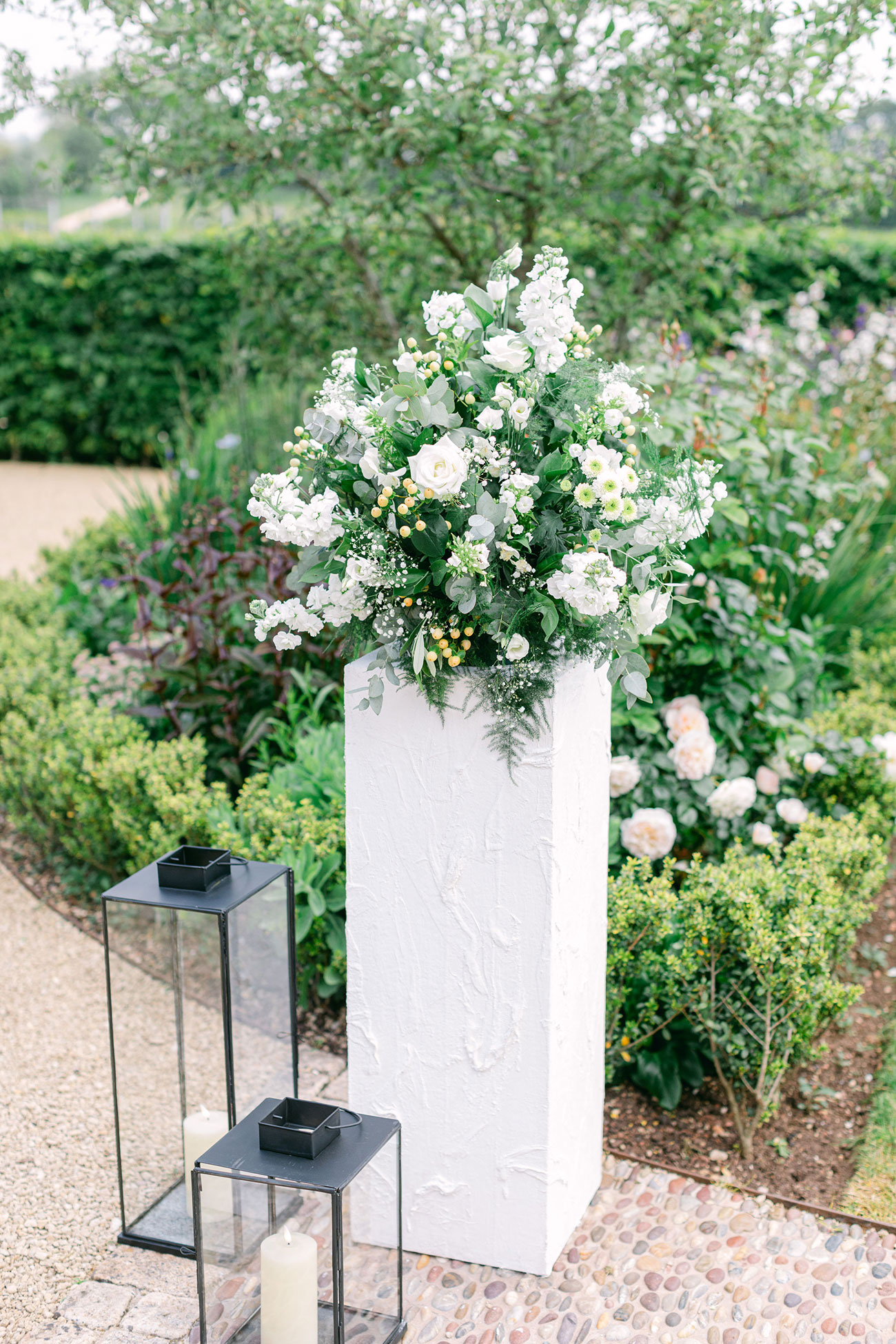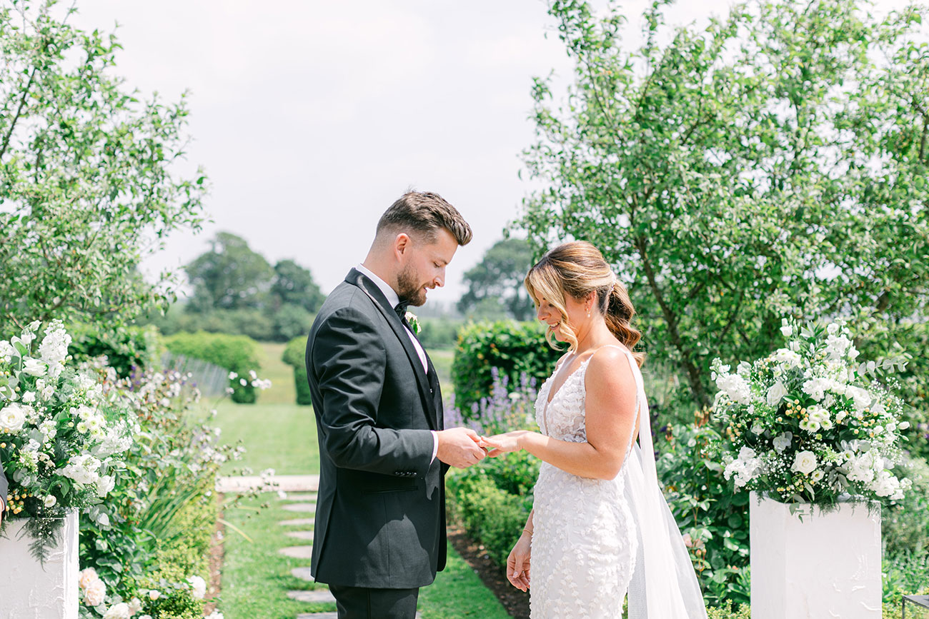“We opted for an outdoor wedding,” says Leanne, revealing that the venue’s flowers and scenic spaces really stood out to them. Walking down the al fresco aisle in a textured lace gown that epitomised modern romance, Leanne and Guy took their vows surrounded by arrangements of white flowers and lush foliage.