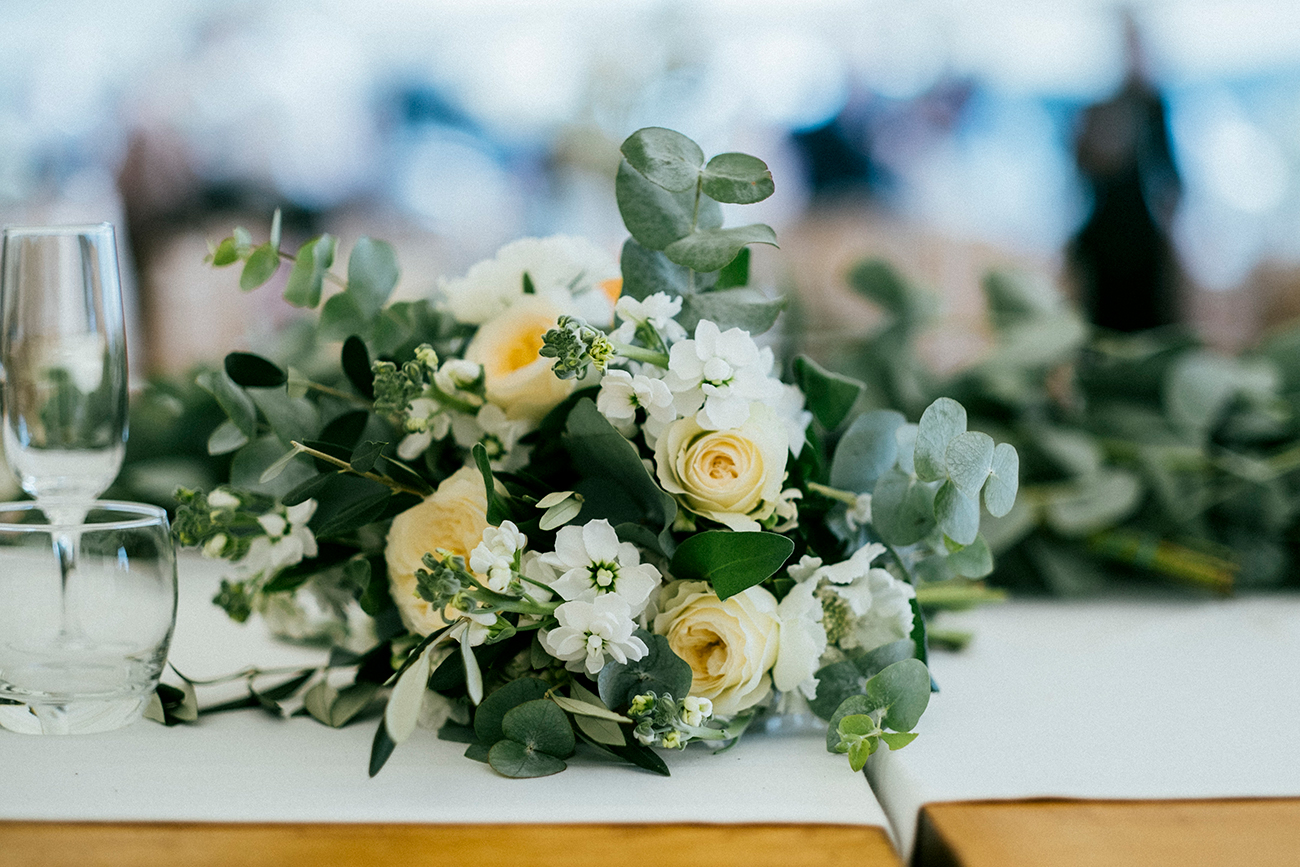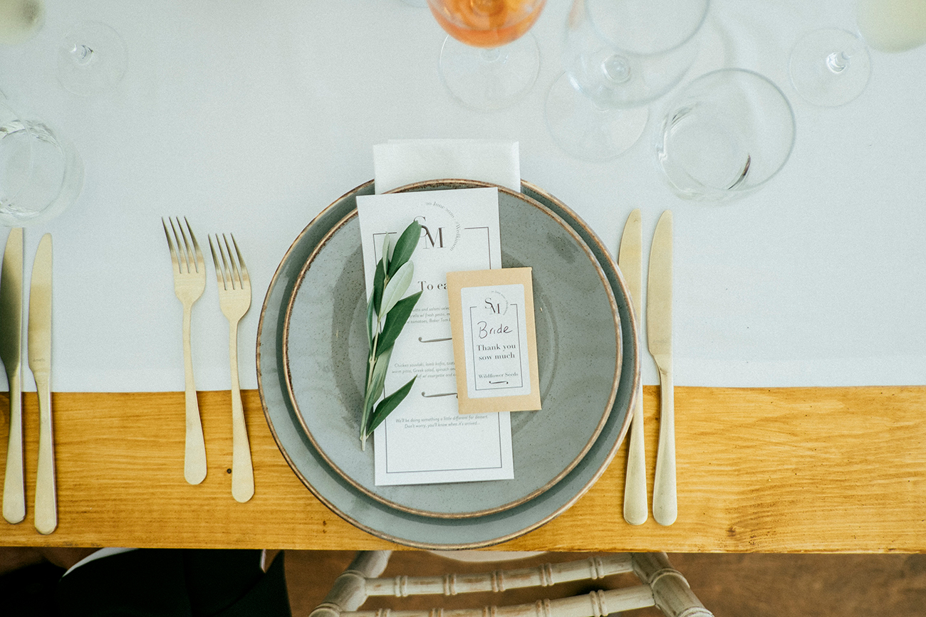 Fashion stylist Morwenna jumped at the chance to design the day from scratch, using the floristry as the starting point. “I wanted a minimal, clean colour palette so I chose white flowers and green foliage,” she says. “I love the impact of foliage with the warm wood of the rustic tables and whites of the marquee, which was filled with the scent from the stocks and roses. When the sun came out, we opened the marquee windows to take in the sea views.”