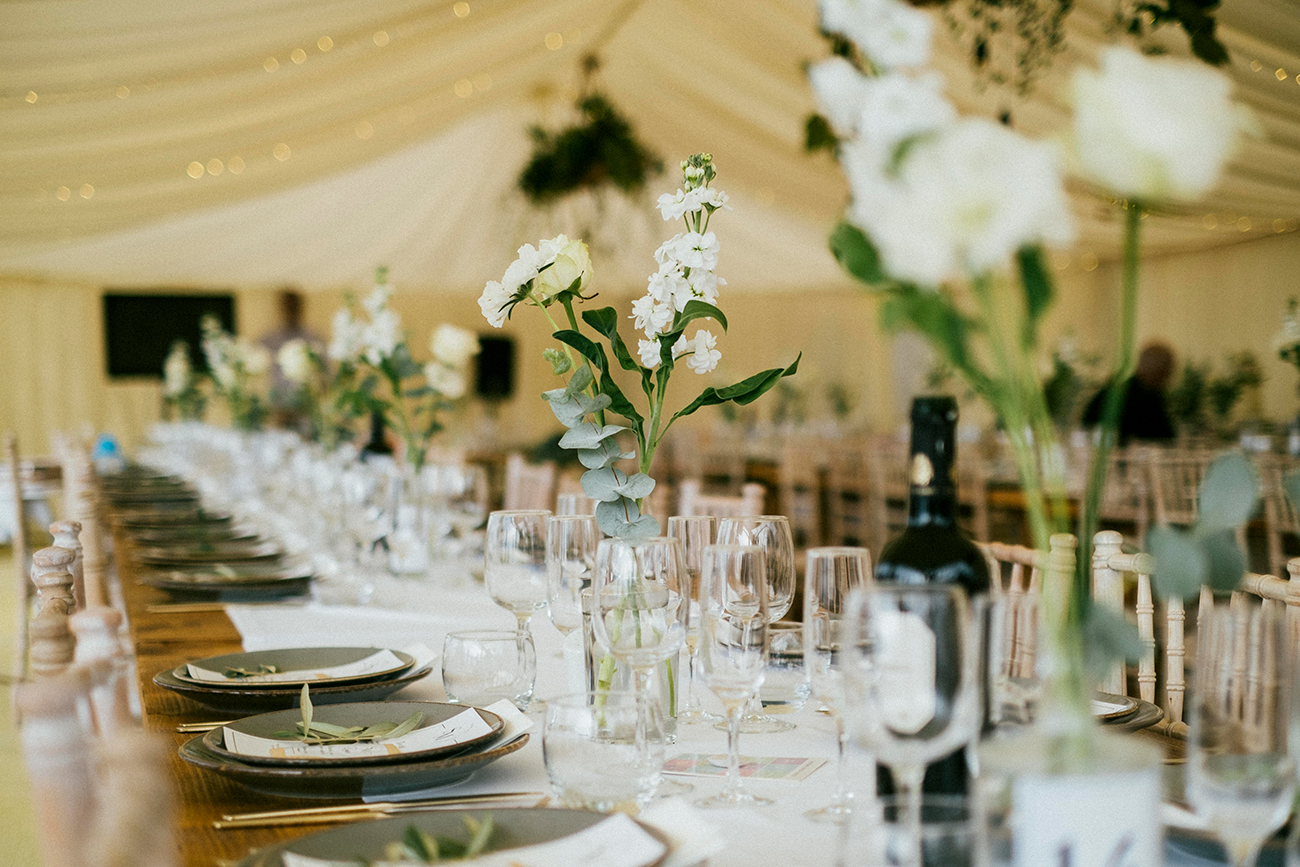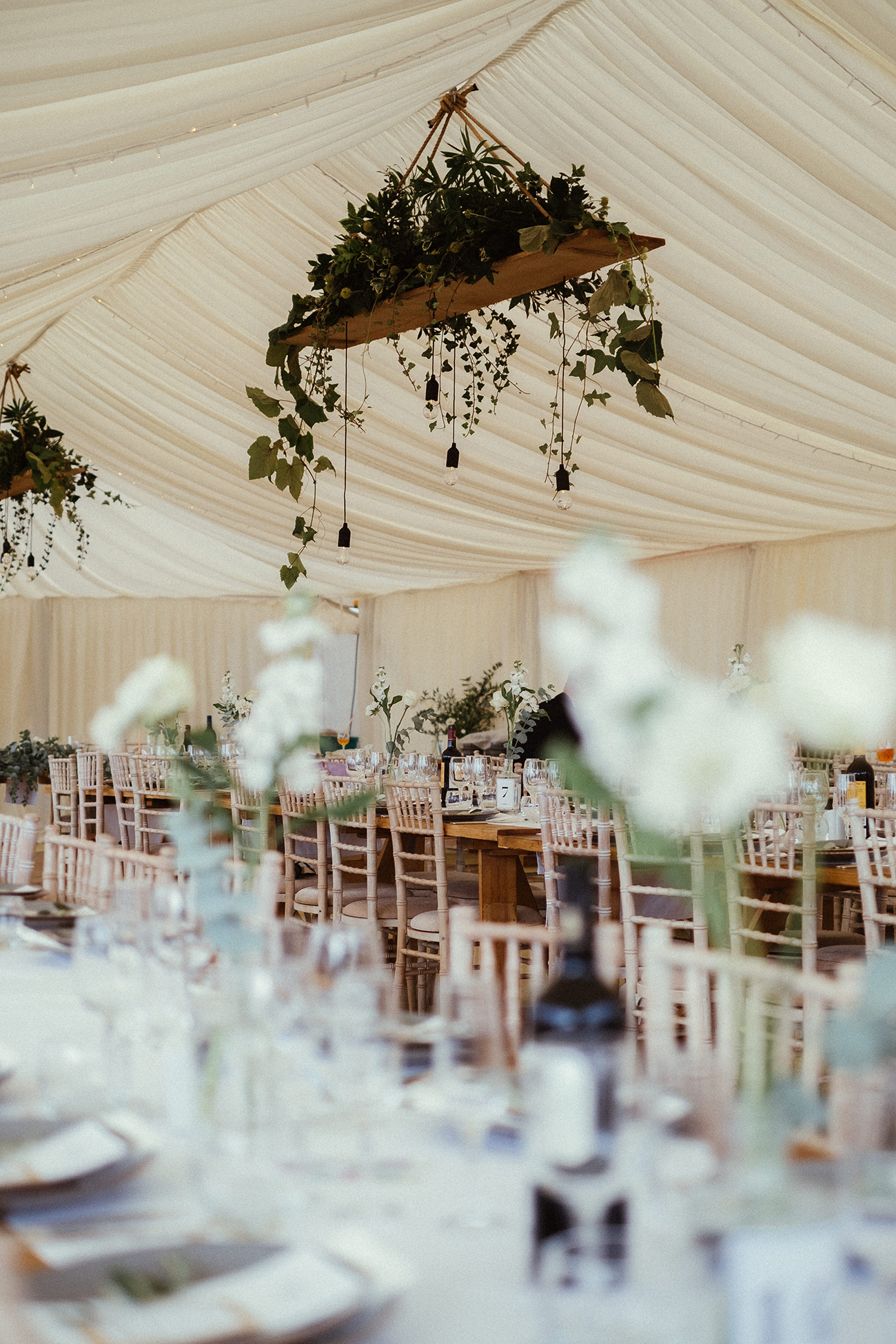 Alongside her mum and godmother, Morwenna dressed the marquee with a gorgeous mix of flowers and lighting, weaving trailing foliage around the trio of beams while scattering candles throughout, fairy lights in the roof and bulbs in the beams for heightened ambience.