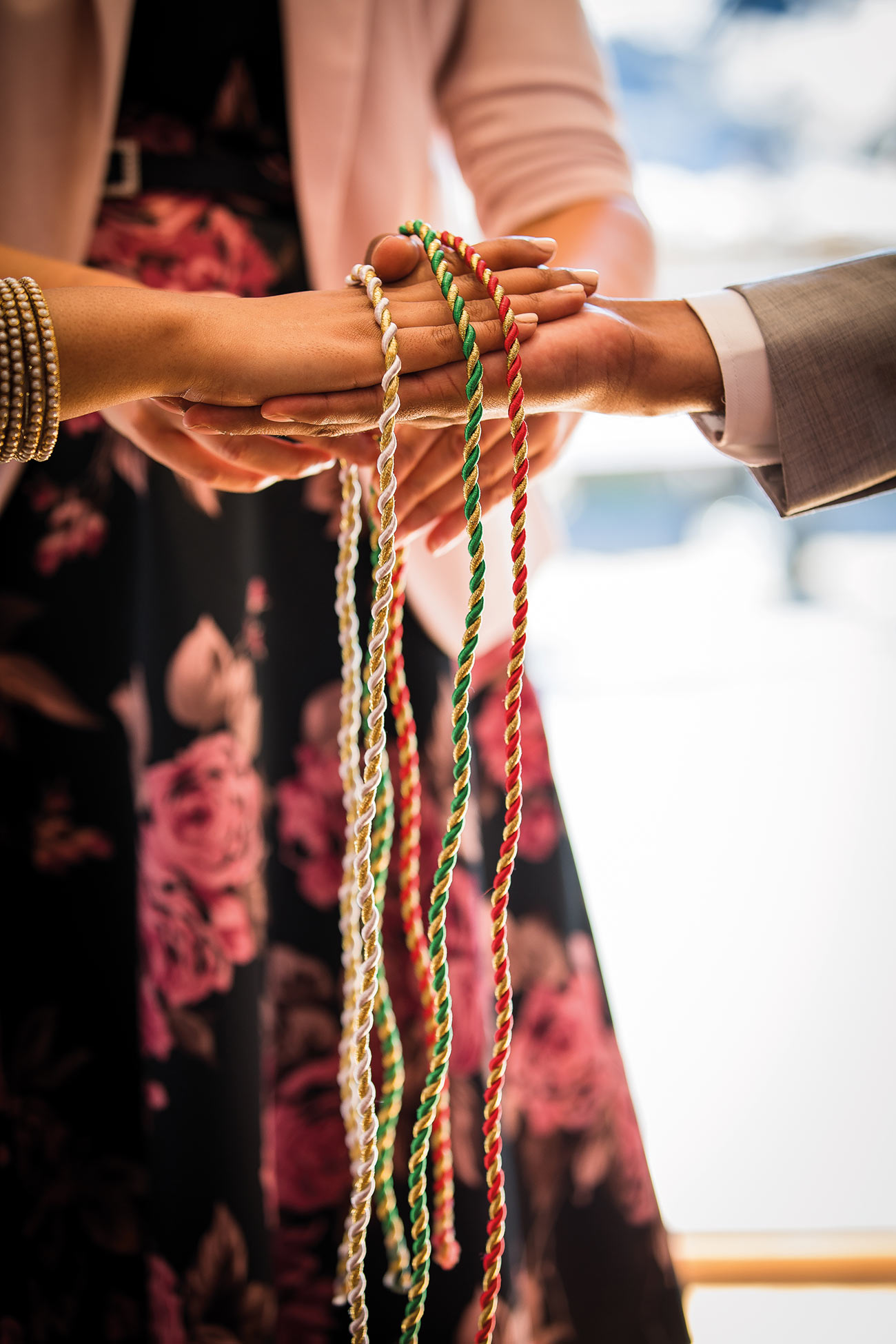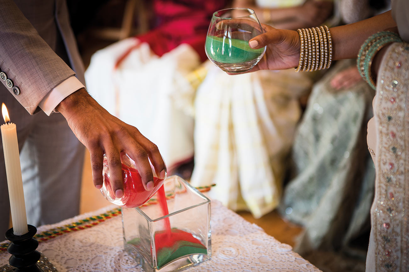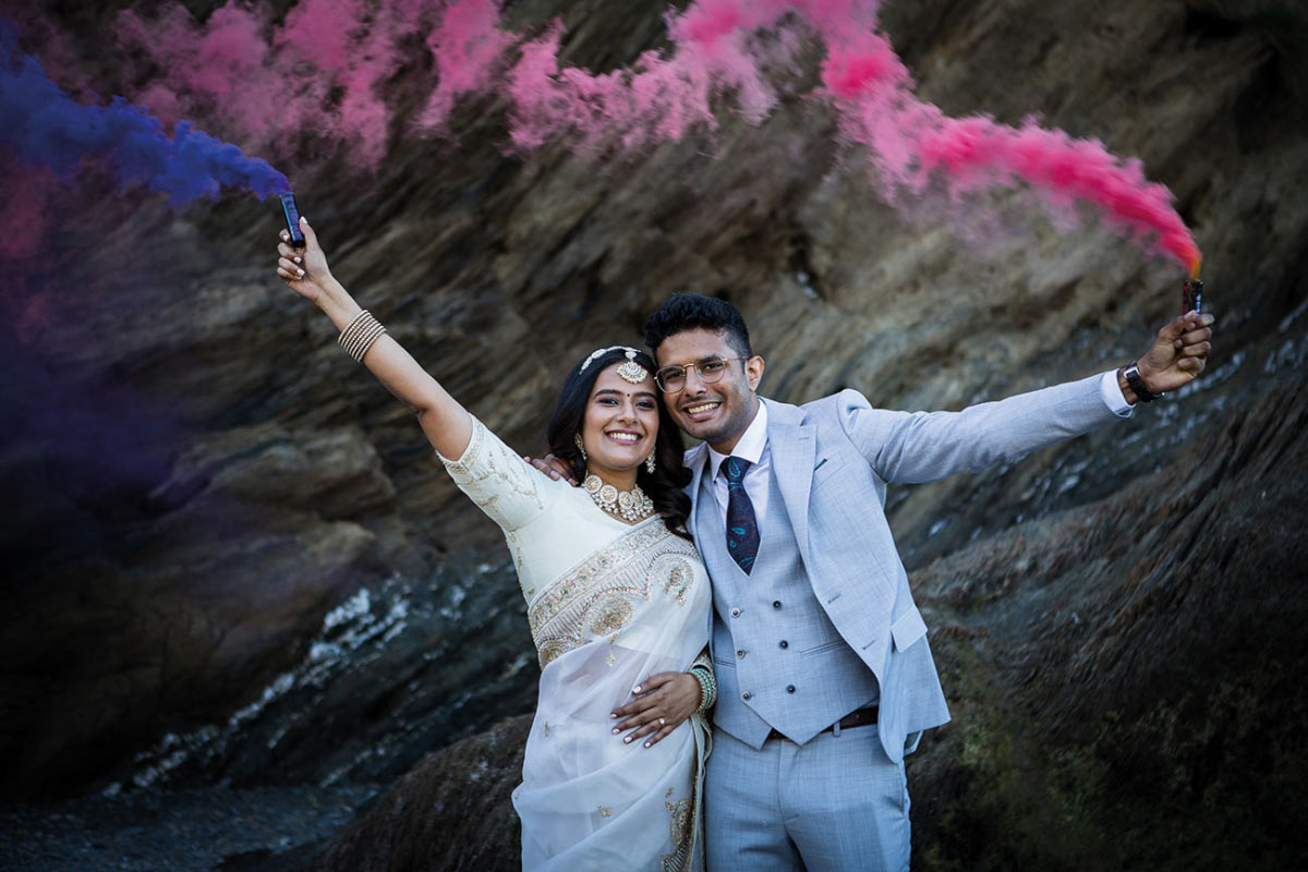 With the seascape beyond and the sunlight streaming into the room, the couple took their vows. “We had a beautiful ceremony. Everyone was so happy around us, we were ecstatic,” says Manasa of the ceremonials that included a personal hand-fasting and a unity sand ceremony. “We all walked along the beach after the ceremony, just dancing and taking pictures.” Colourful smoke bombs carried the palette of the celebrations and created some beautiful photo opportunities, before their guests sat down for a veritable feast.