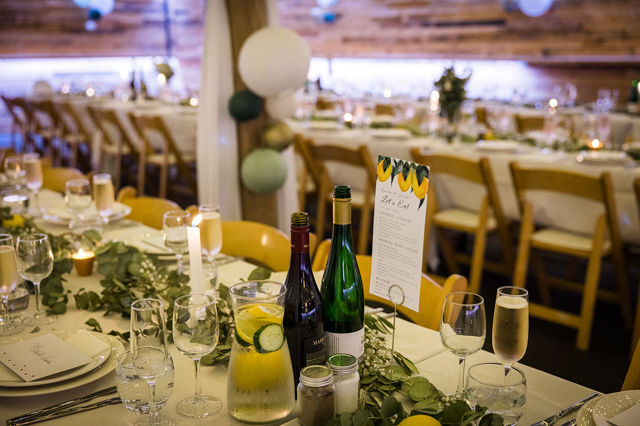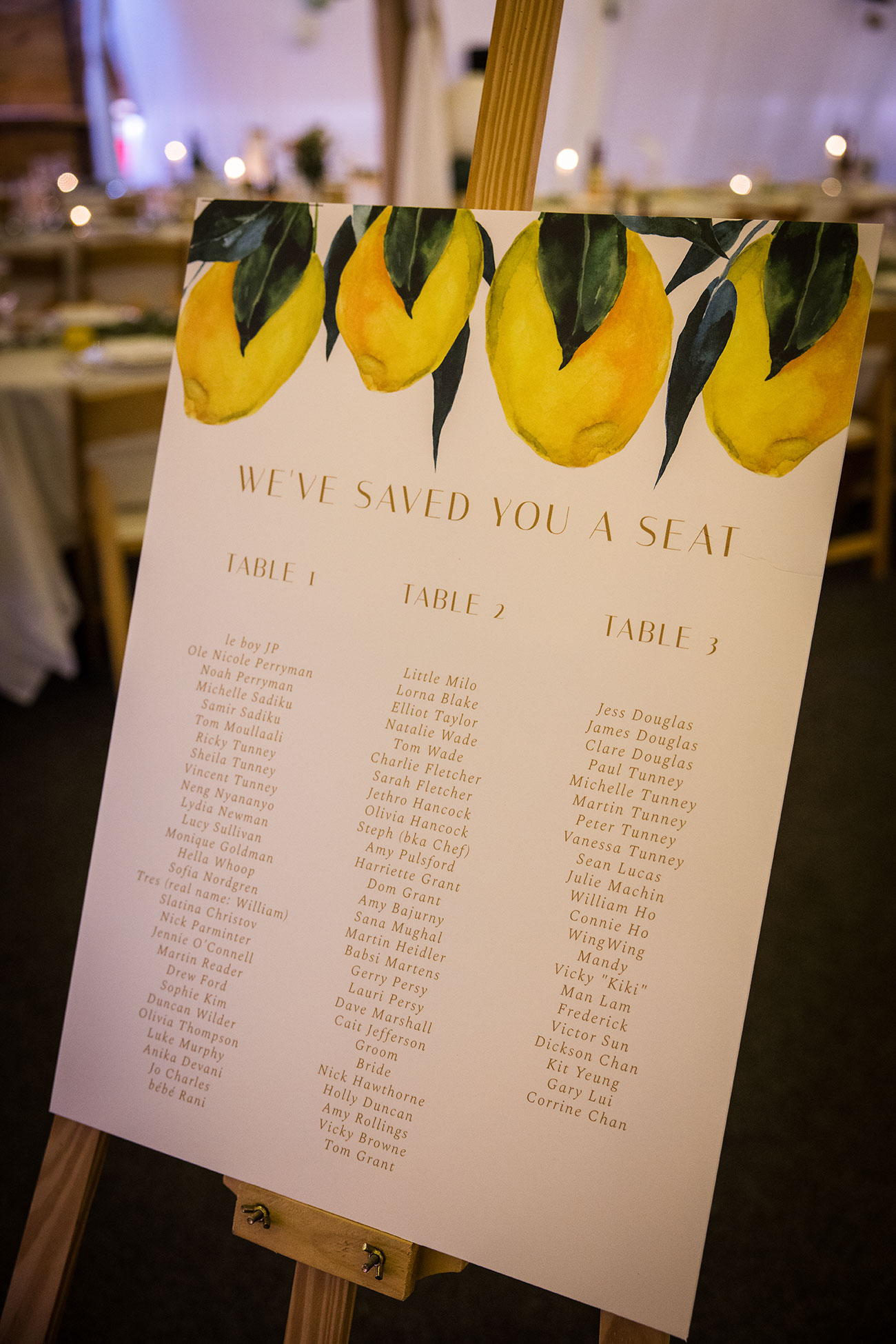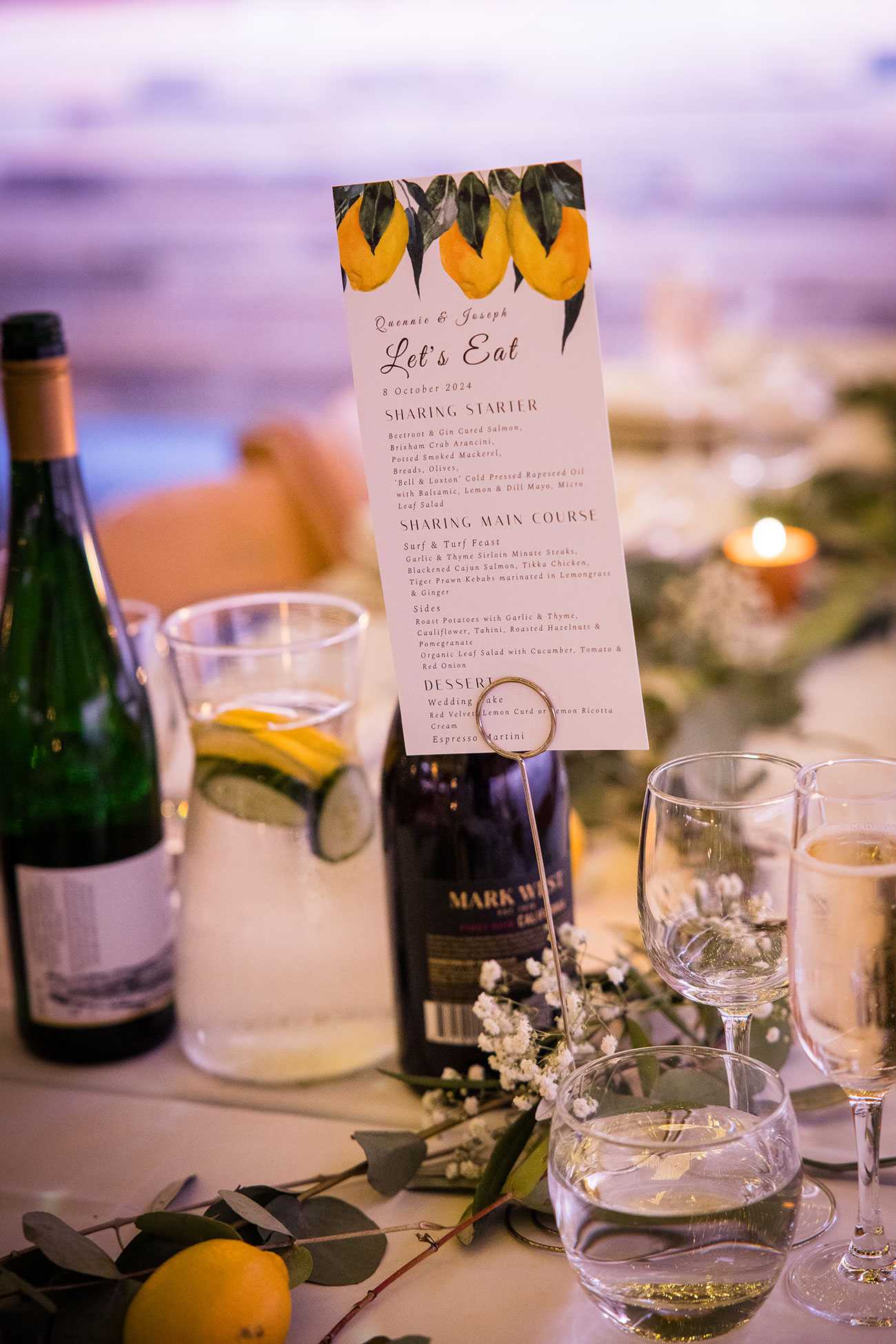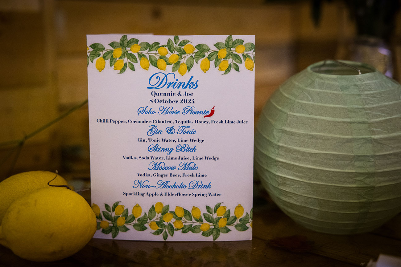 Their theme, Sicily in Devon, was woven throughout every detail, with lemons taking centre stage in the décor. The zesty fruits nestled among foliage and gypsophila on the tables, featured in the stationery, and even adorned the wedding cake. “Joe was adamant about having a lemon ricotta cheesecake flavour,” laughs Quennie. “But Cora of Cantel Cakes absolutely nailed it! Our guests loved it.”