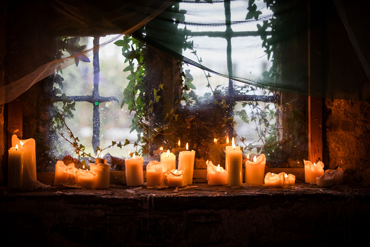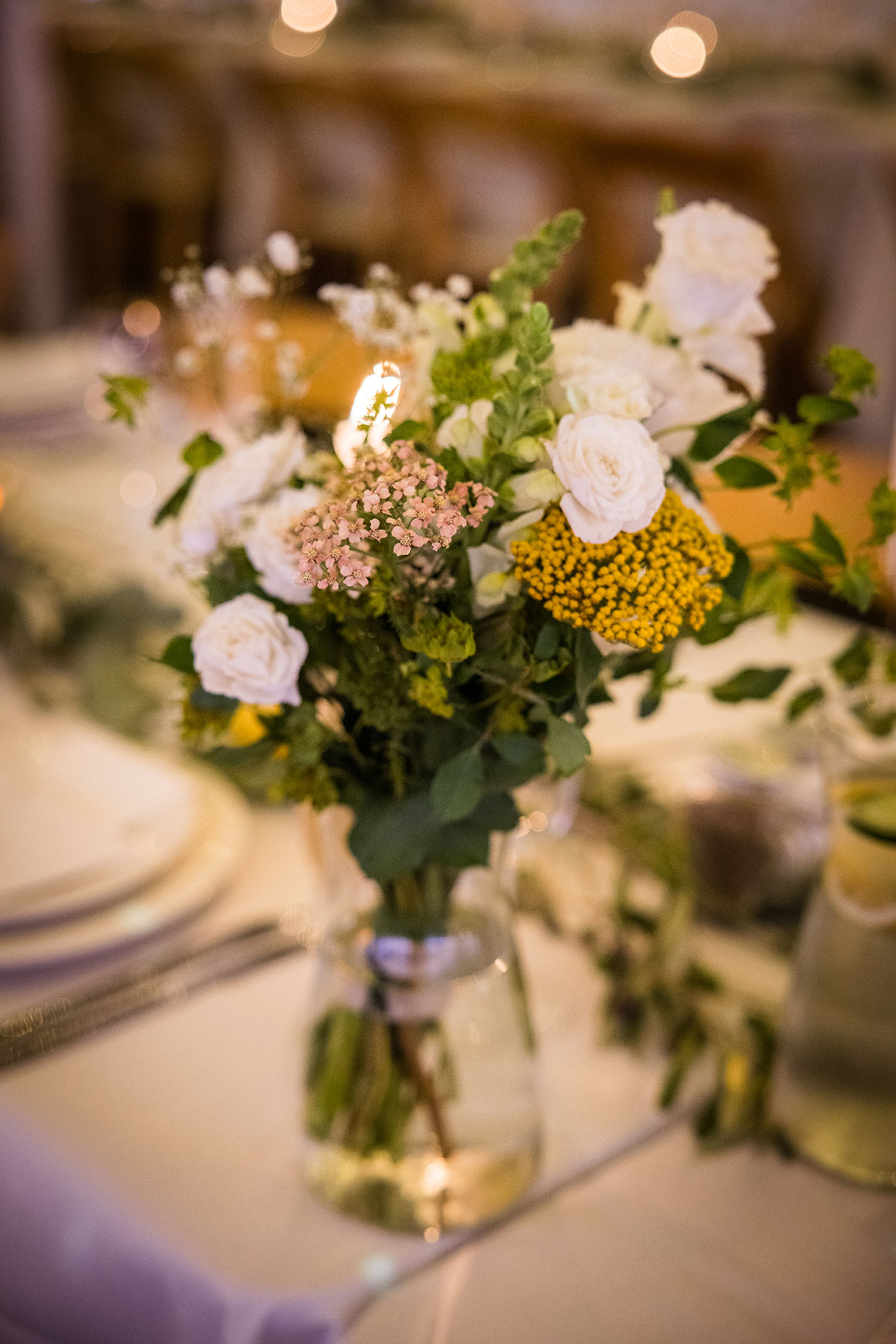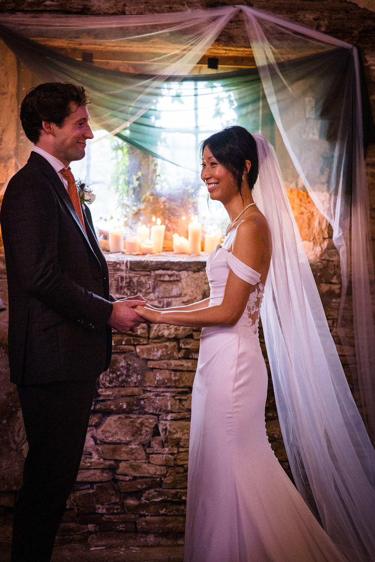 A heavy downpour meant the couple had to move their ceremony indoors from beneath the oak tree to the estate’s stone chapel, which was candlelit and adorned with fairy lights, making for an atmospheric setting. Quennie’s father walking her down the aisle and Joe’s reaction to seeing her were moments she’ll never forget. “Exchanging our personal vows made the ceremony uniquely ours,” she says. “Though we both got nervous and stumbled over some of the words!”