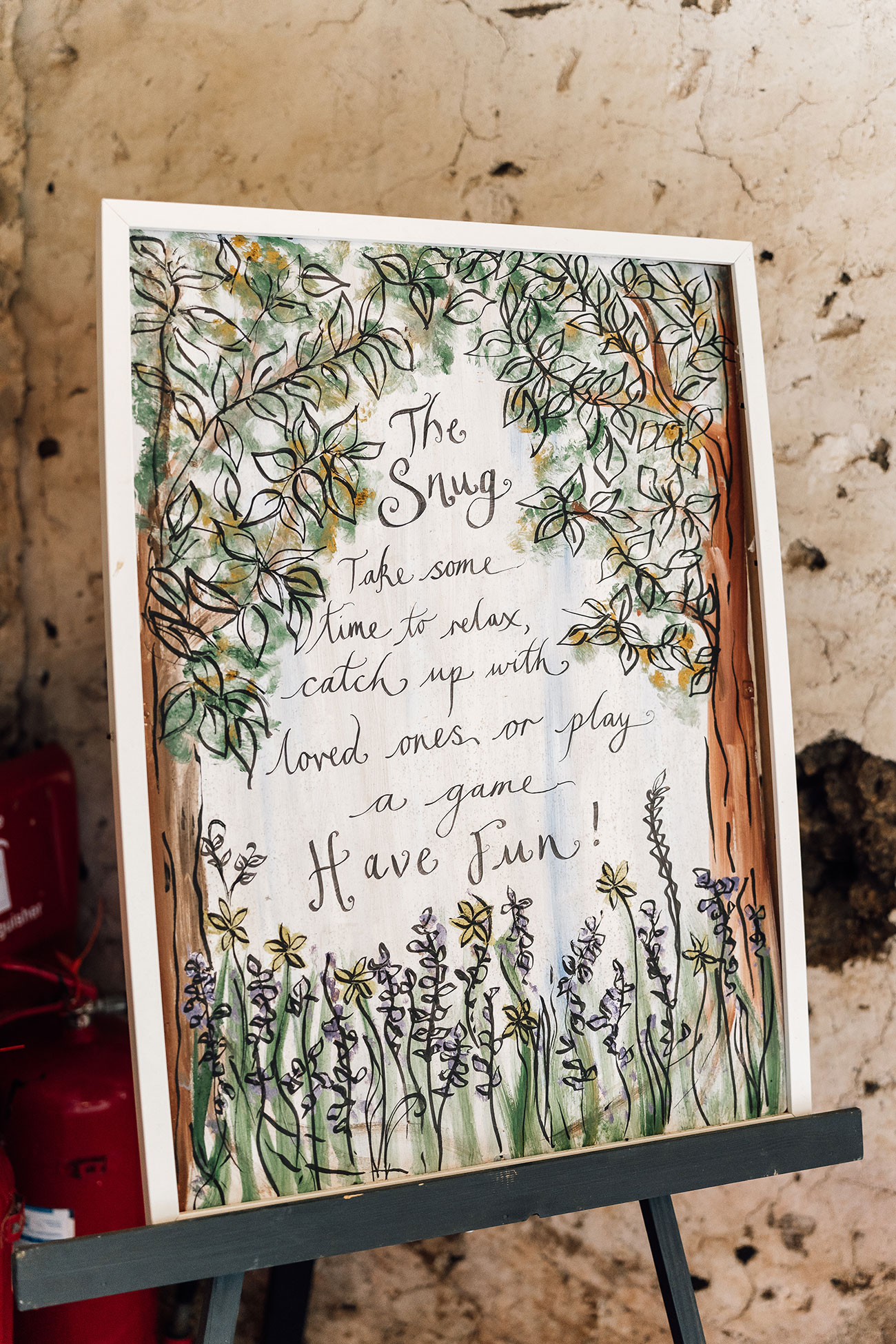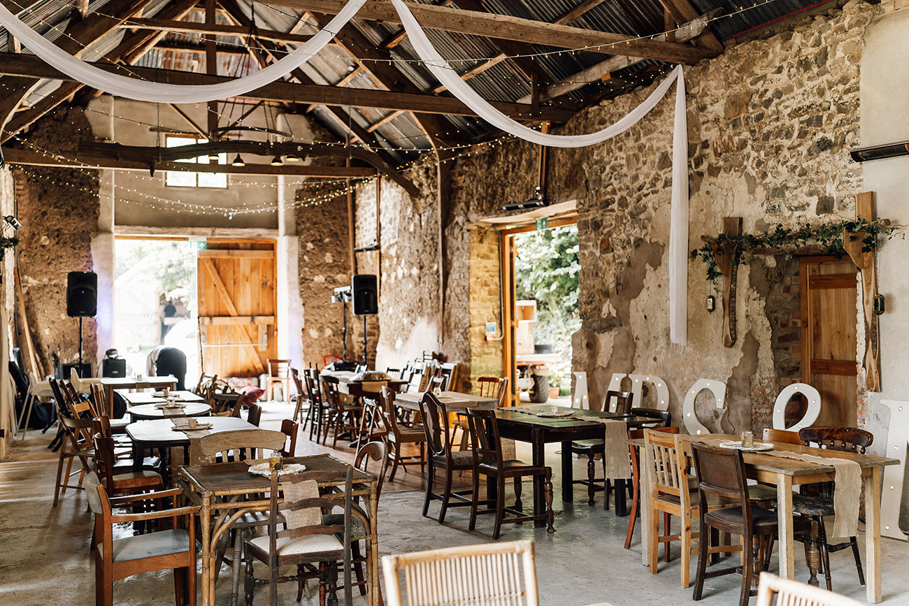 After the ceremony, the newlyweds were whisked away on haybales in a trailer hitched to a friend’s Land Rover before gathering in the venue’s Magic Circle for confetti, drinks and canapés. Guests offered informal speeches and played lawn games to the sound of live jazz from Jess’s band.