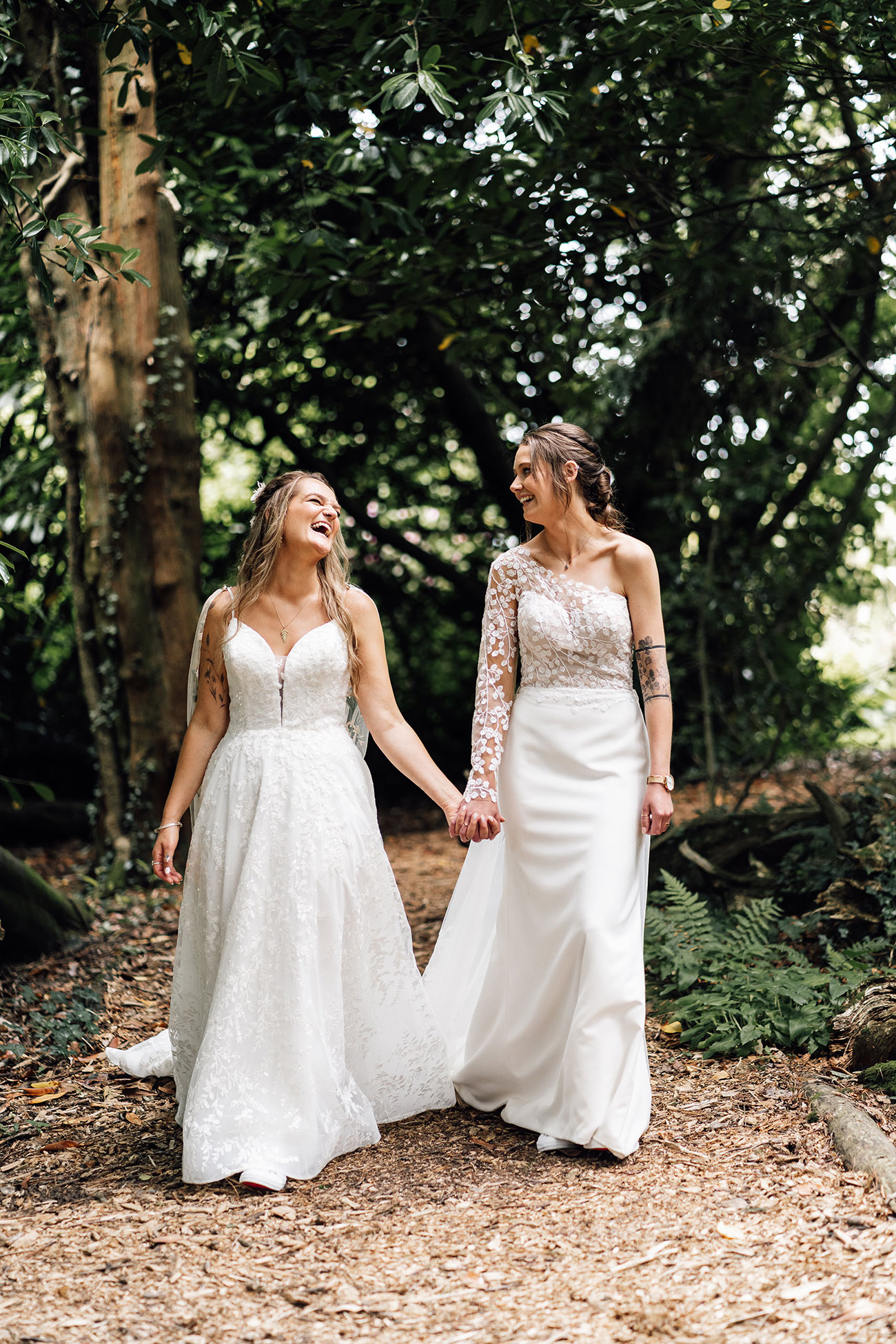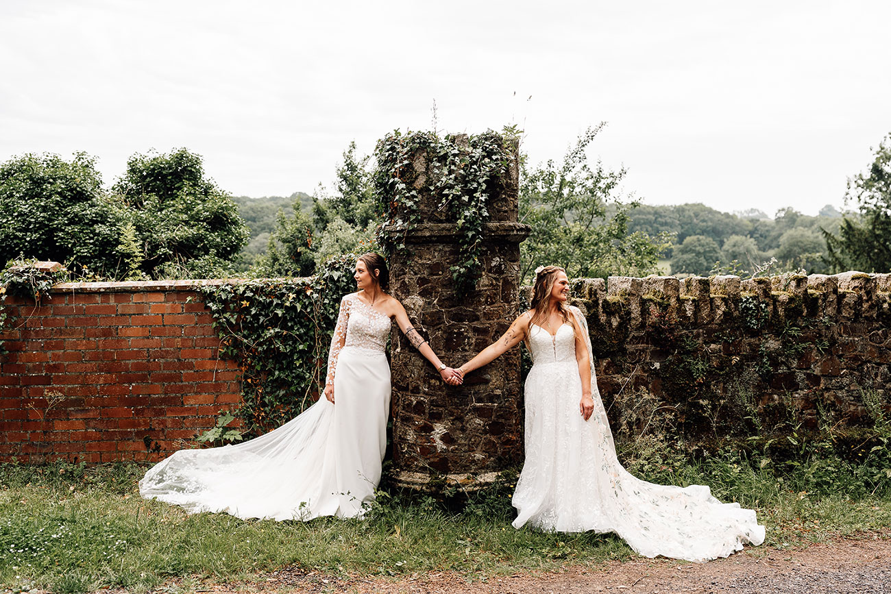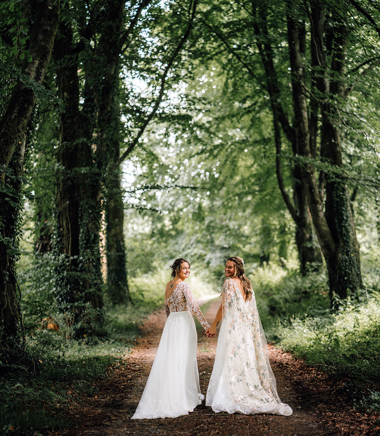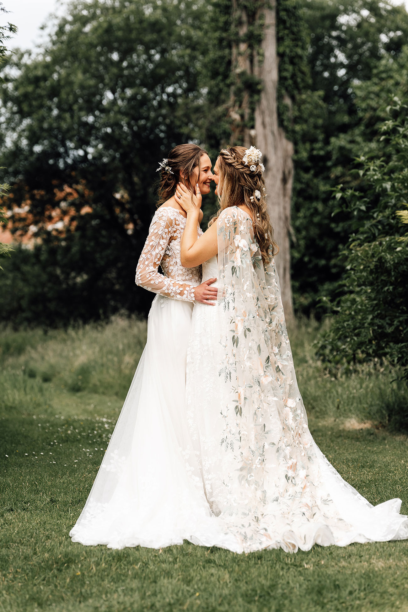 Their looks echoed the theme beautifully. Holly wore a lace bodice scattered with leafy motifs, while Jess paired her lace gown with a dreamy floral cape and blossoms threaded through her hair.
