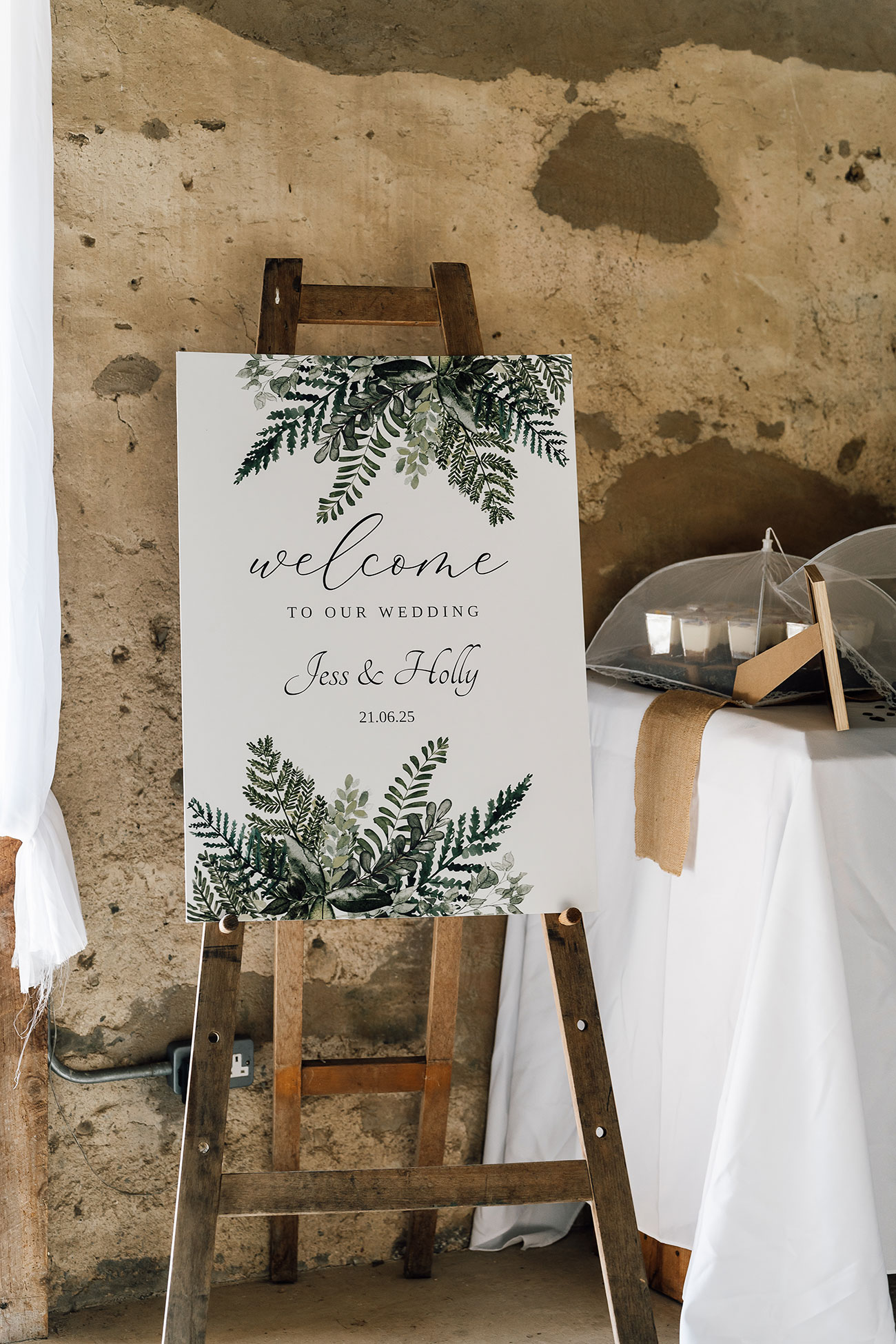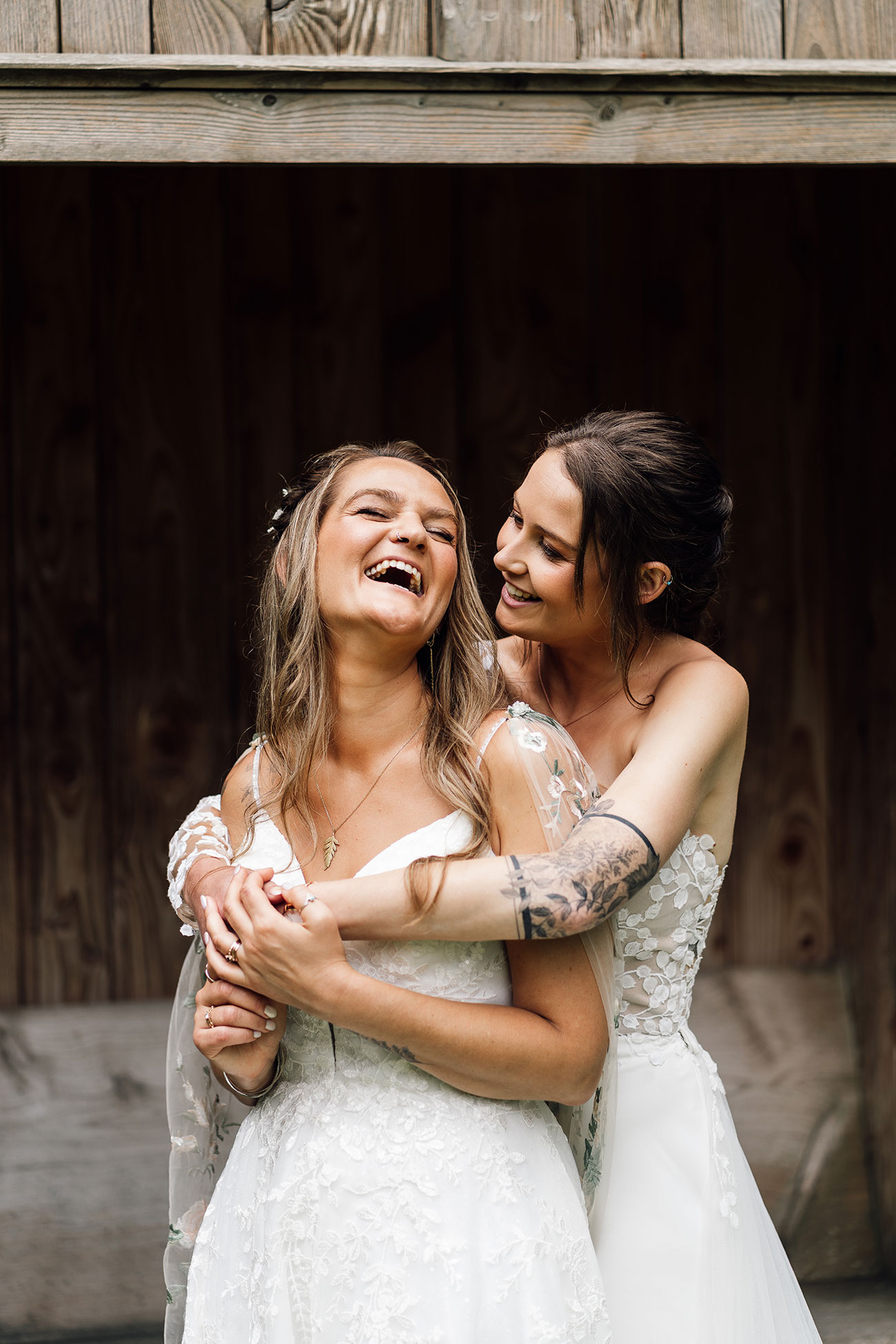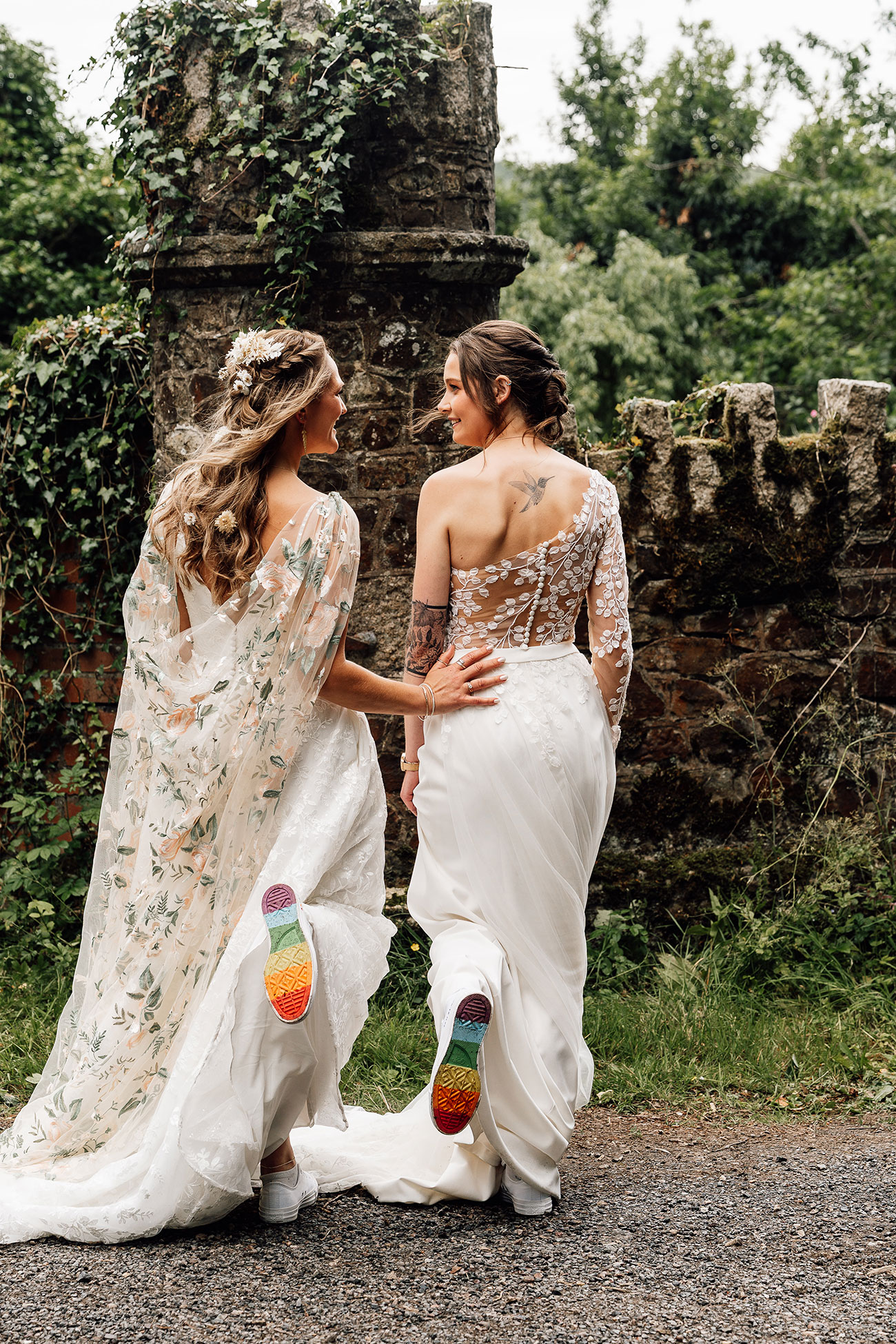 Their looks echoed the theme beautifully. Holly wore a lace bodice scattered with leafy motifs, while Jess paired her lace gown with a dreamy floral cape and blossoms threaded through her hair.