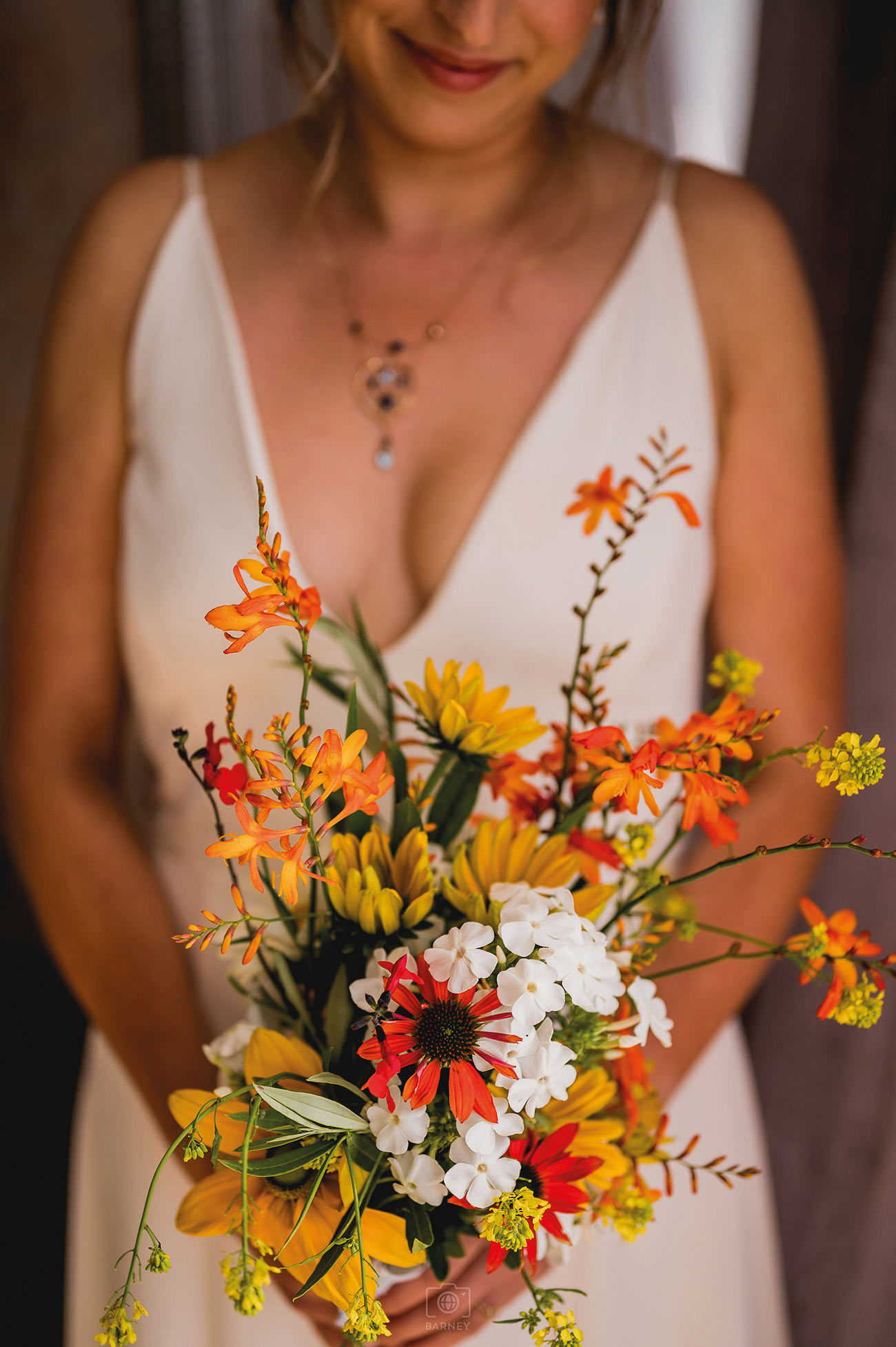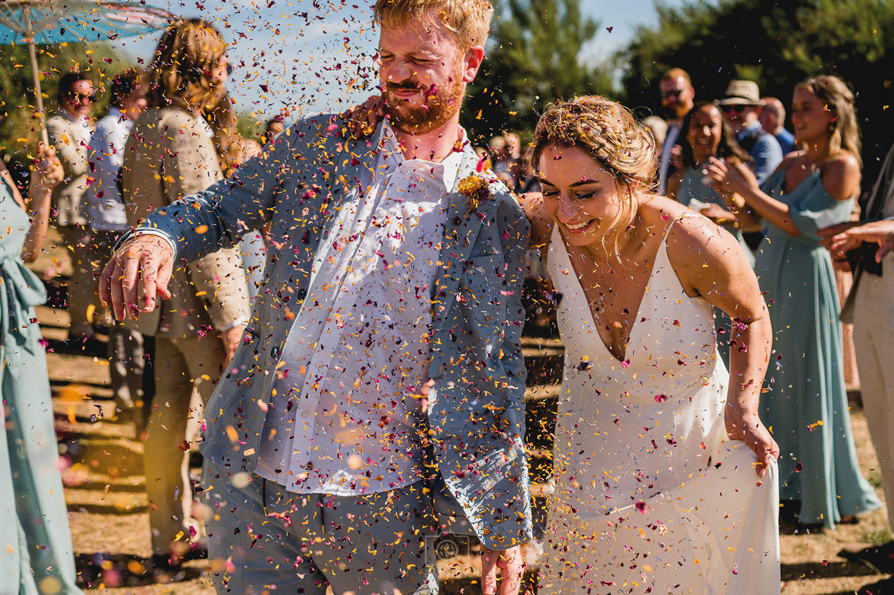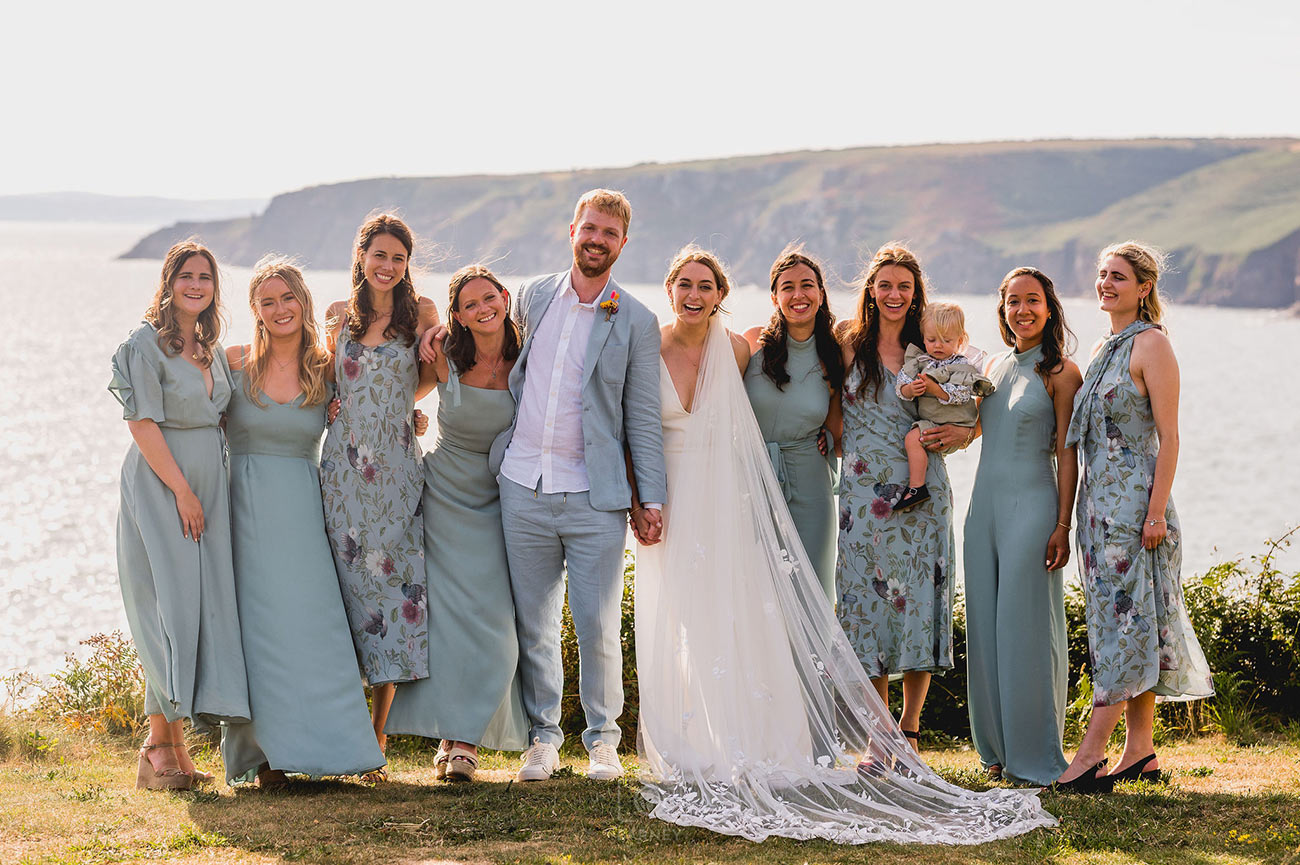 Inspired by the colours on Cornish coastal walks, their chosen palette of mixed bright colours — including greens, pinks, oranges, turquoise and yellows — looked stunning against the ocean backdrop. “We were particularly inspired by native crocosmia, which grows all over the hedgerows of southern Cornwall and pops with vibrant orange tones,” says Saskia. “We asked our guests to dress as brightly and summery as they could, and they really delivered!”