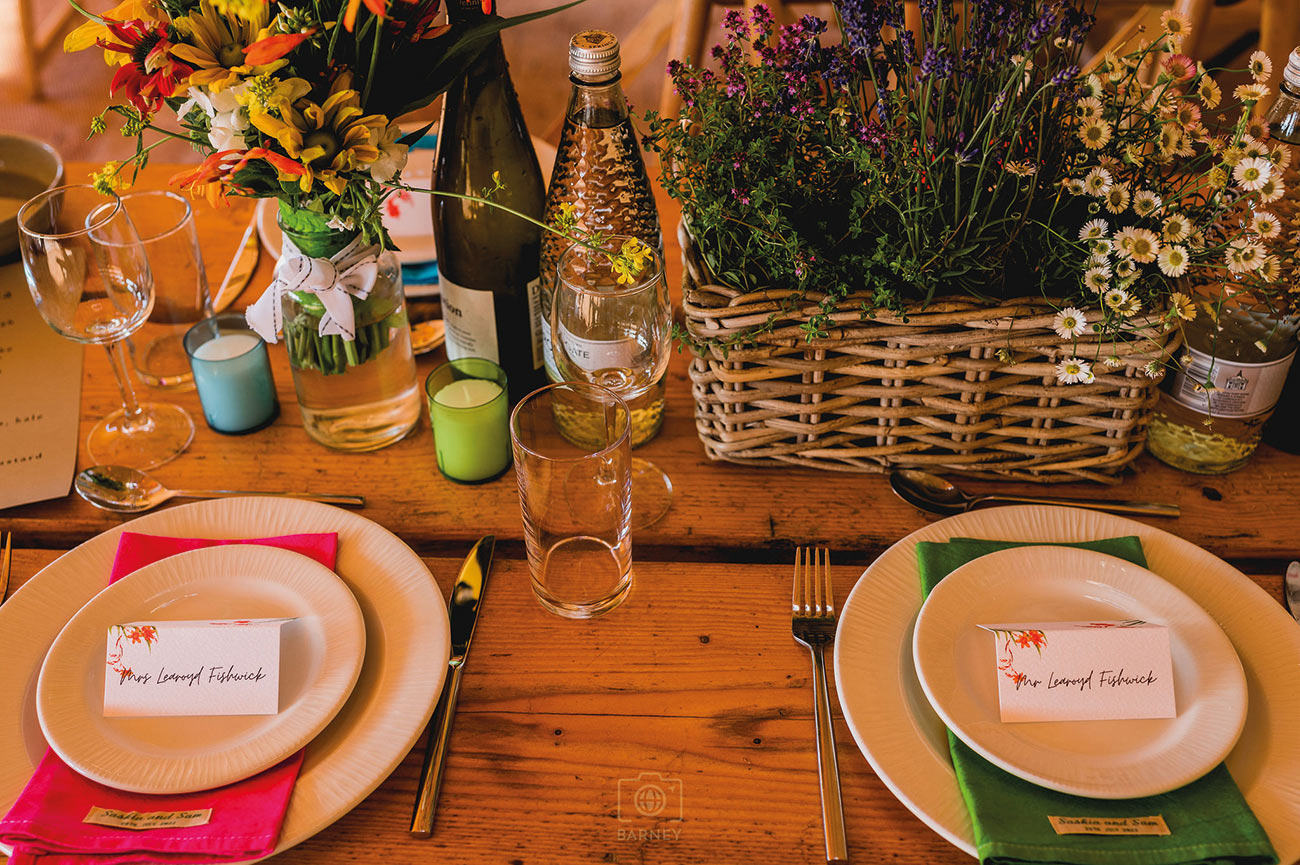 It was a family affair when it came to bringing their vibrant vision to life, with stationery designed by Saskia’s sister, Tatiana, using beautiful paintings of crocosmia, and her godmother, Sarah, handmaking and dyeing 200 napkins to match the multicoloured paper lanterns.