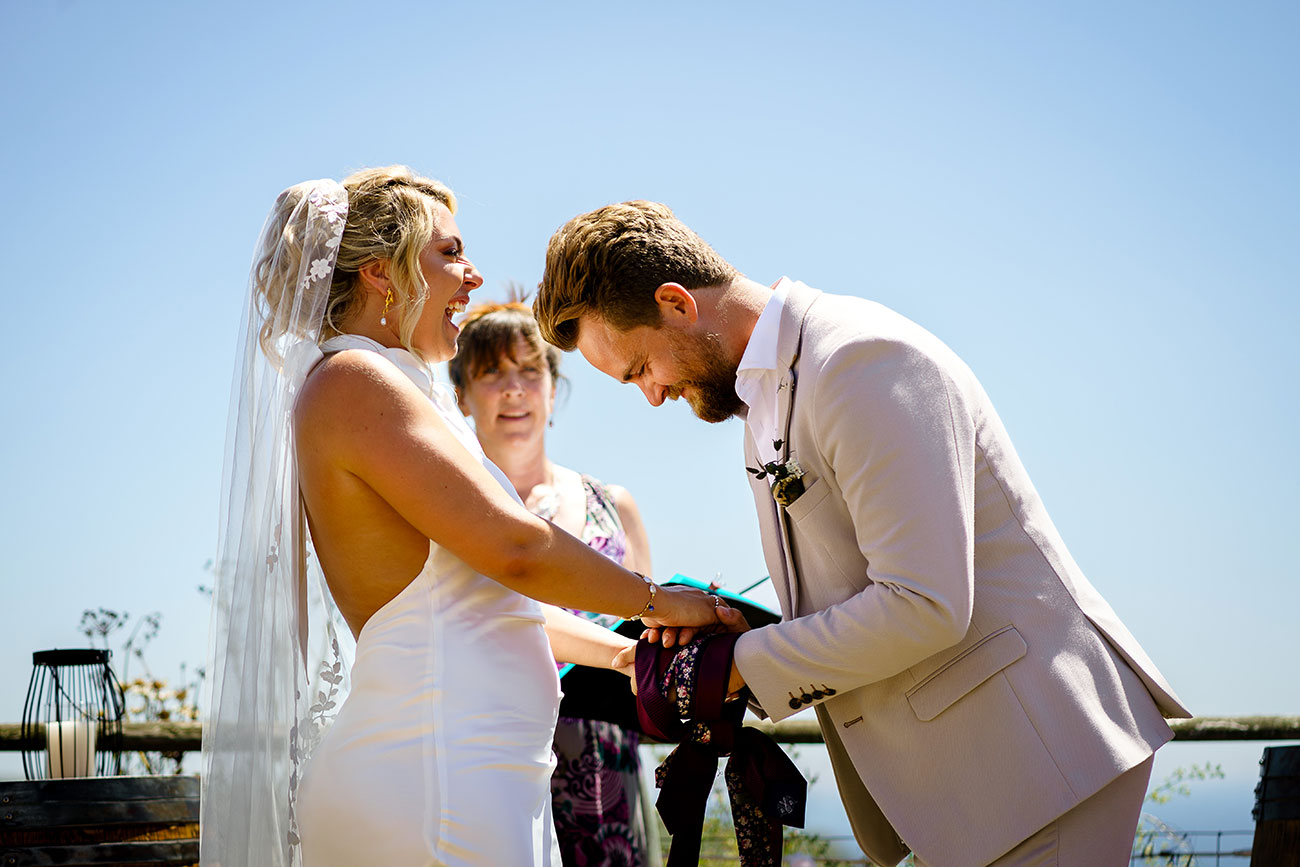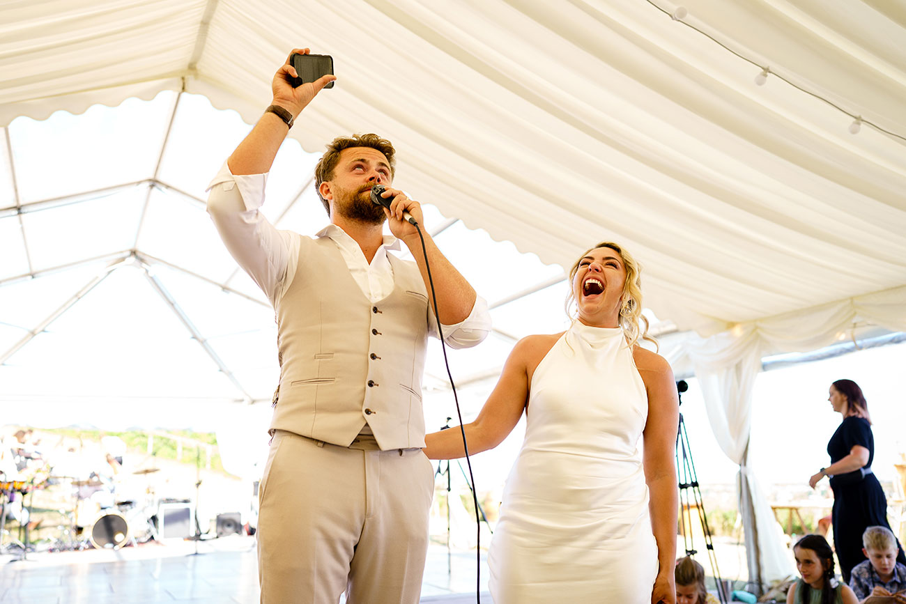 “I walked out with my dad and bridal party and looked out at the sea, everyone I love and Sam standing there all teary. I felt so overwhelmed, excited and nervous,” recalls Murphy. Setting the tone for their entertainment-filled day, the memorable ceremony saw singalongs and an acoustic guitar soundtrack alongside personal vows and a hand tying, while the couple’s dog, Potato, was the ring bearer.