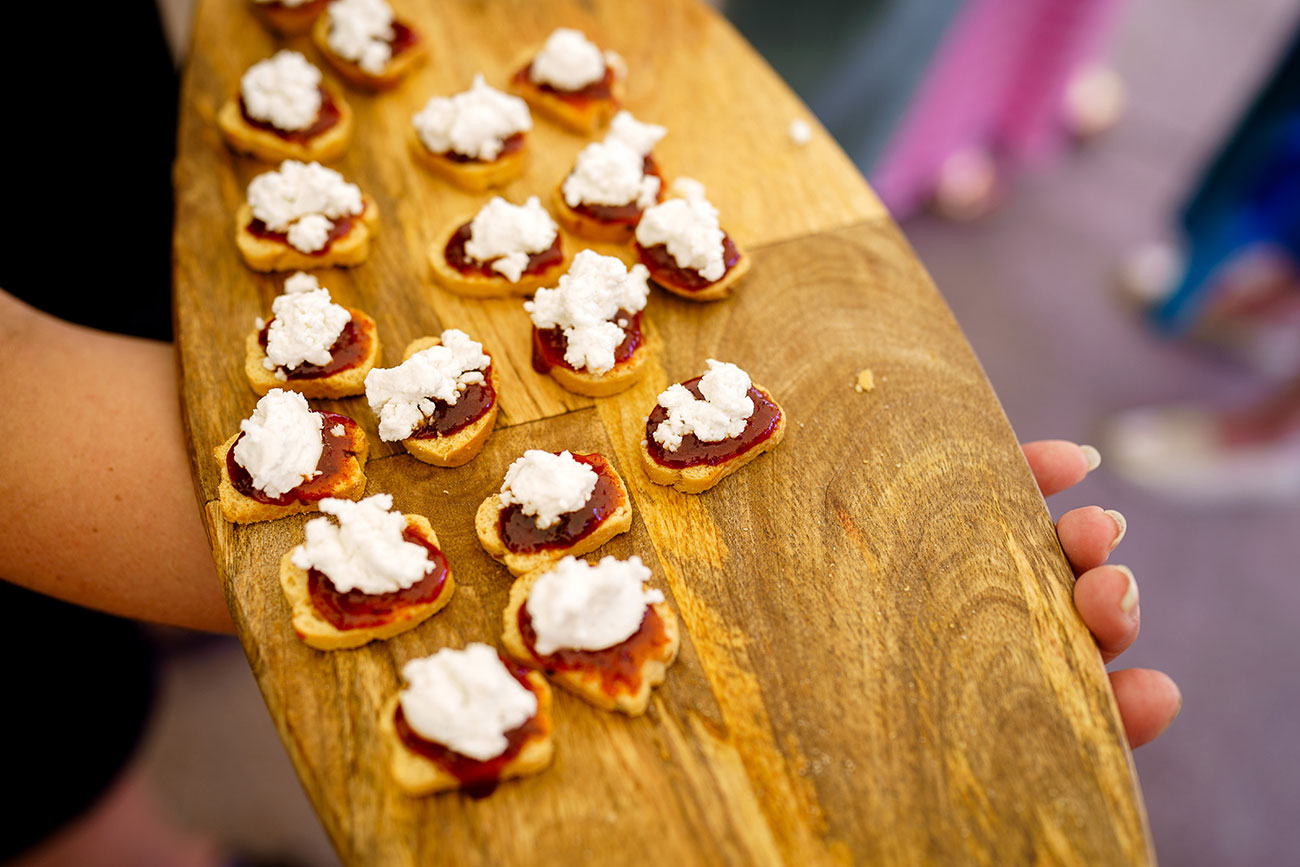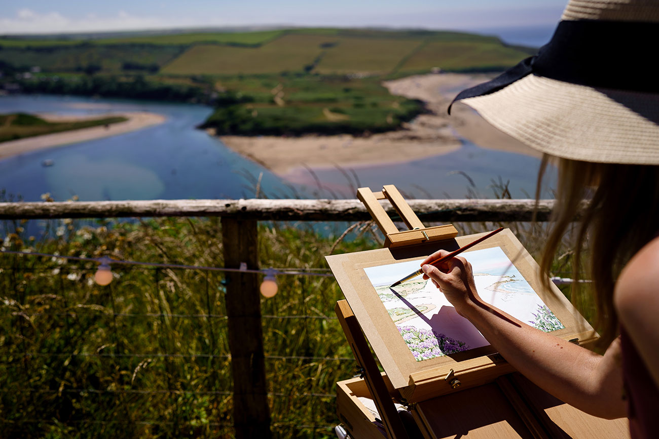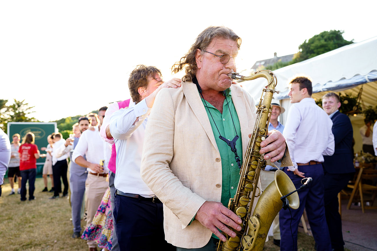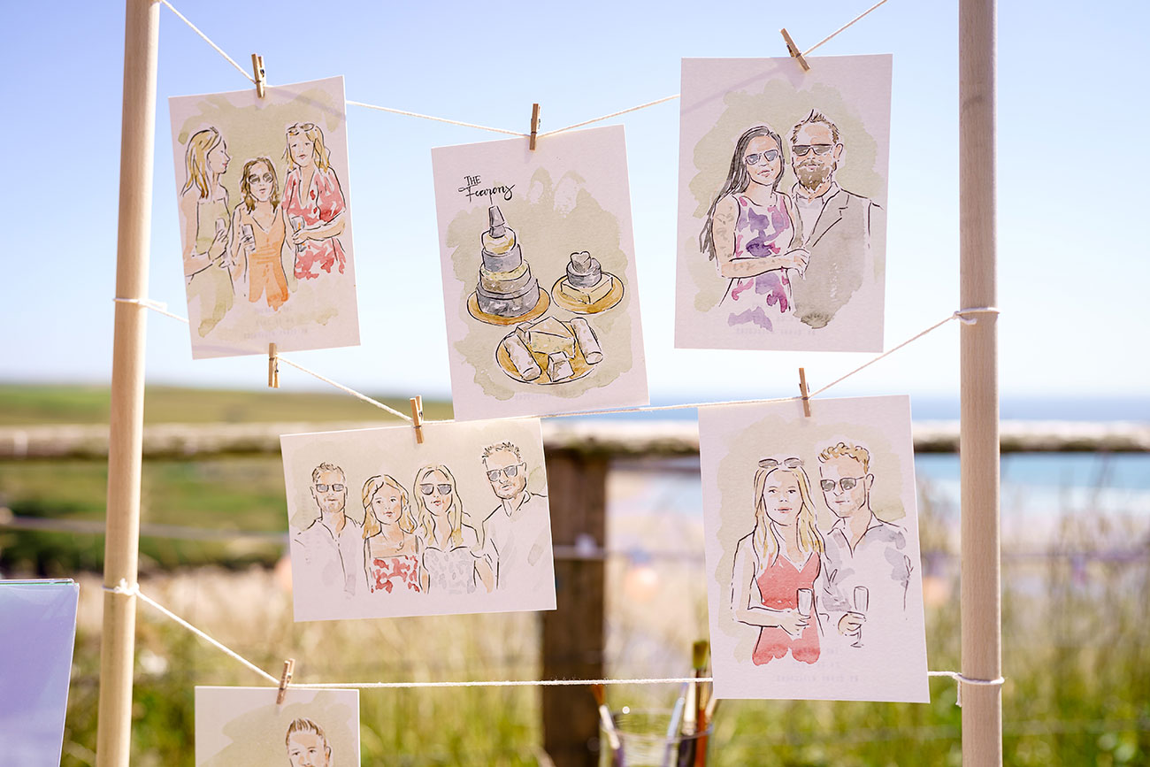 The acoustic guitar continued as guests basked in the sunshine and coastal panoramas, enjoying canapés and drinks, while a live sketch artist captured the scene. A Spanish guitarist took over as everyone settled into the marquee and tucked into paella followed by chocolate brownies and a tower of cheese.