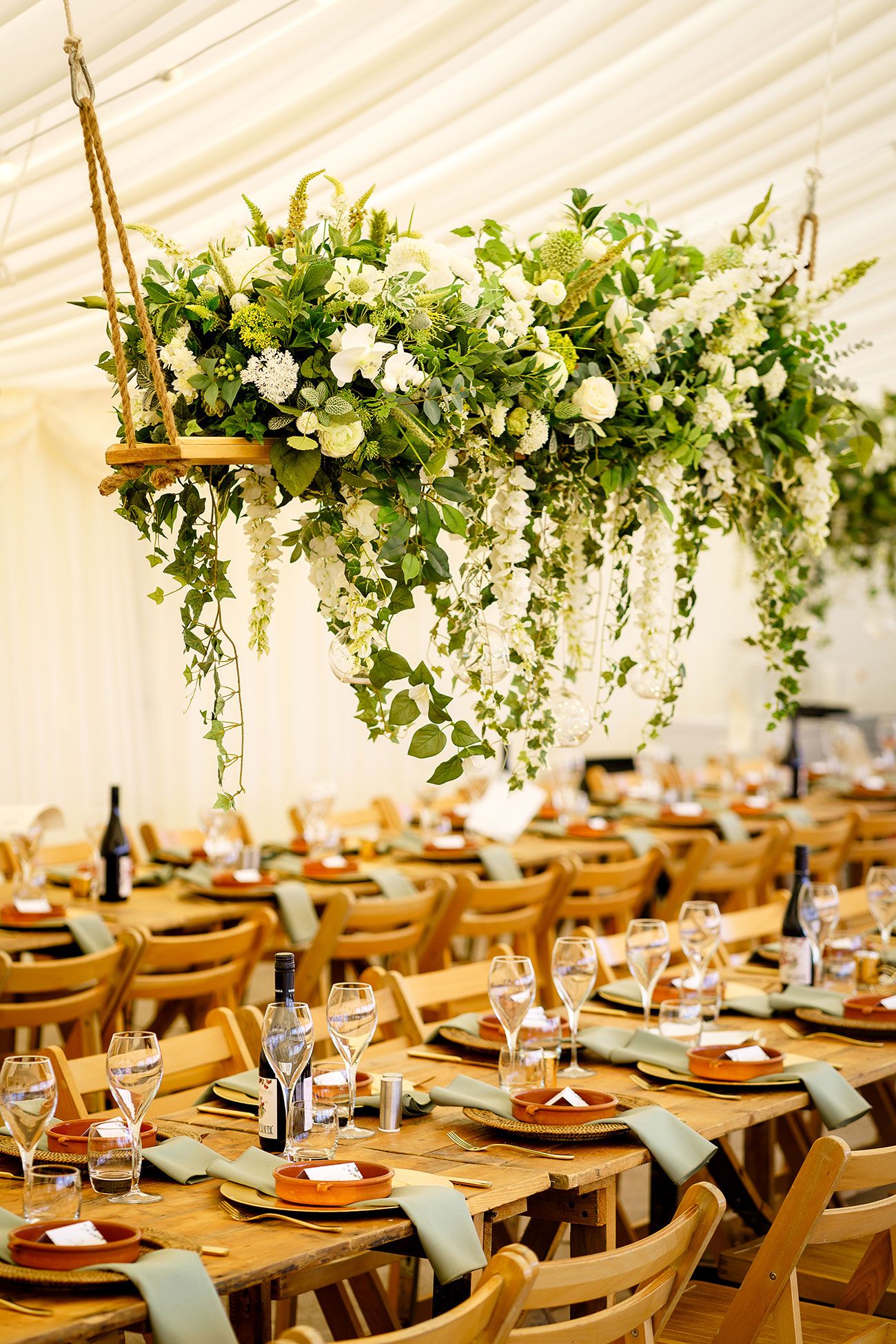 A palette of green, white and gold carried through the details of the day. Their clifftop marquee was decorated with stunning arrangements of cream blooms and foliage suspended above the trestle tables, while Murphy, who wore a stylishly minimalist gown, was flanked by bridesmaids in various shades of green carrying bouquets of dried flowers.