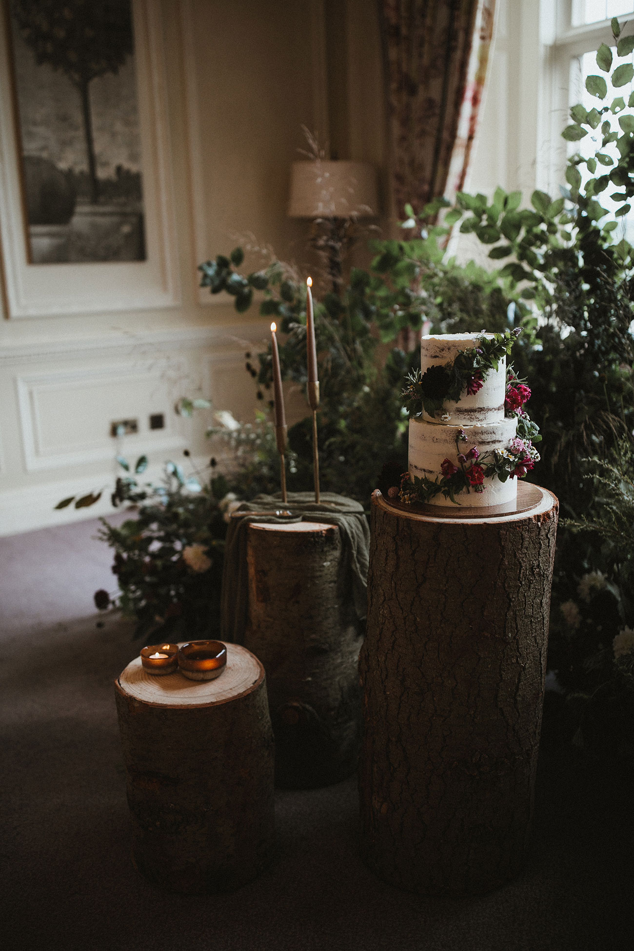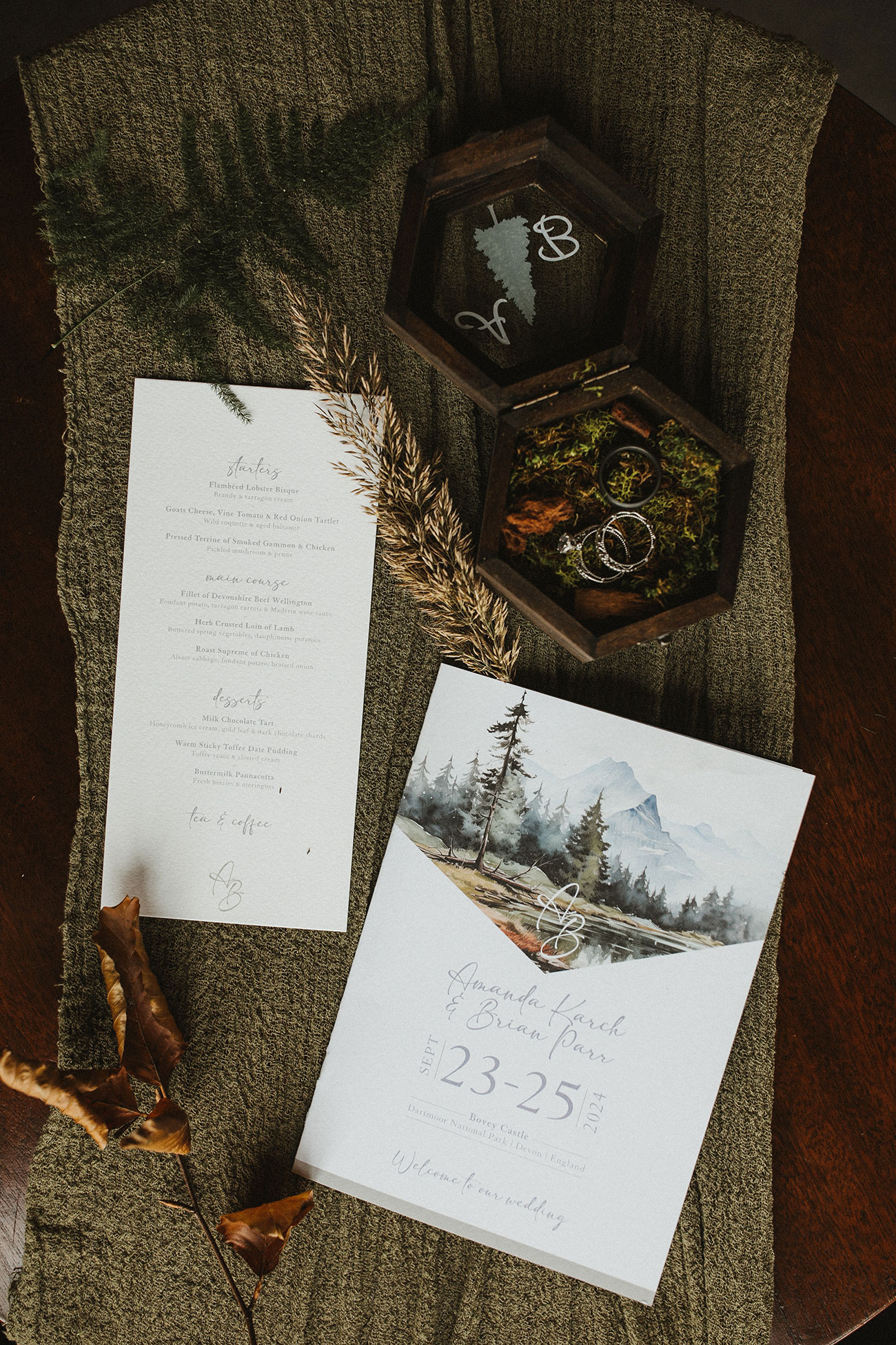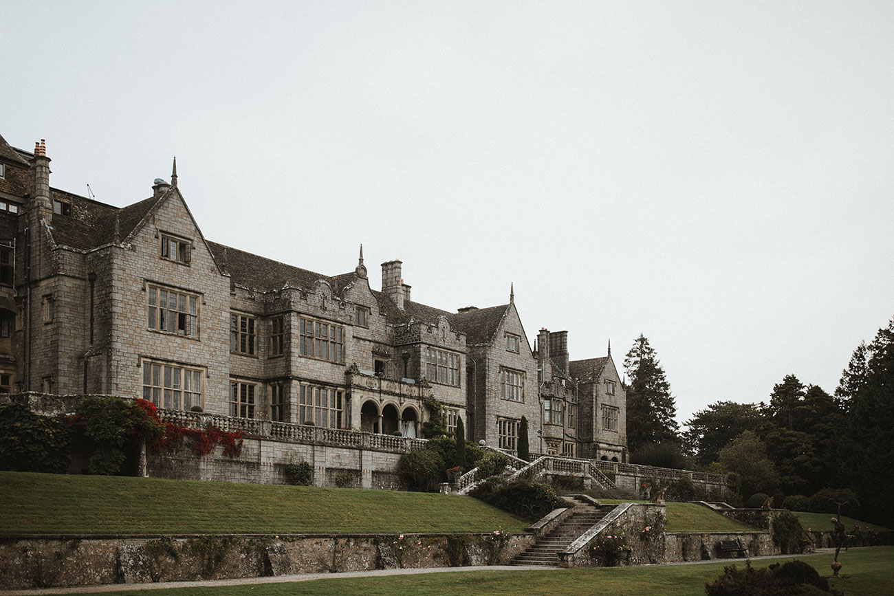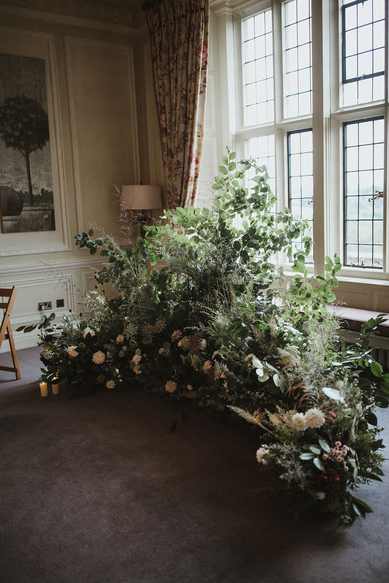 Set against the rolling landscape of Dartmoor, Bovey Castle provided the perfect backdrop to bring their forest-meets-mountain celebration to life. A rich and earthy palette of dark greens and autumnal shades of mauve and brown set the scene, while a breathtaking flower meadow transformed the ceremony room, bringing the wild outdoors in.
