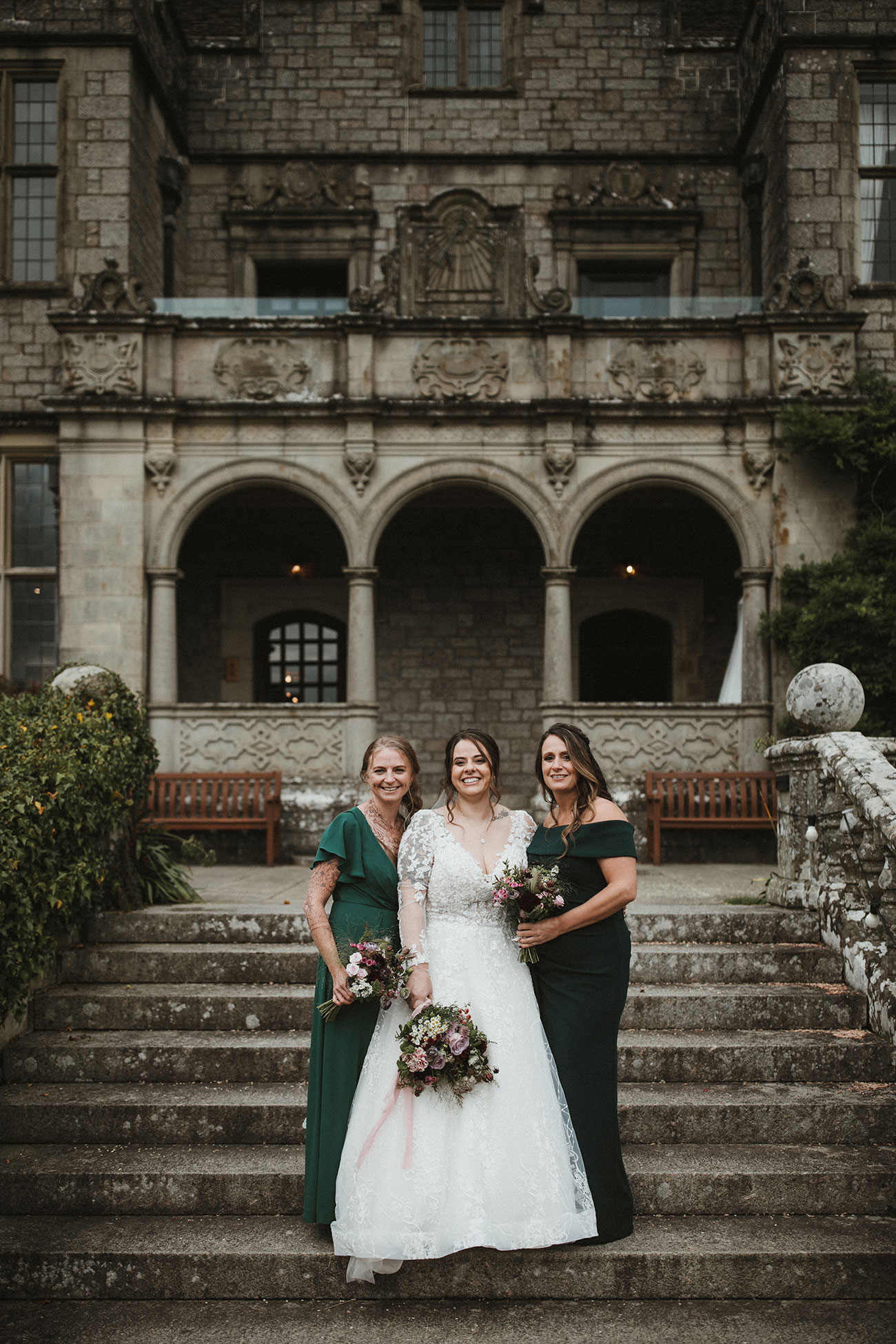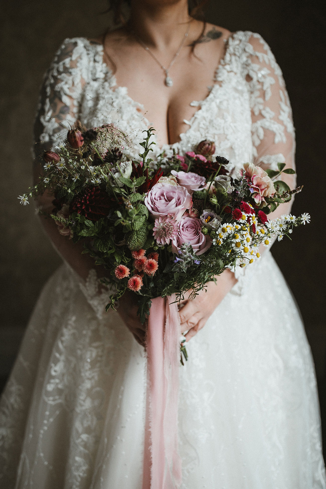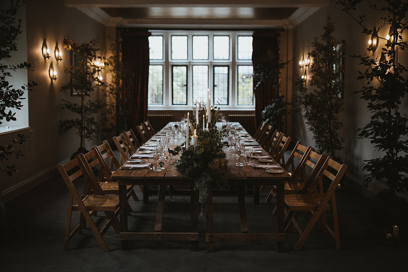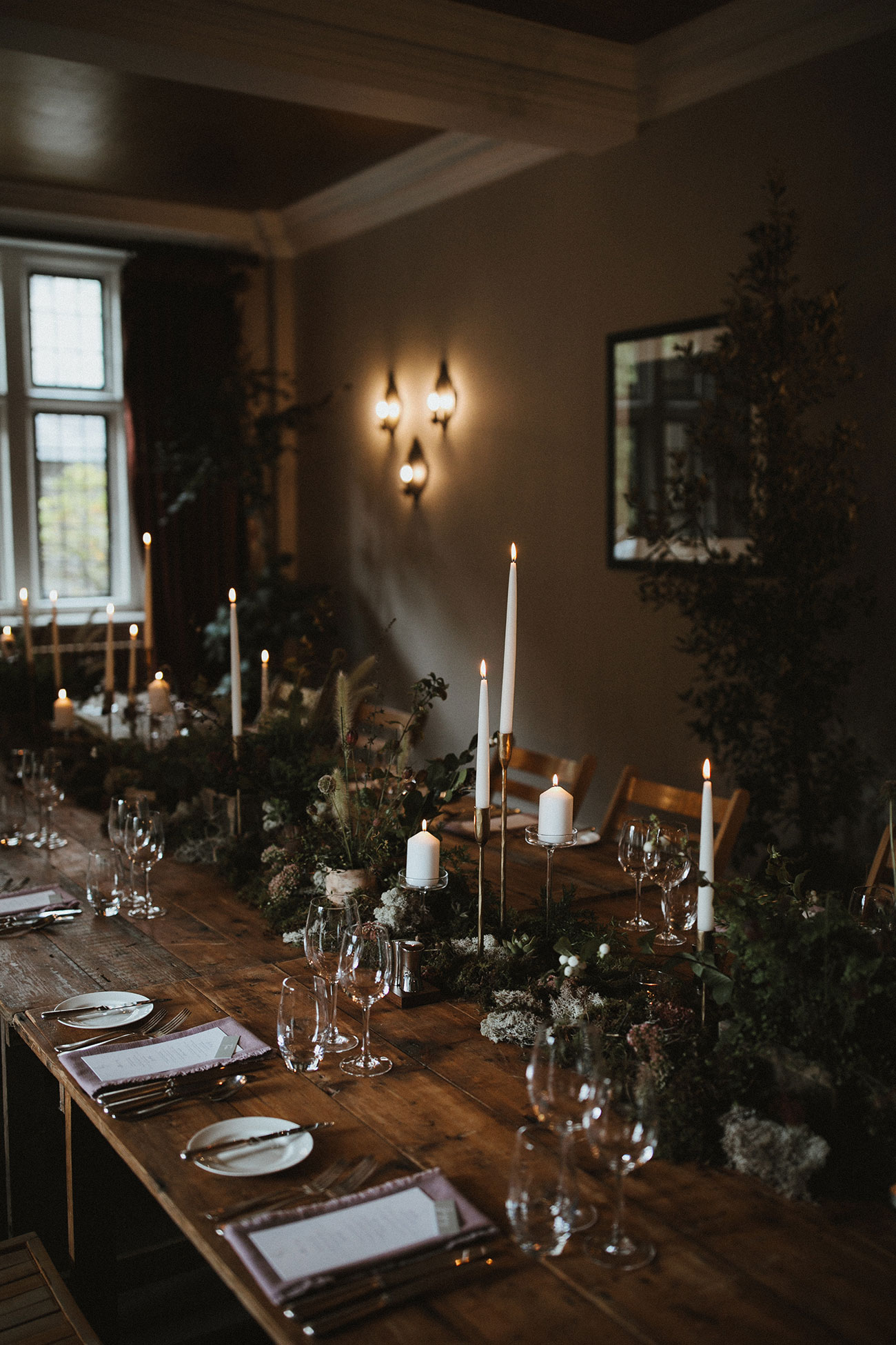 Set against the rolling landscape of Dartmoor, Bovey Castle provided the perfect backdrop to bring their forest-meets-mountain celebration to life. A rich and earthy palette of dark greens and autumnal shades of mauve and brown set the scene, while a breathtaking flower meadow transformed the ceremony room, bringing the wild outdoors in.