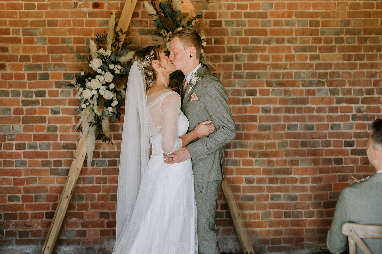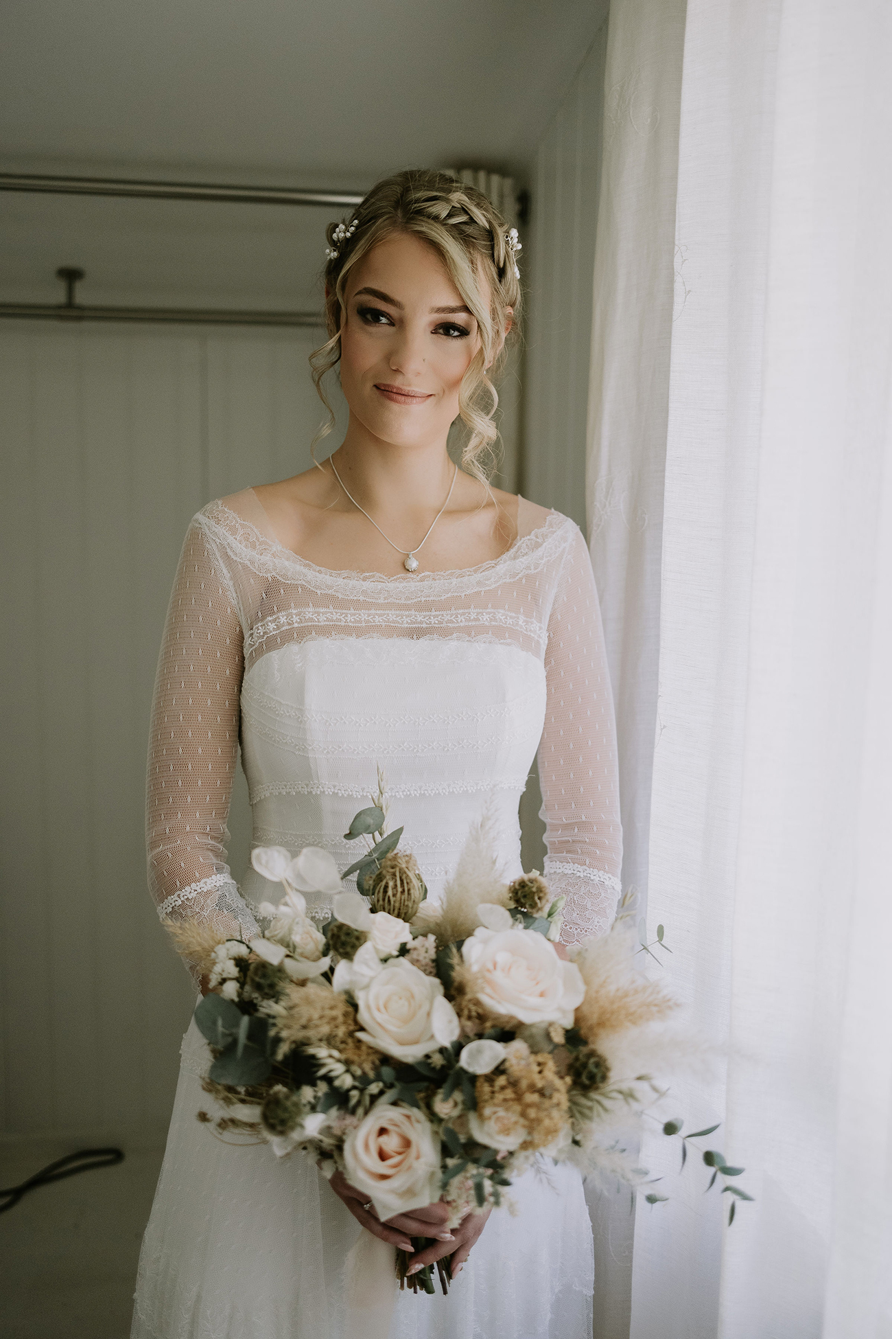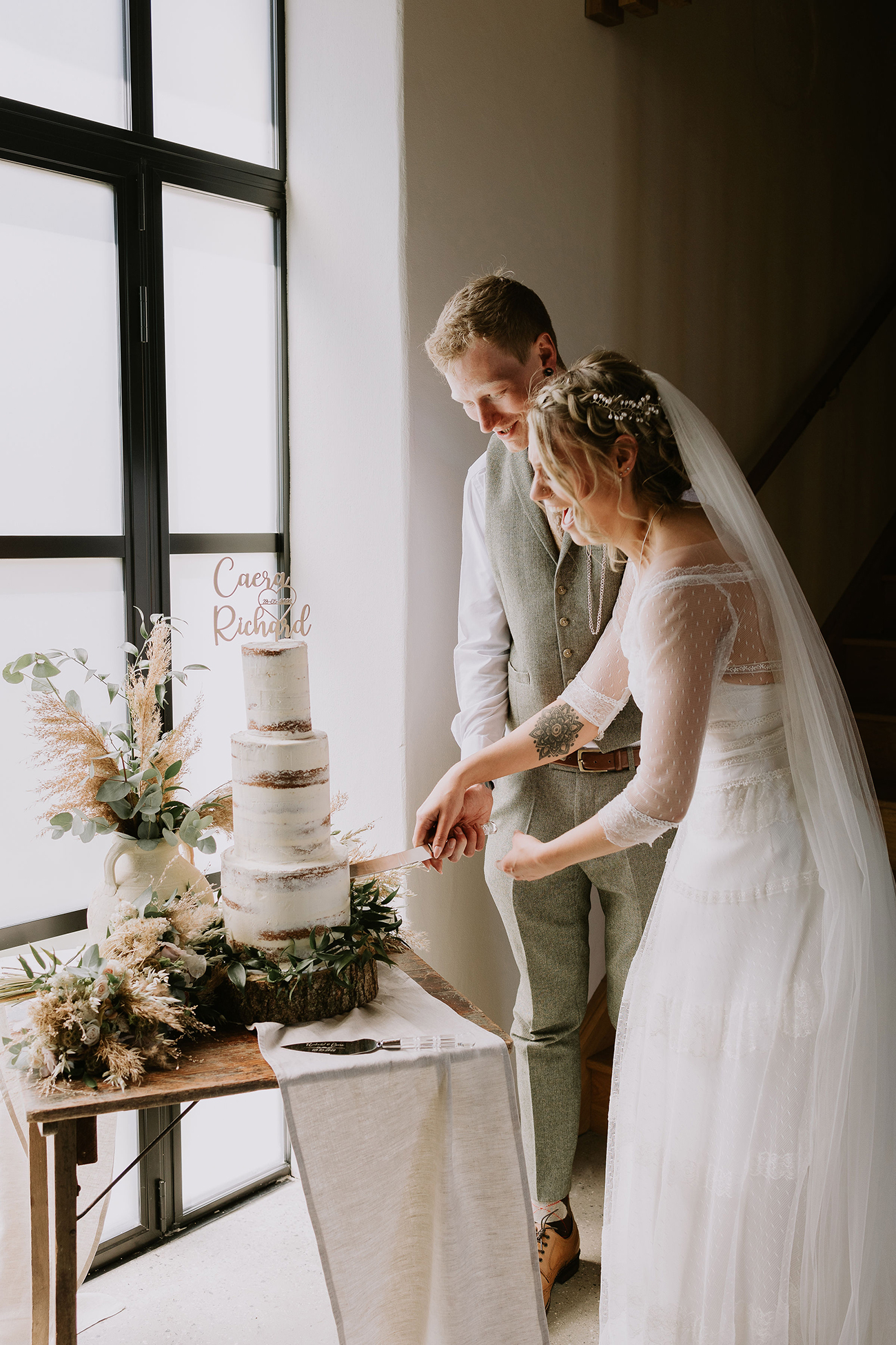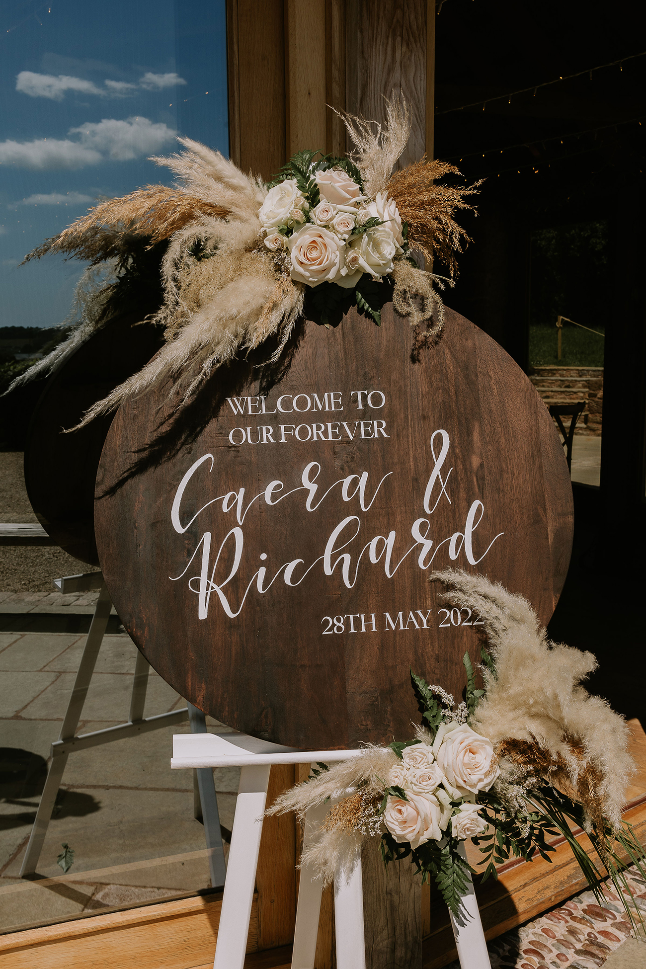 Caera and Rich had a clear vision for their day. “We wanted something intimate, romantic and close to us in Devon, and Brickhouse Vineyard was just perfect! It has beautiful views with a cosy barn vibe,” she says. Wedding stylist Nikki Sherriff from Knots & Kisses helped them to create a day inspired by neutral and earthy tones featuring dried pampas, cream wildflowers and lots of greenery. “She made everything completely stress-free and it all looked perfect on the day,” comments Caera.
