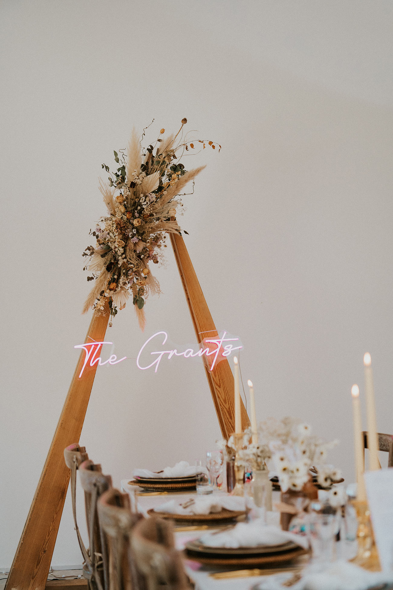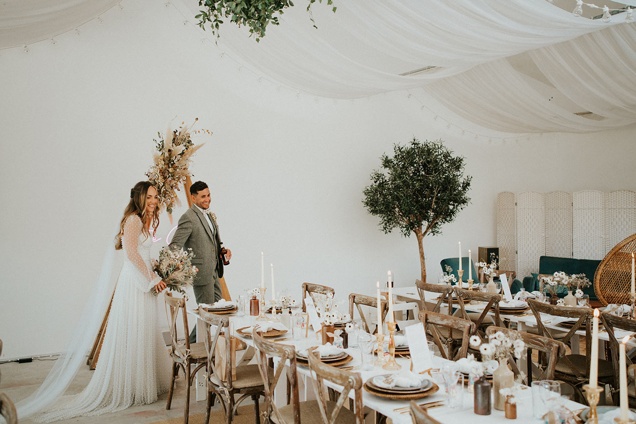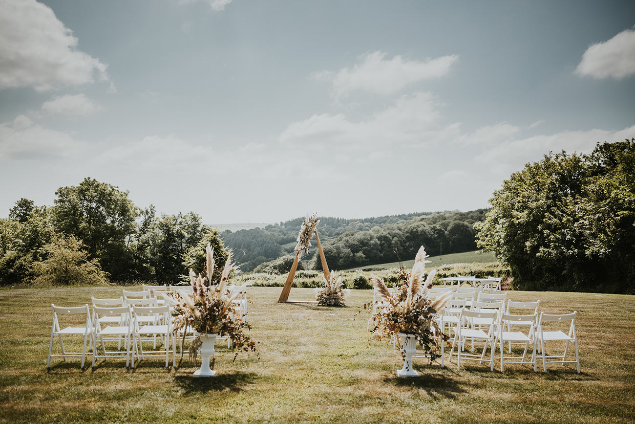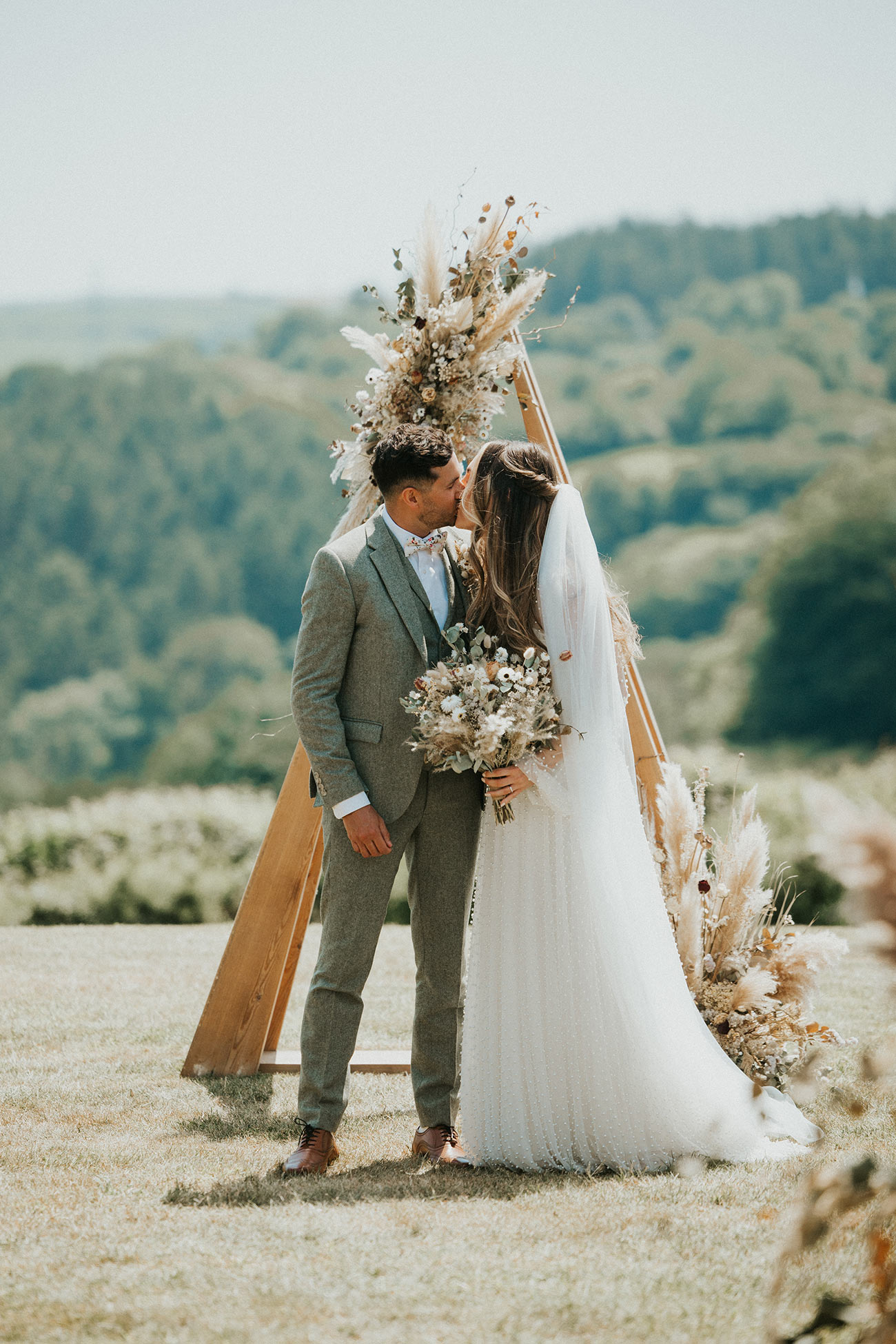 Both Chelse and Lee wanted to get married outside, deciding on the luxe countryside venue of Camel Studio. “We had a festival-style, boho garden theme, with natural colours and boho-chic style décor,” she says. “There were lots of neutrals and pampas grass, dried daises and old-style candle-holders. Lee and I opted for big peacock chairs, which made us feel ultra-special.”