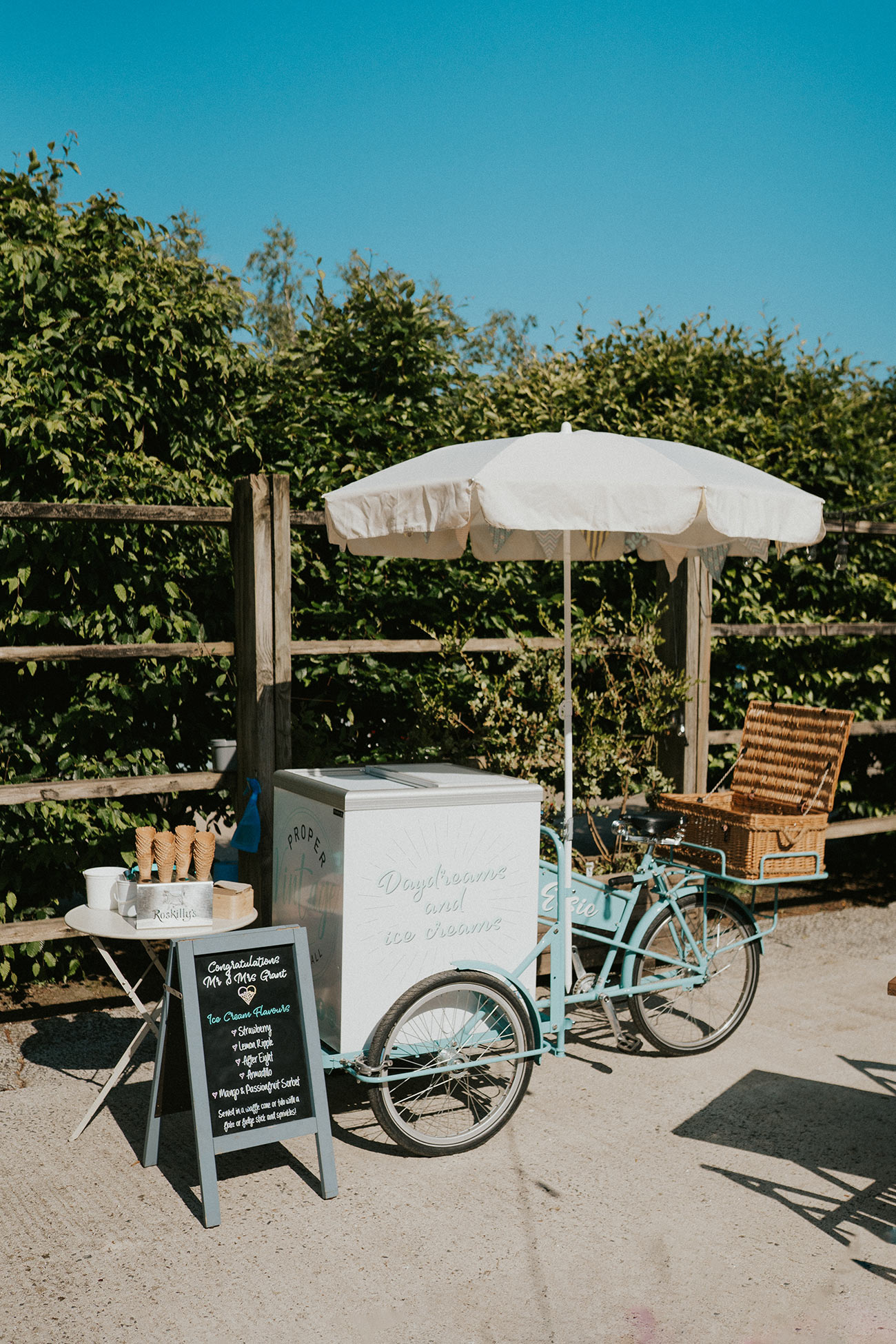 Making the most of the surroundings, the wedding moved outside for dessert served from a vintage ice cream trike. “Lee and I picked our favourite ice cream flavours, including lemon ripple, After Eight choc mint, and mango and passionfruit,” says Chelse. “They went down a treat!”