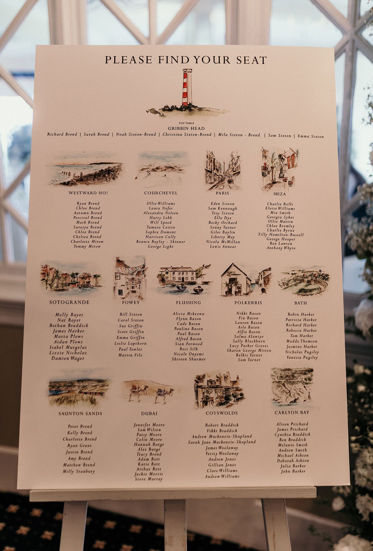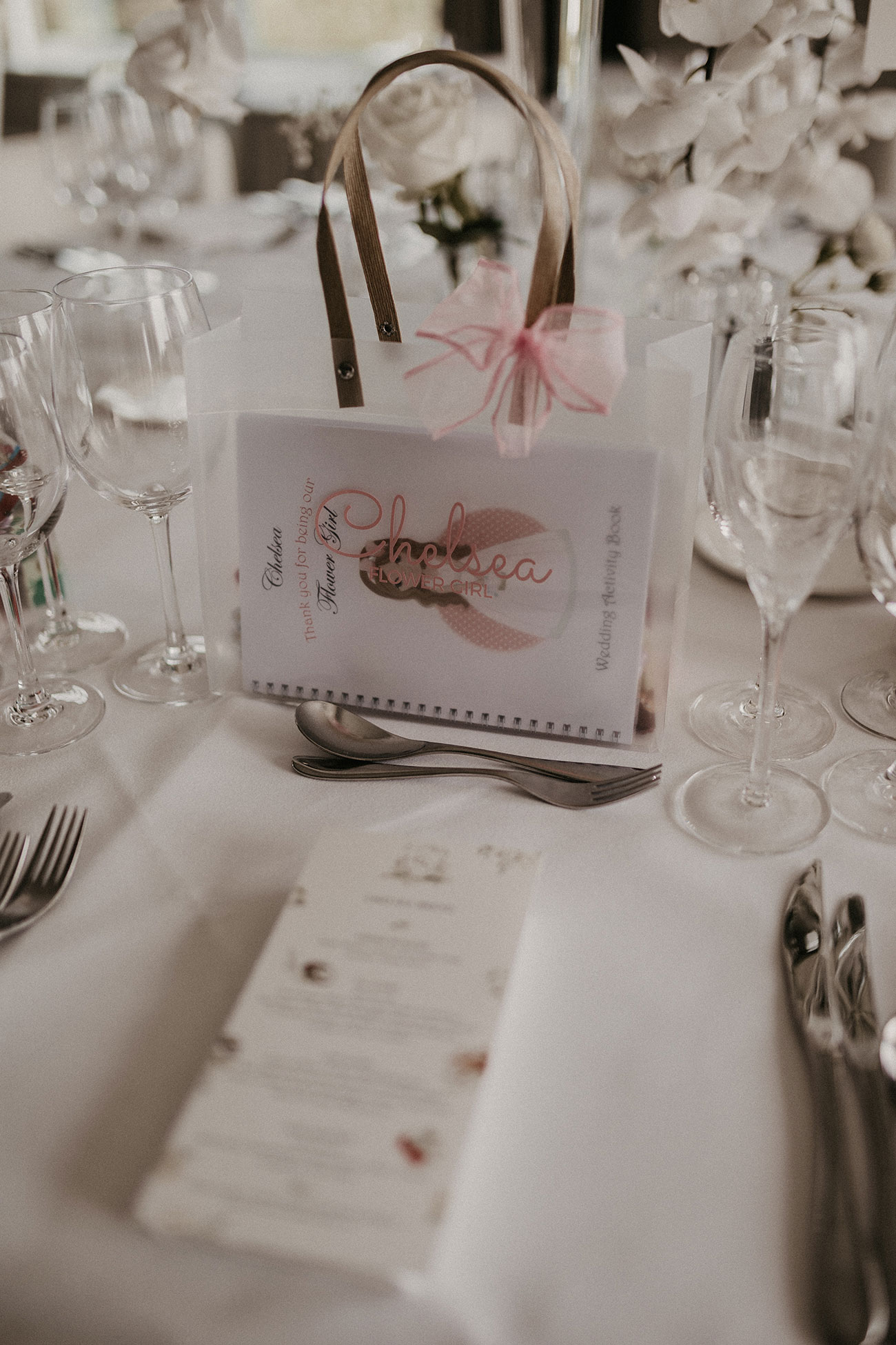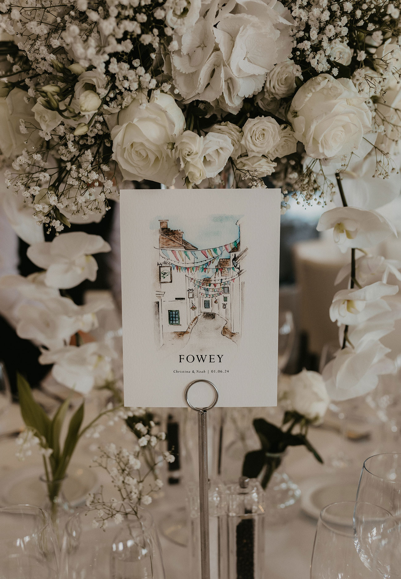 The wedding day began with a wonderful still sunrise over Carlyon Bay. A palette of ivory and white with a touch of powder blue" shaped the décor, and an abundance of white flowers, including orchids, hydrangeas, lily-of-the-valley, roses and gypsophila filled the hotel. Beautiful hand-printed table names complemented the flowers, capturing favourite destinations Christina and Noah had visited together.