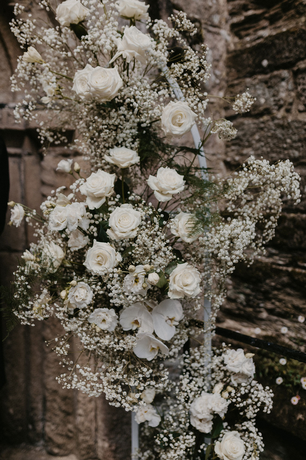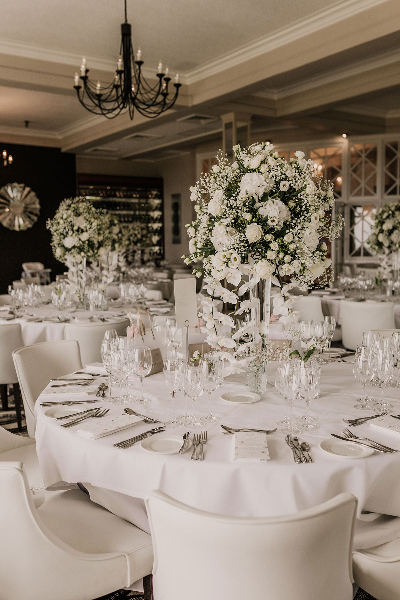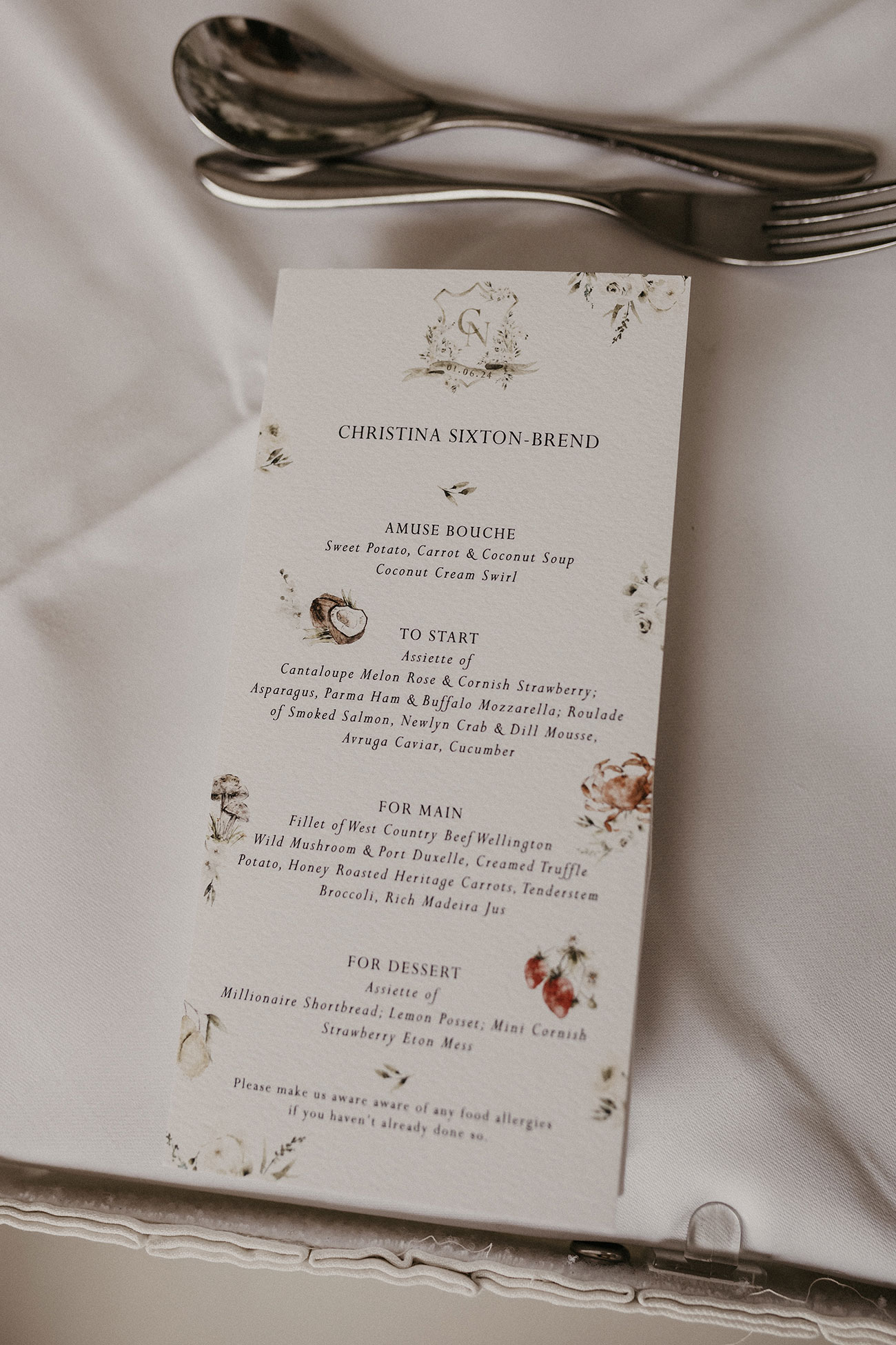 The wedding day began with a wonderful still sunrise over Carlyon Bay. A palette of ivory and white with a touch of powder blue" shaped the décor, and an abundance of white flowers, including orchids, hydrangeas, lily-of-the-valley, roses and gypsophila filled the hotel. Beautiful hand-printed table names complemented the flowers, capturing favourite destinations Christina and Noah had visited together.