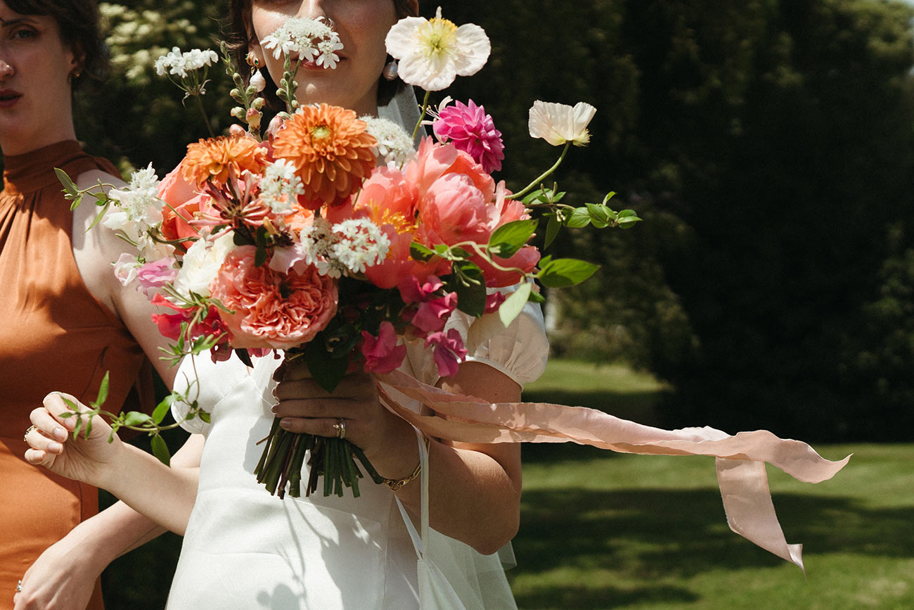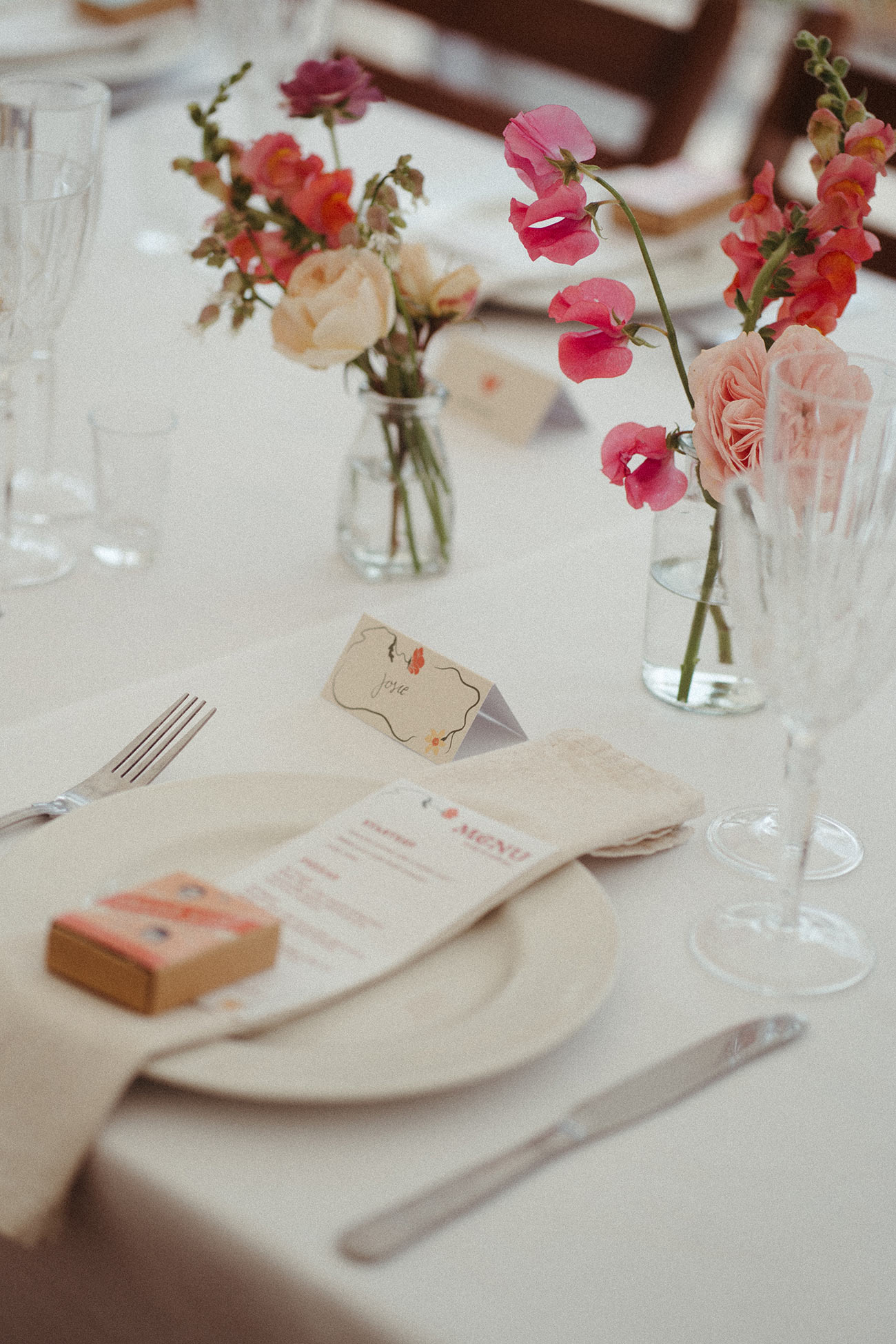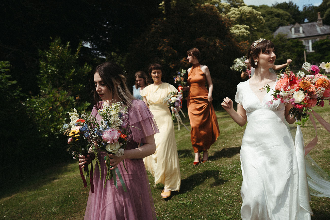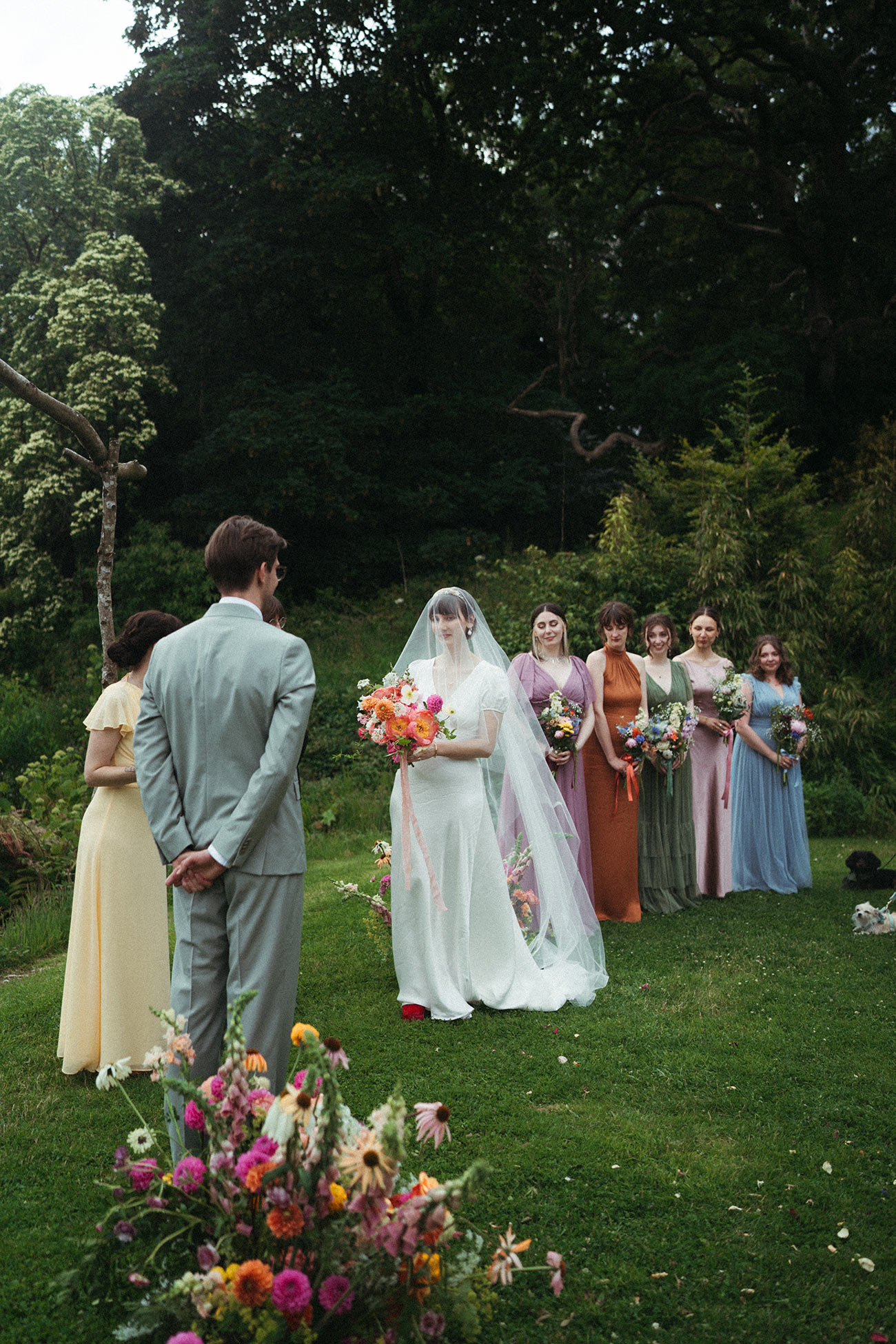 Held at Carwinion House, their wedding drew inspiration from The Secret Garden, About Time and 1950s glamour. “We chose summer hues and an Italian dinner-party vibe,” says Holly. “We wanted everything to be immersed in nostalgia and have meaning to us and our guests.” Flower meadows of seasonal blooms framed the day, while bridesmaids wore dresses in shades of pink, lilac, lemon, blue and orange. As an art director and illustrator, Holly designed all the stationery herself, inspired by 1950s-style invitations with art-nouveau touches.