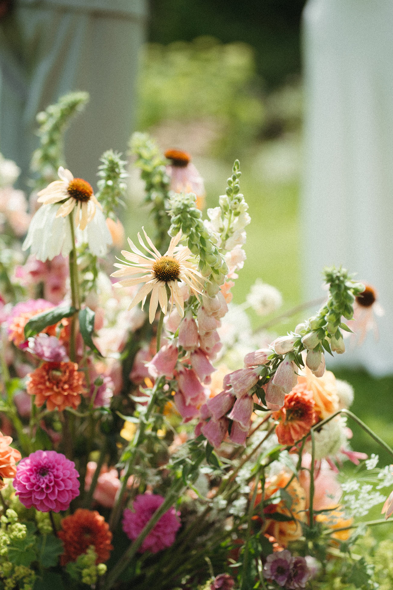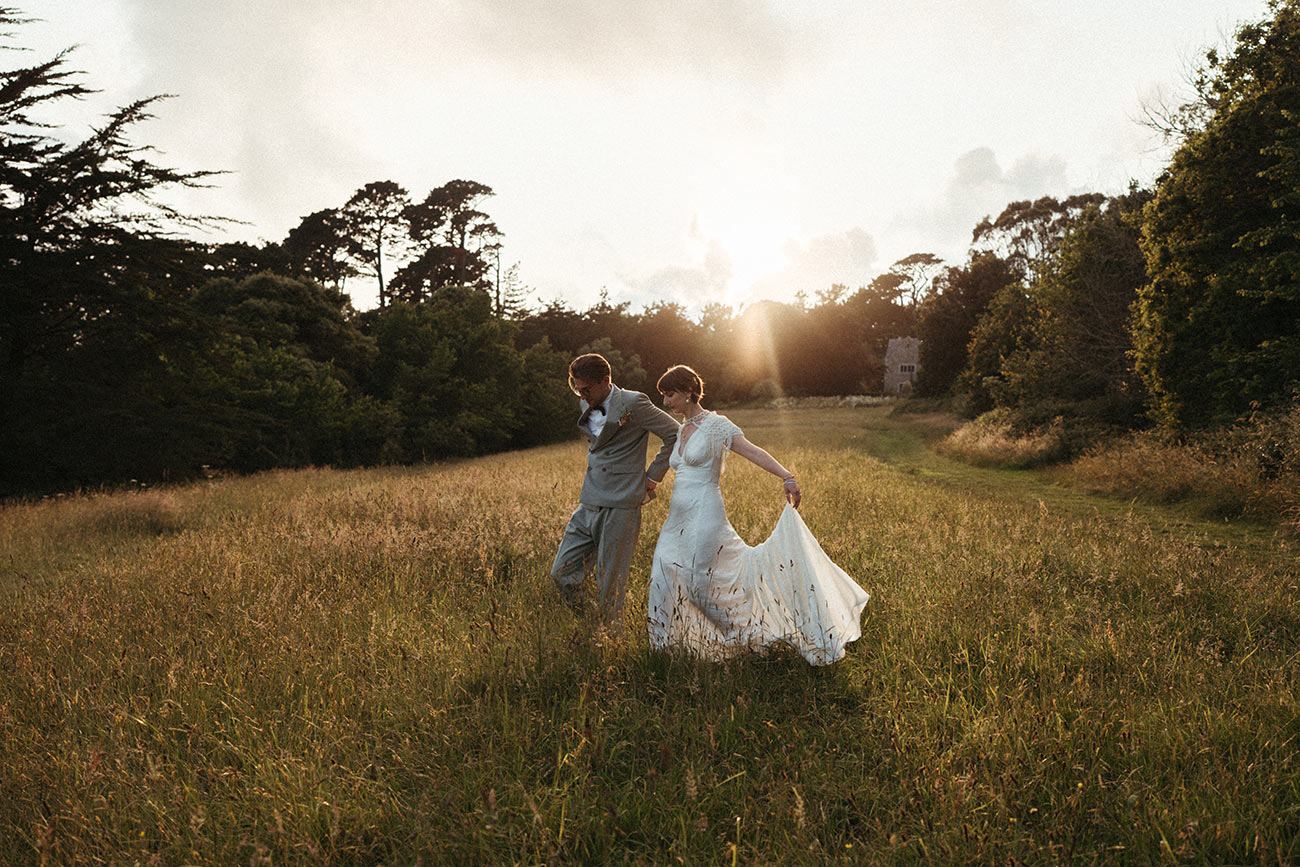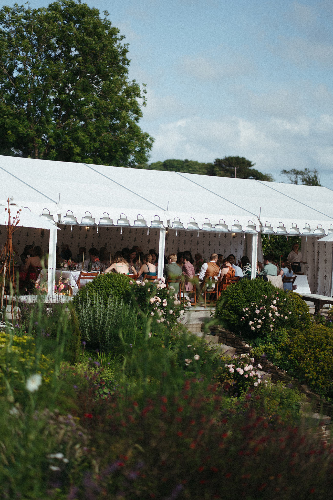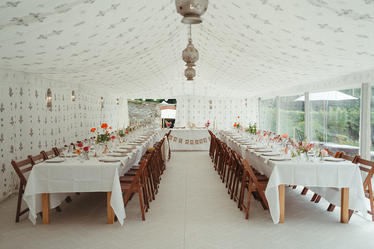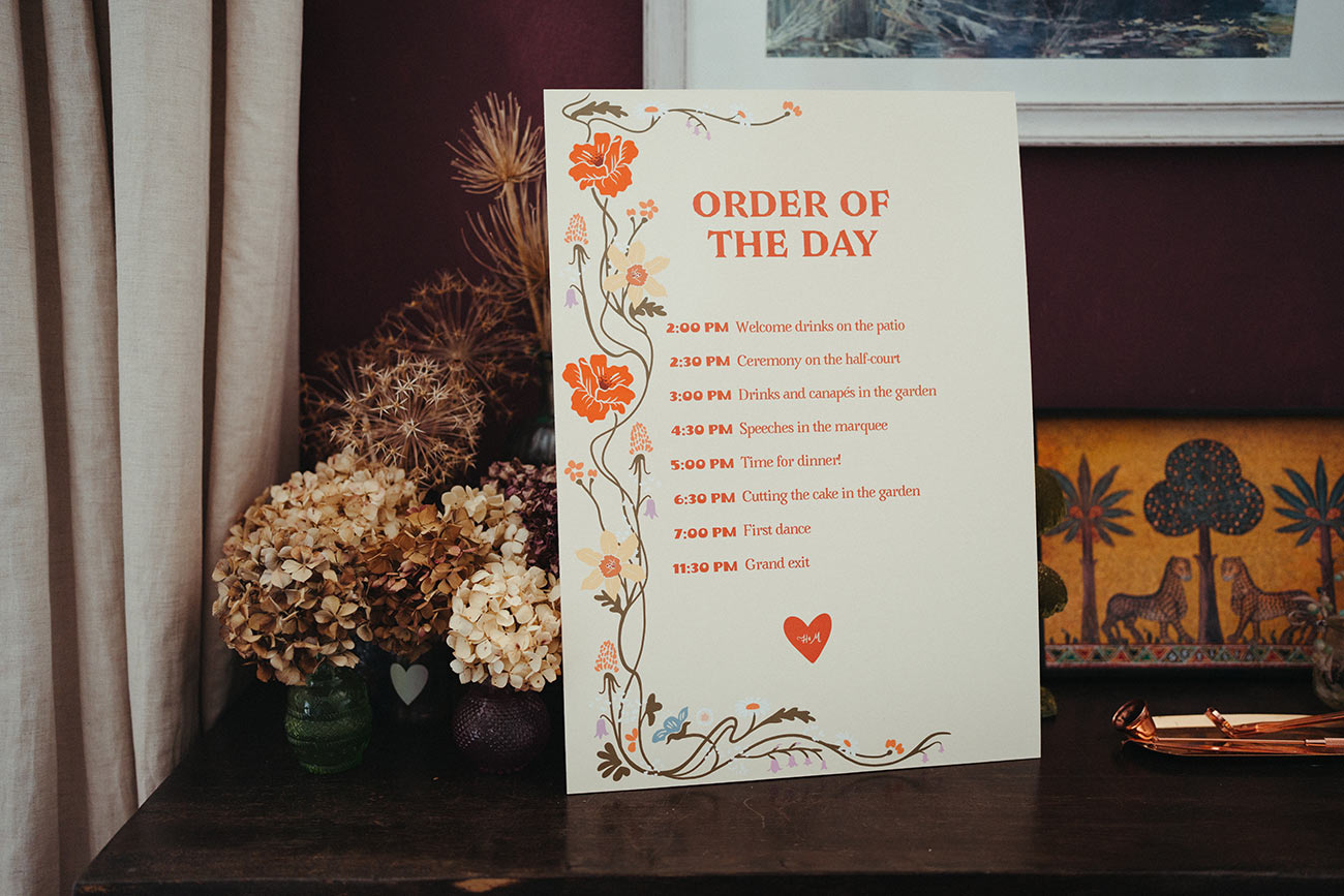 Held at Carwinion House, their wedding drew inspiration from The Secret Garden, About Time and 1950s glamour. “We chose summer hues and an Italian dinner-party vibe,” says Holly. “We wanted everything to be immersed in nostalgia and have meaning to us and our guests.” Flower meadows of seasonal blooms framed the day, while bridesmaids wore dresses in shades of pink, lilac, lemon, blue and orange. As an art director and illustrator, Holly designed all the stationery herself, inspired by 1950s-style invitations with art-nouveau touches.