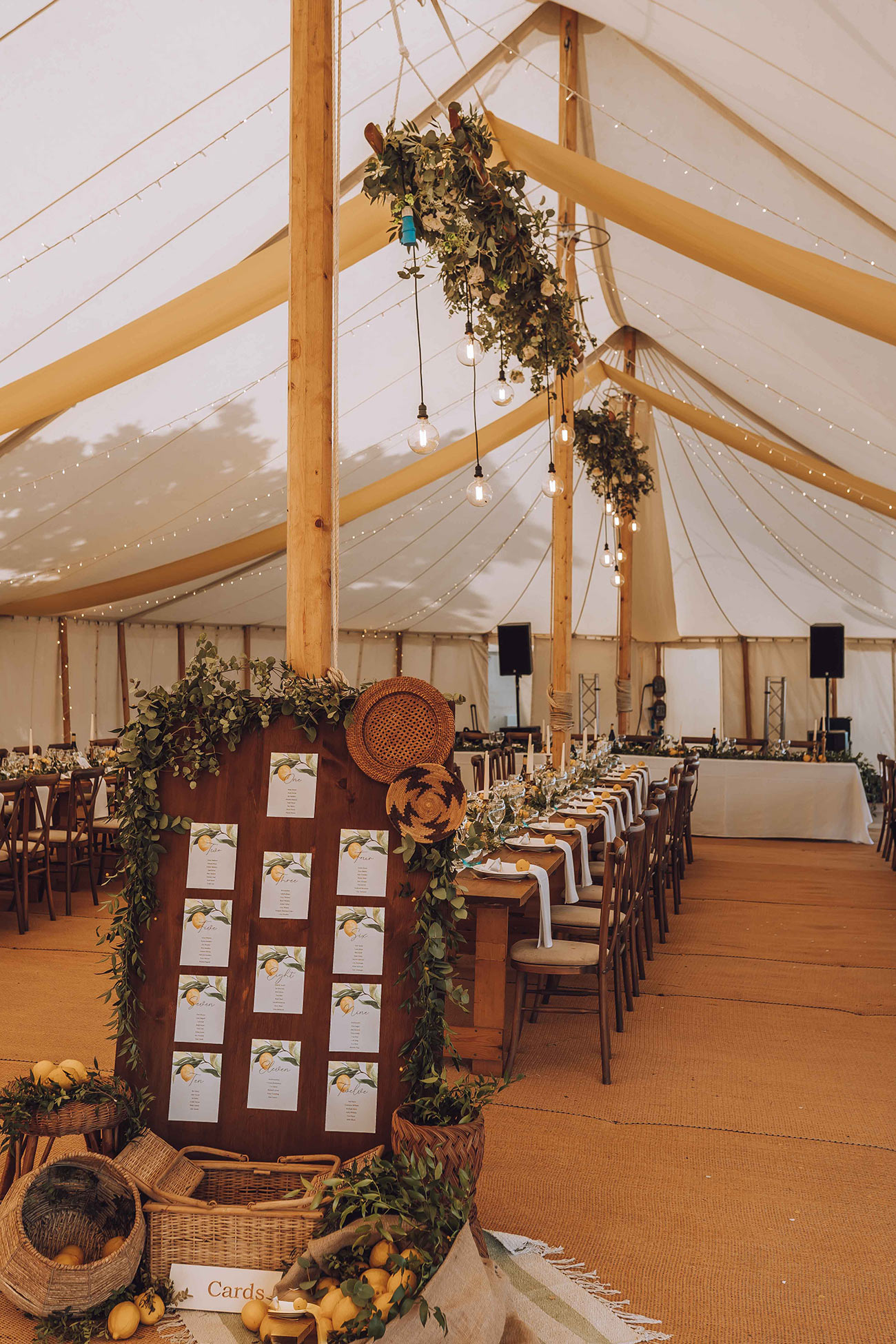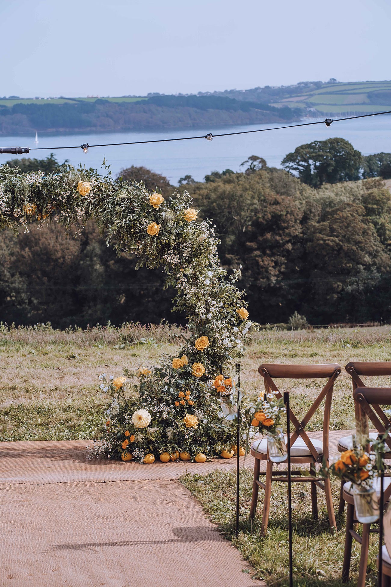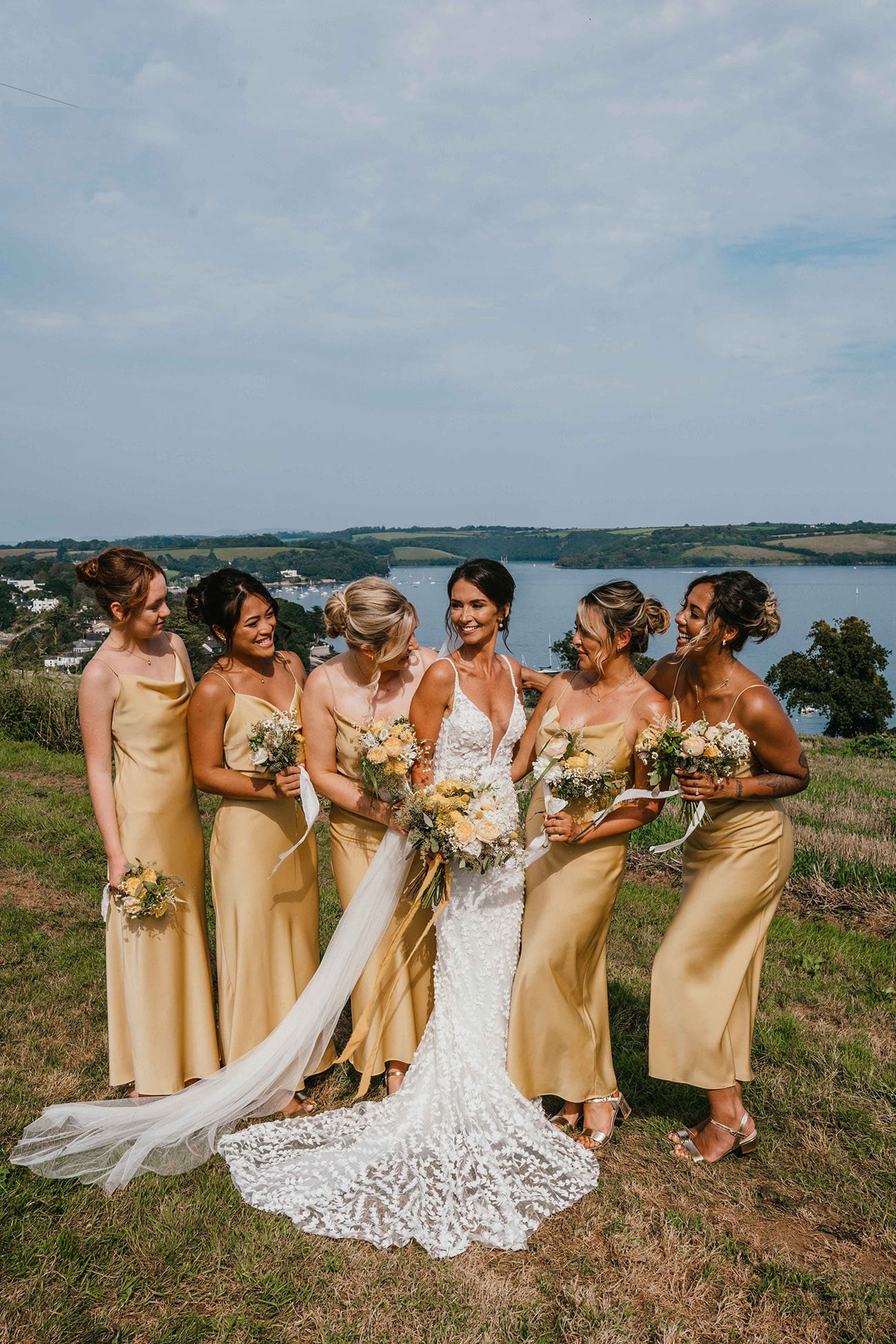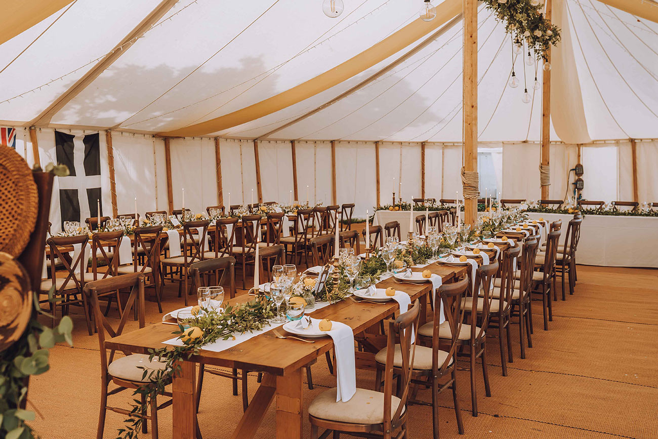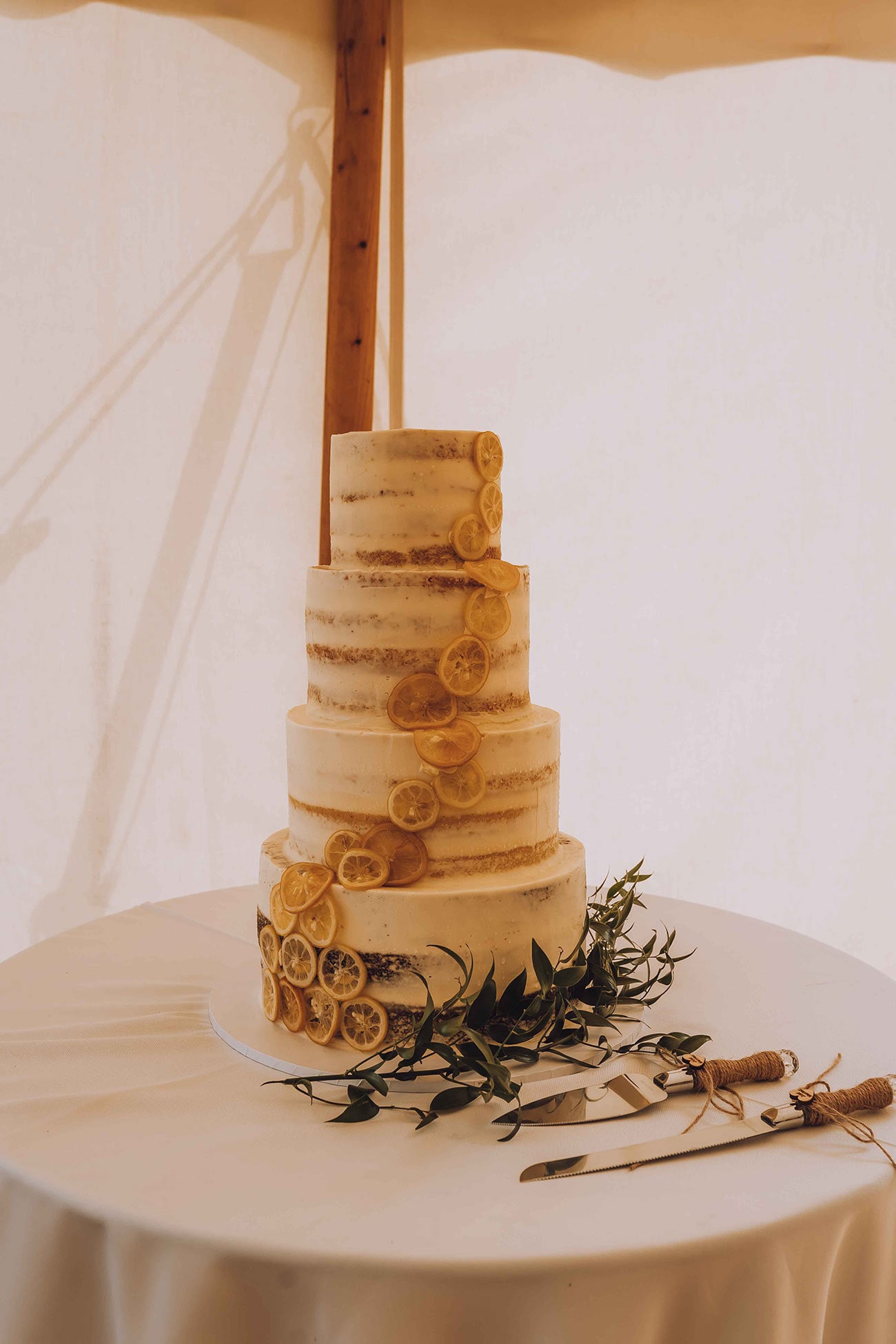Choosing Restronguet Barton as the venue for their ceremony and marquee reception, Emily’s favourite colour – lemon – was woven throughout the day, from the lemon yellow décor, flowers and bridesmaids’ dresses to the dried lemons adorning the cake.