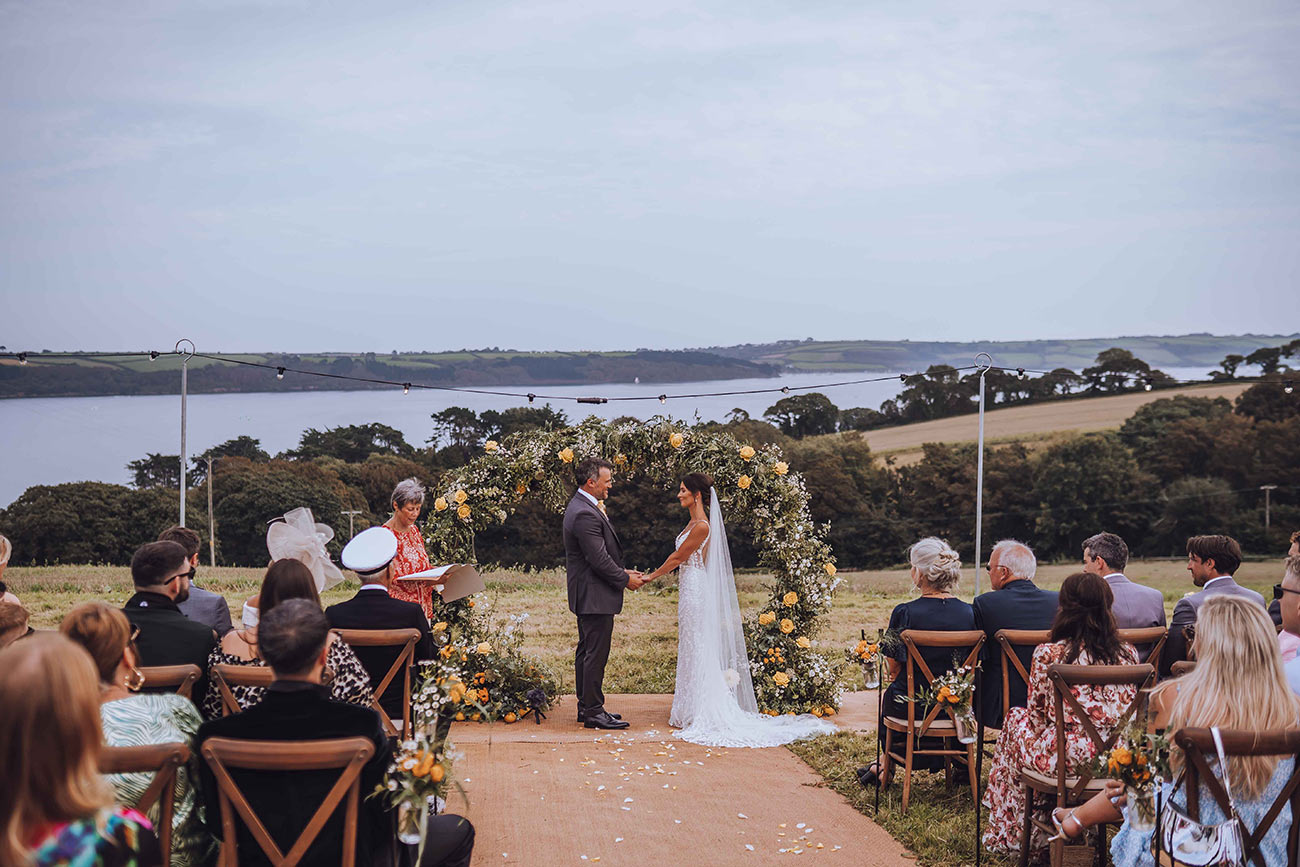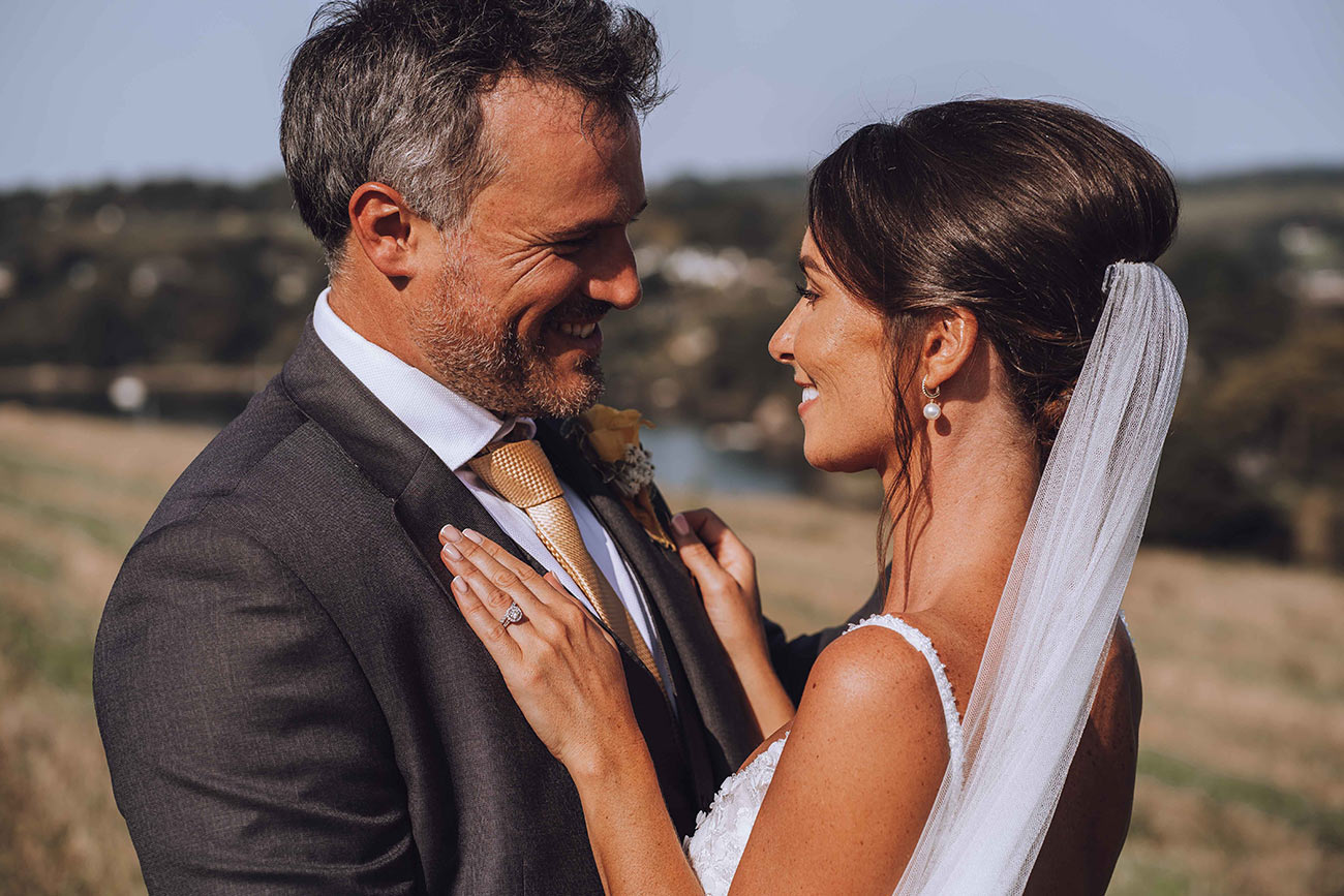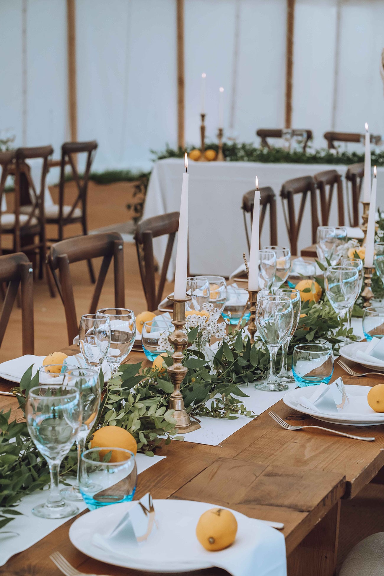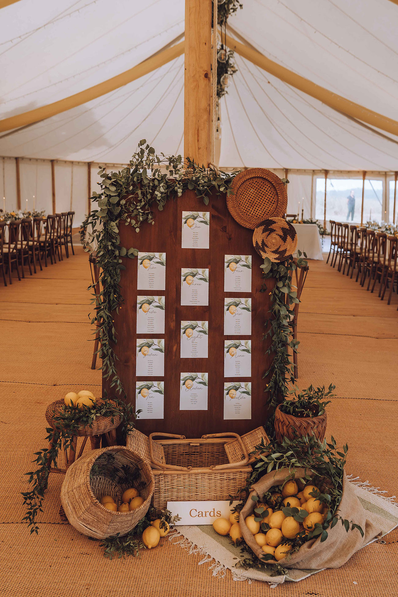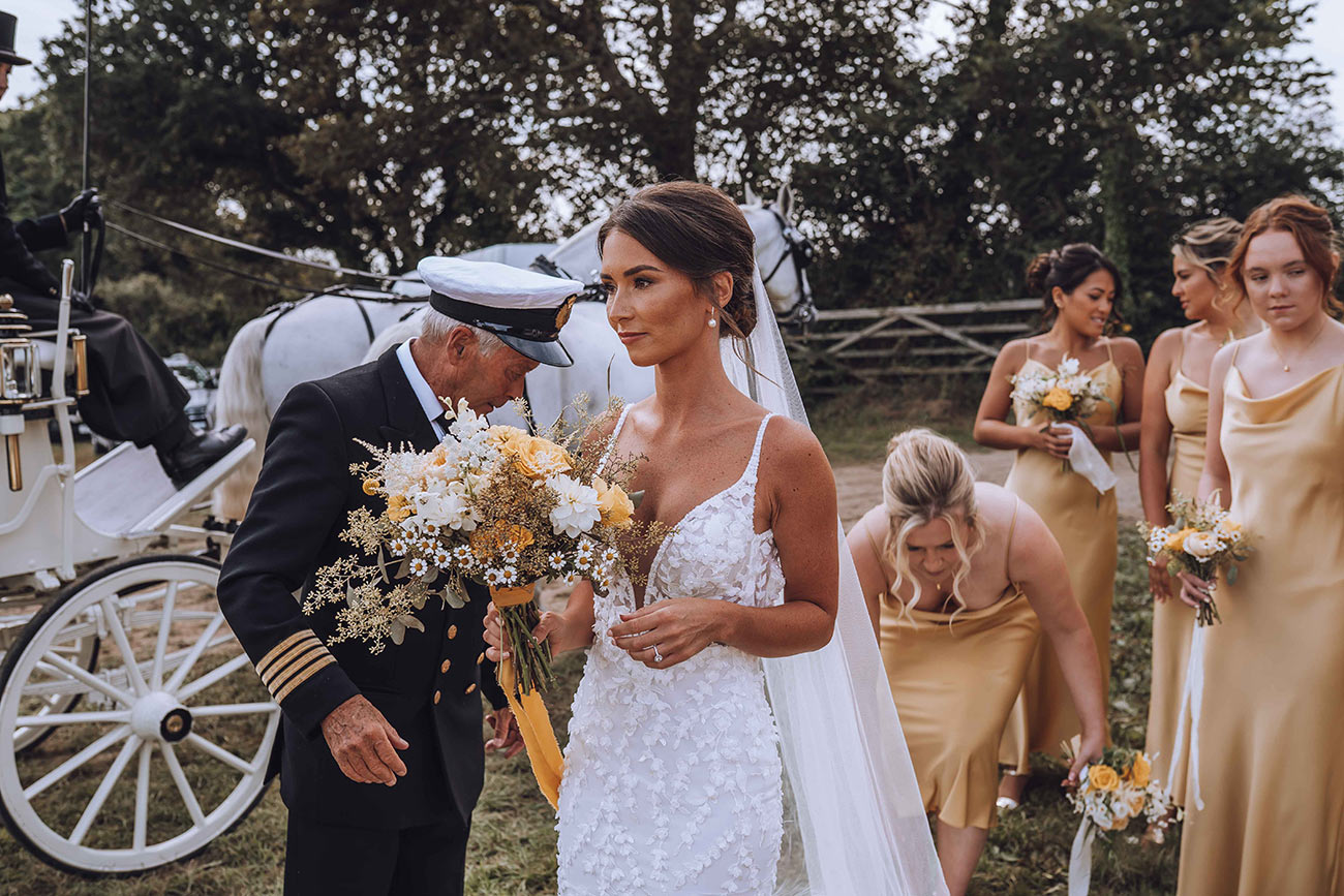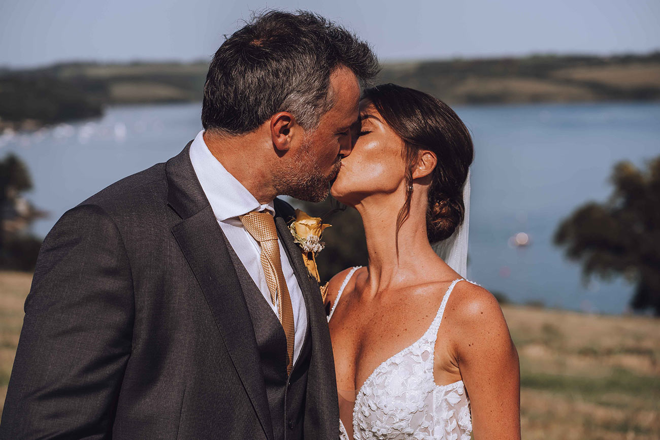 Choosing Restronguet Barton as the venue for their ceremony and marquee reception, Emily’s favourite colour – lemon – was woven throughout the day, from the lemon yellow décor, flowers and bridesmaids’ dresses to the dried lemons adorning the cake.