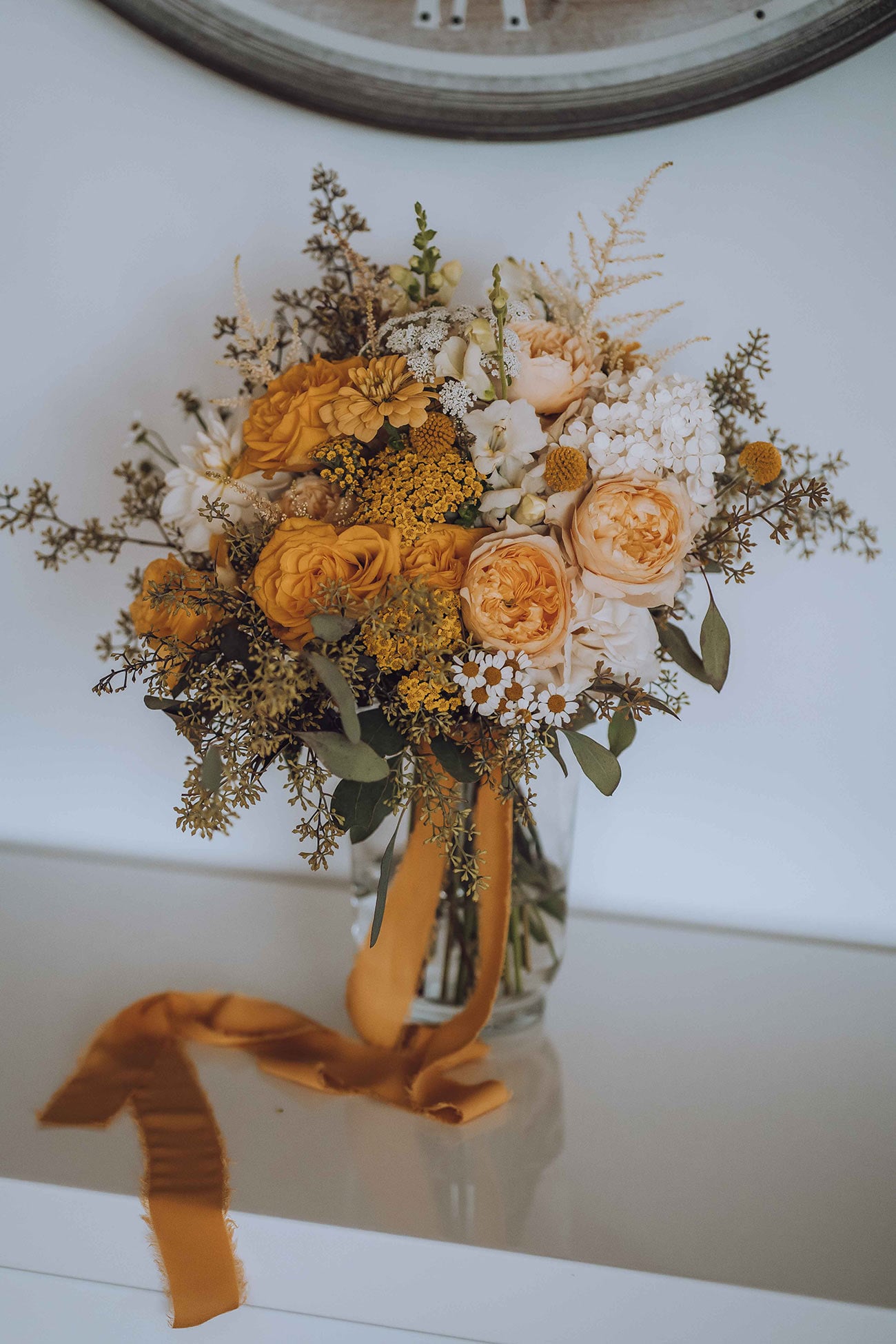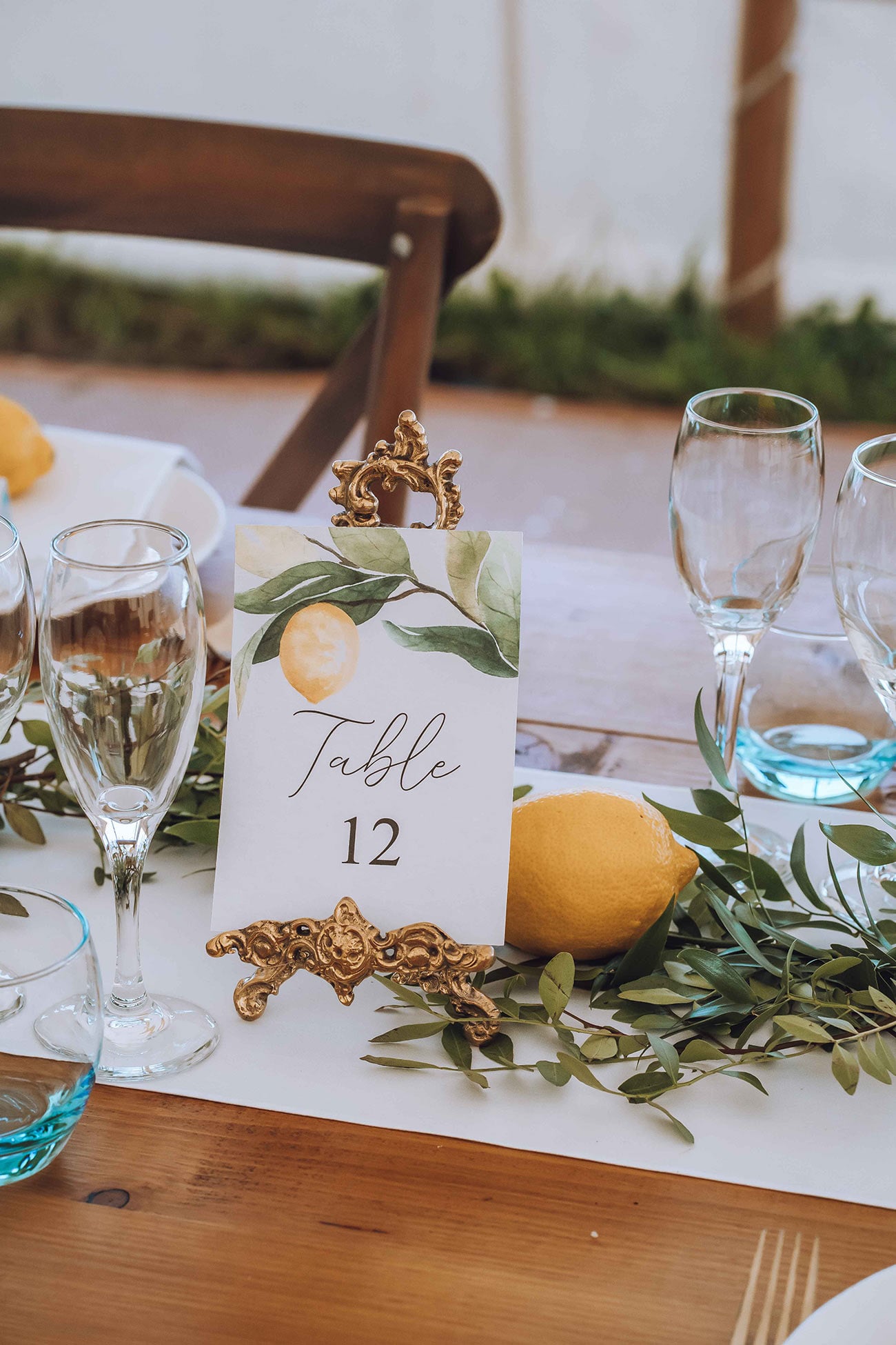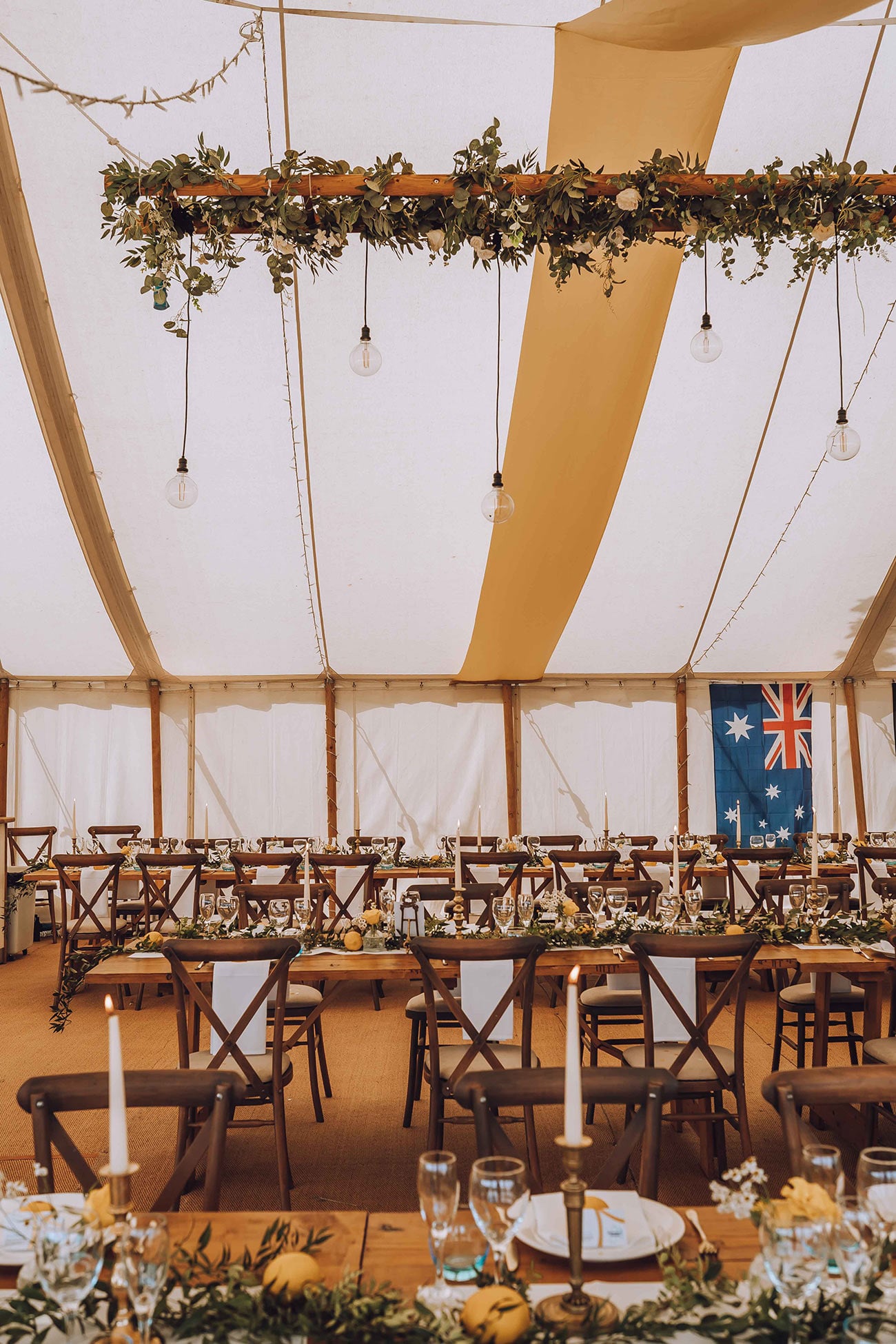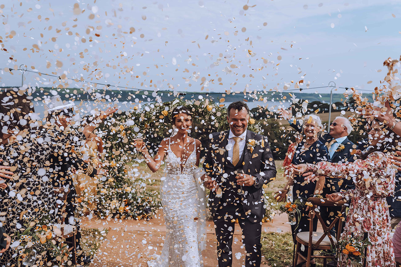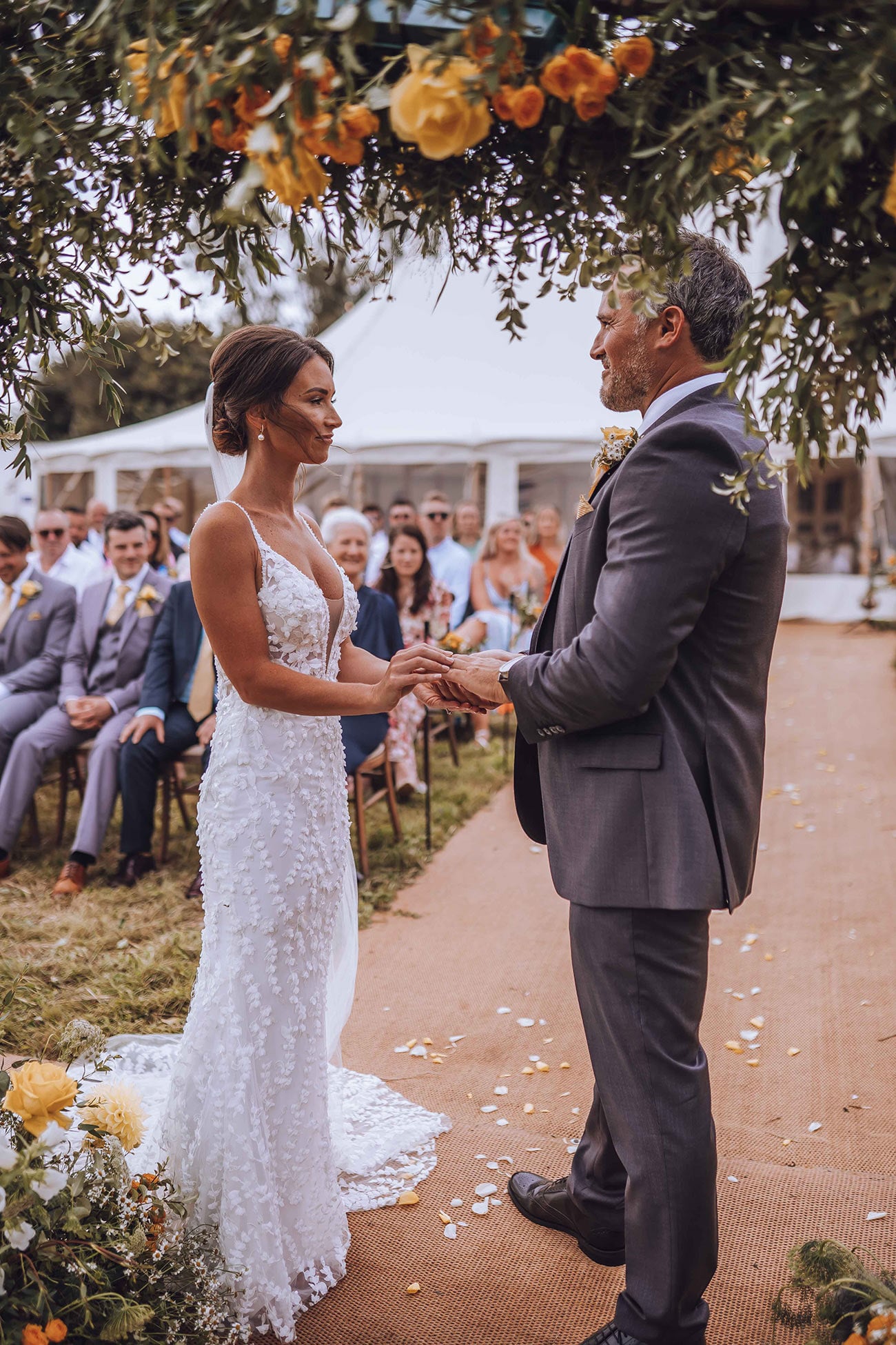 Choosing Restronguet Barton as the venue for their ceremony and marquee reception, Emily’s favourite colour – lemon – was woven throughout the day, from the lemon yellow décor, flowers and bridesmaids’ dresses to the dried lemons adorning the cake.