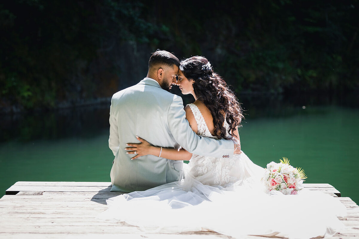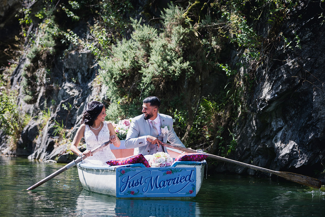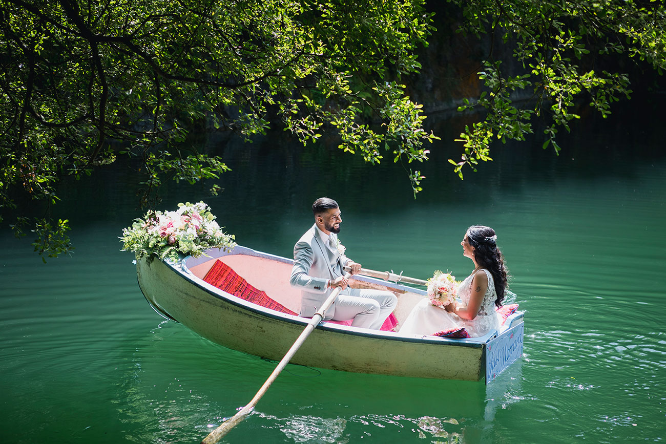 After exchanging their vows by the lake’s serene blue-green waters, Sneha and Chirag rowed across the lake for photographs. “We had so much fun taking these photos, even though we quickly discovered that we lack the basic skills to row!” laughs Chirag. “We were so lucky to have amazing weather, with the sun reflecting off the water. It honestly felt like a dream.”