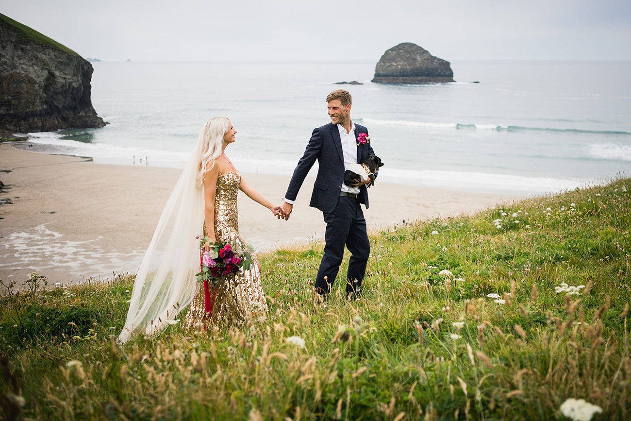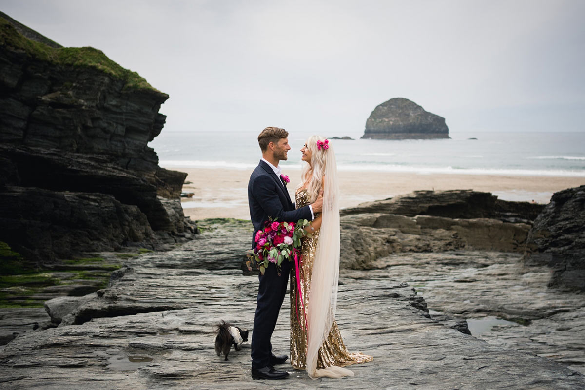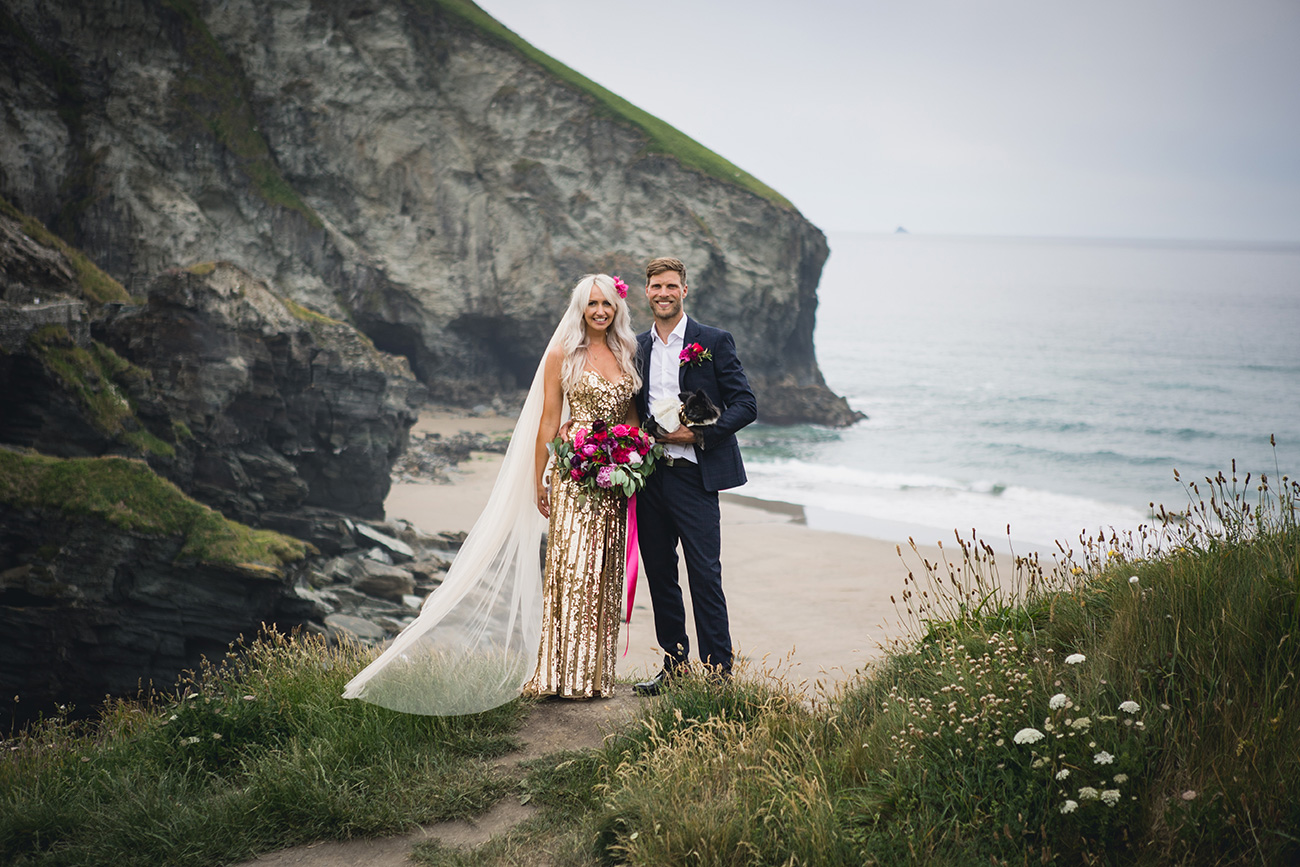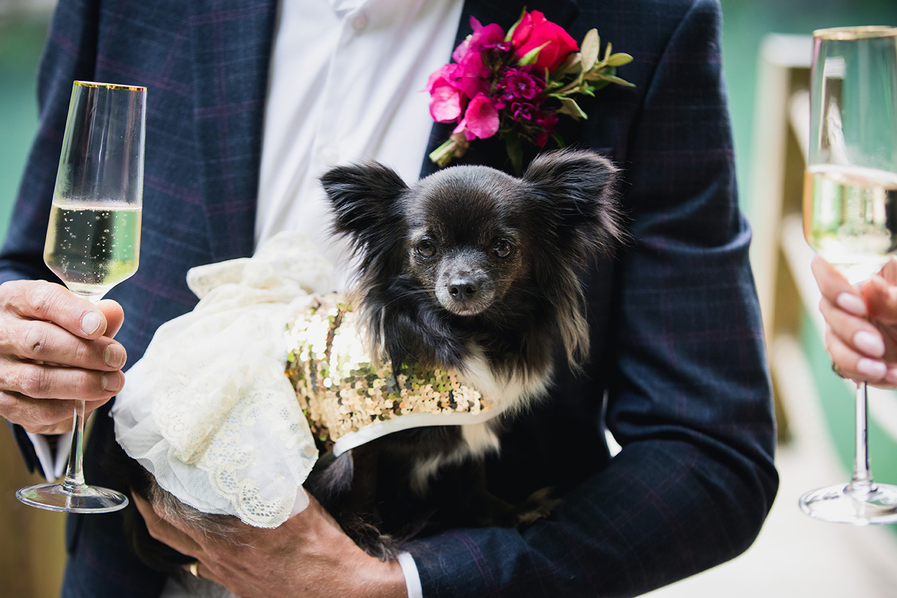 Completing the striking scene, Ollie donned a navy suit while the maid of honour and flower girl wore pink dresses to echo the flowers. “Our little chihuahua, Bella, made the cutest little ring-bearer and stole the show trotting up with the rings attached to her bespoke gold sequin tutu dress!” smiles Phoebe.