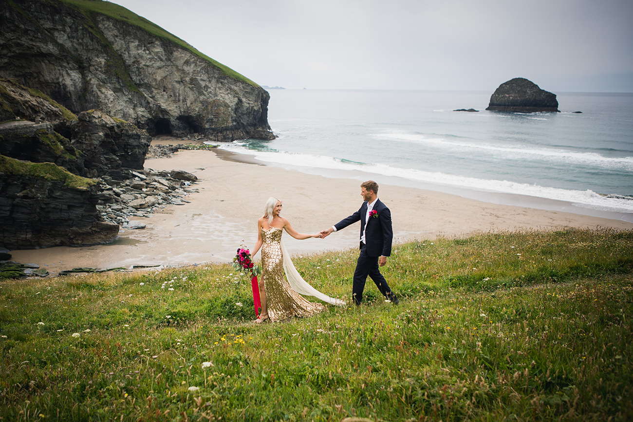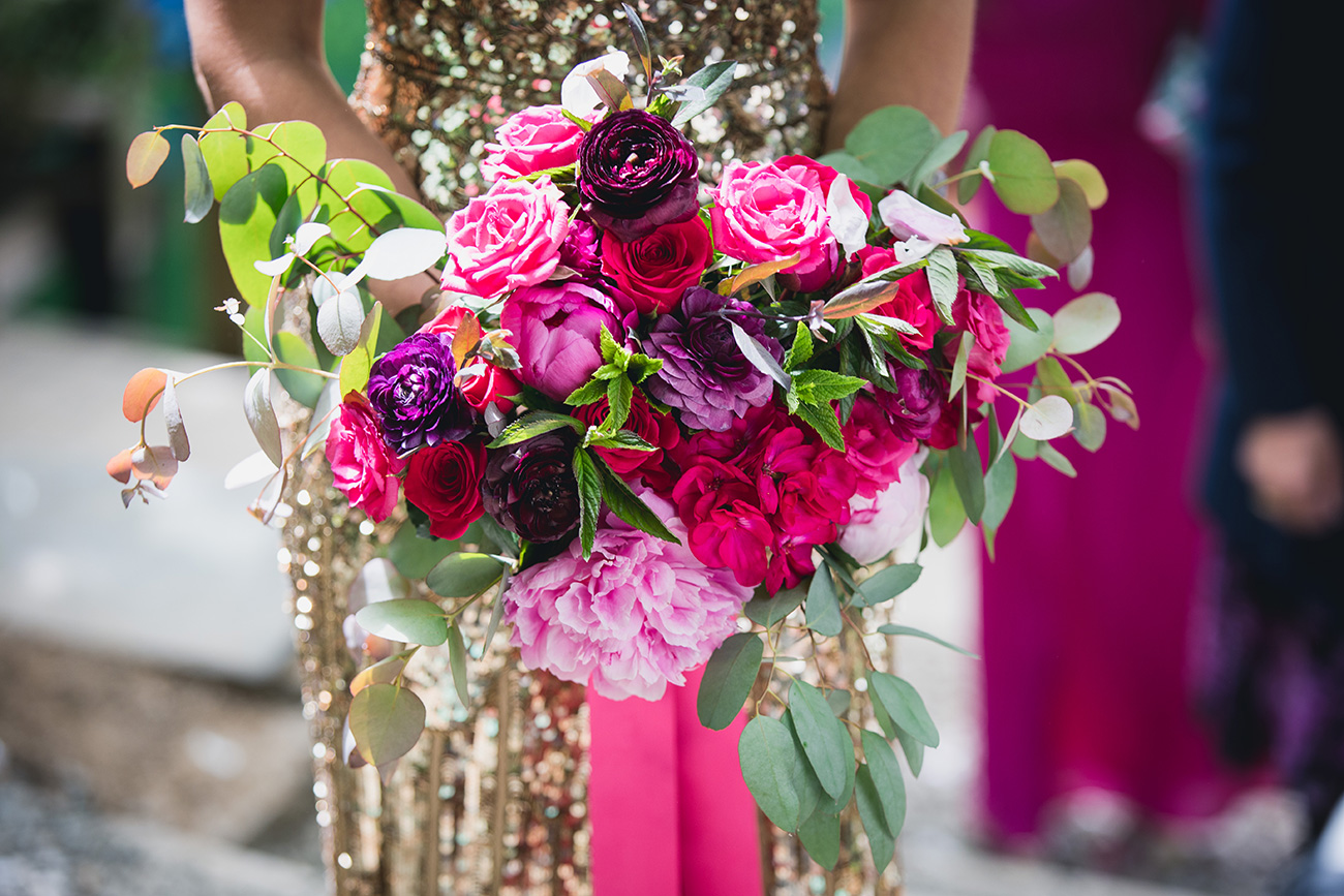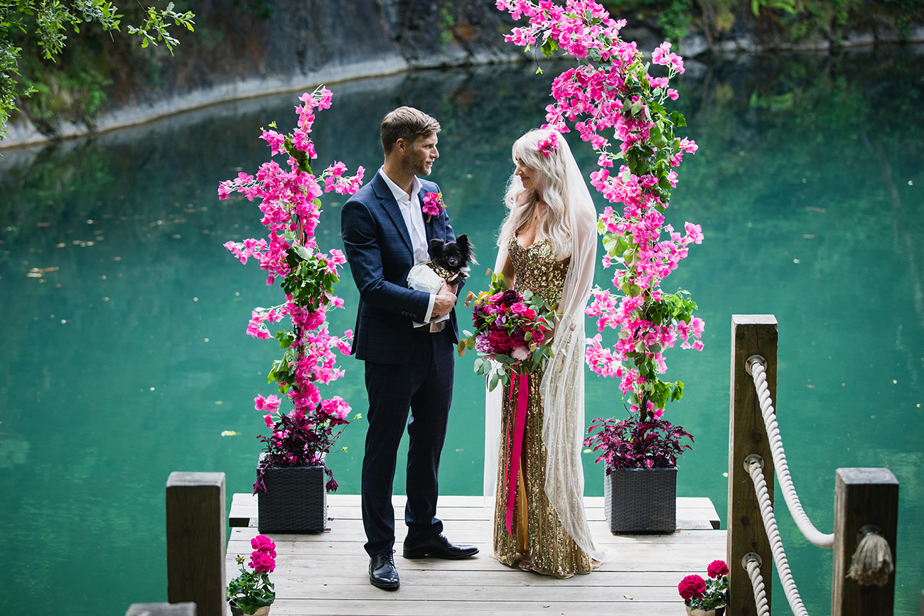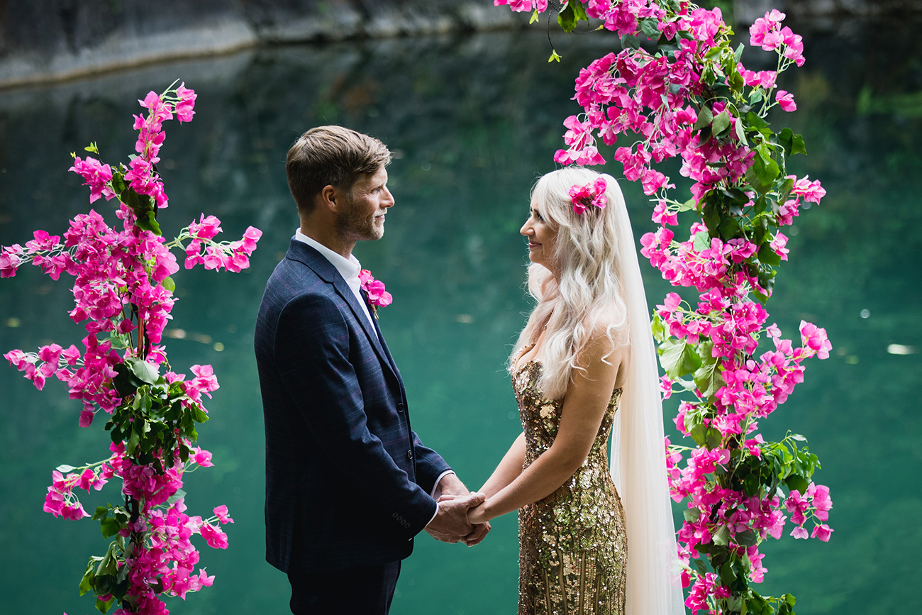 The couple decided to tie the knot during an intimate lakeside ceremony surrounded by their closest family and friends ahead of a bigger reception the following week. “I always wanted a Mediterranean theme as I just love the colours,” explains Phoebe, who opted for a gorgeous palette. “The bright pink bougainvillea flowers against the turquoise water made us feel like we were in Greece, and my gold sequin dress added a bit of sparkle!” she says of the dazzling gown she made herself.