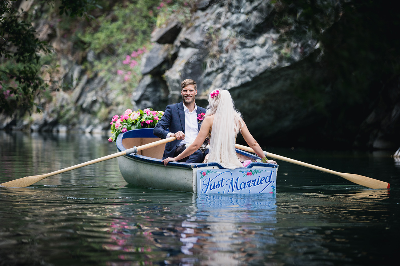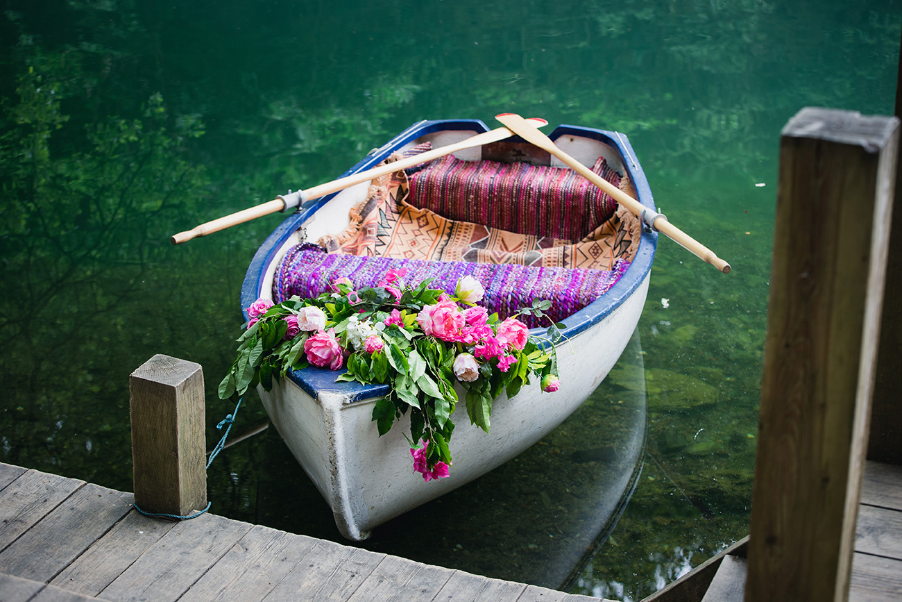 After taking their vows before the shimmering waters, the couple stole some romantic moments rowing across the lake while being serenaded by a saxophonist who played chilled Ibiza-style tunes. “We then hopped aboard a vintage campervan and went to our local beach for a swim and a surf! It was a really relaxed day that was just perfect for us,” says Phoebe.