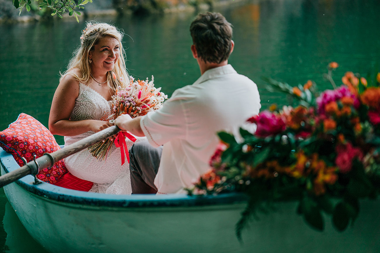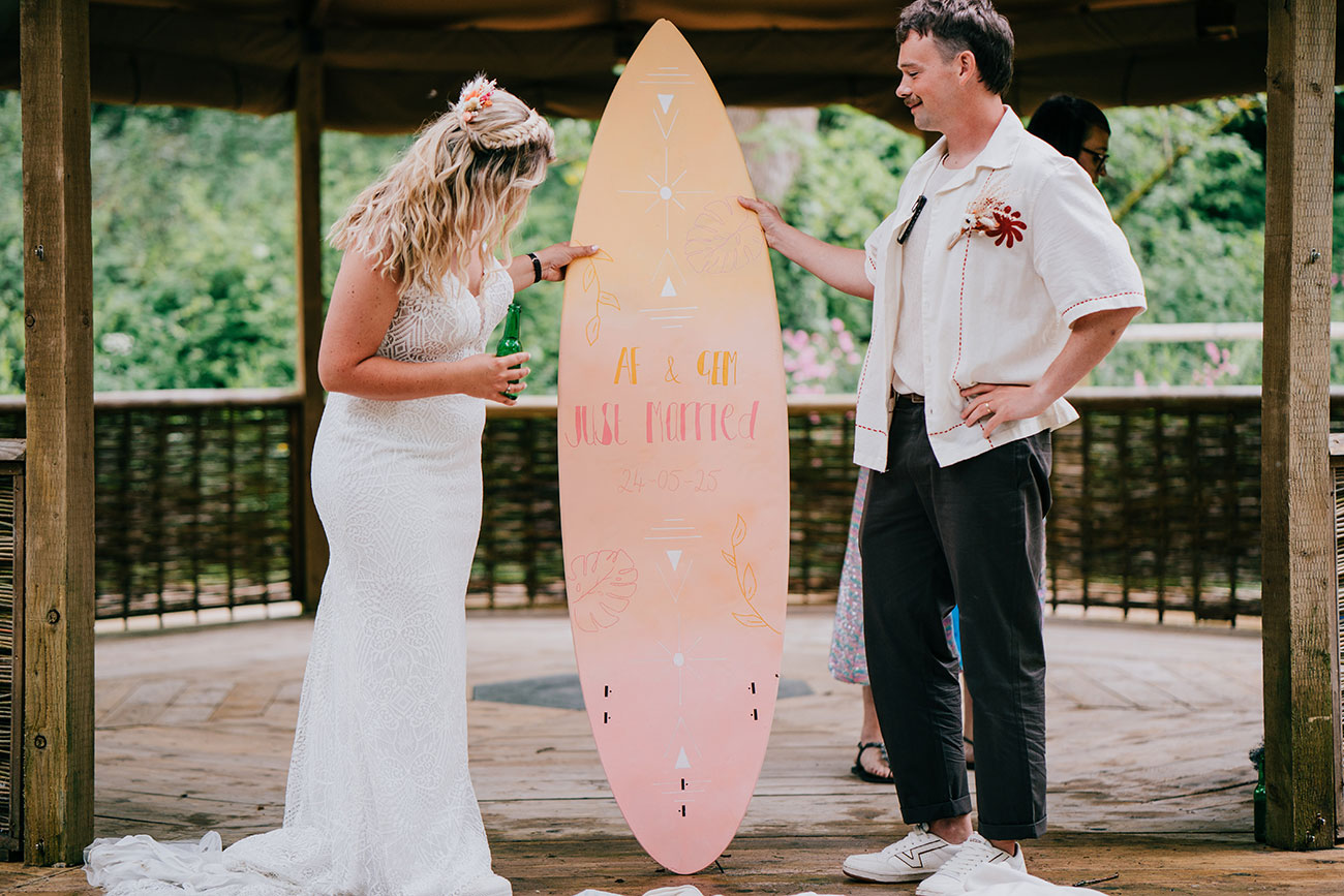 True to form, the ceremony was full of joyful surprises: bubble machines, a Mexican hug that rippled through the rows of guests and a life-sized cut-out of Bradley from S Club 7 (Gemma’s childhood crush). Adam also surprised Gemma with a personalised surfboard to stand on during their vows – a sweet nod to her childhood dream of marrying on one. “And we taped the rings under random chairs so people became surprise ring bearers,” she adds.