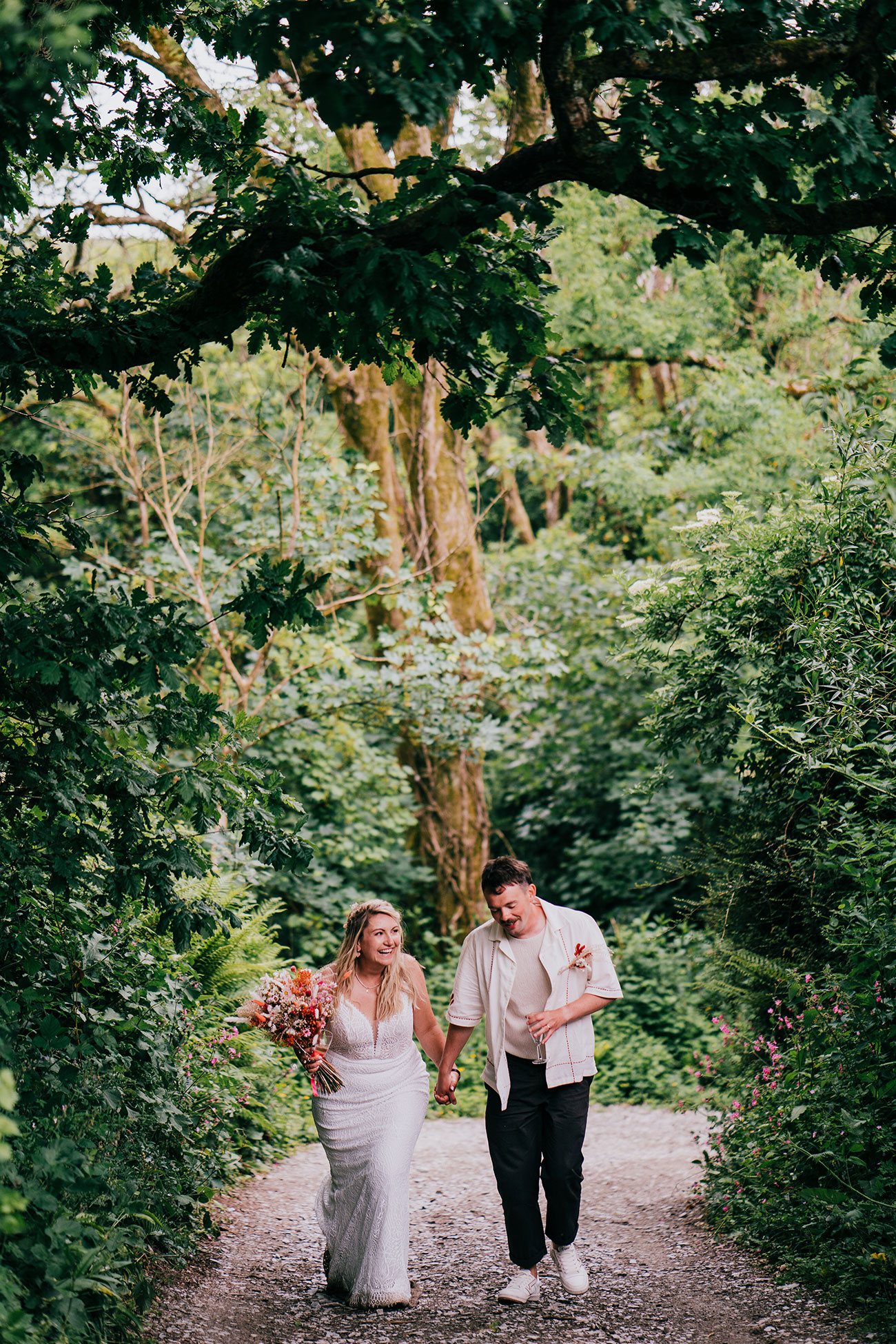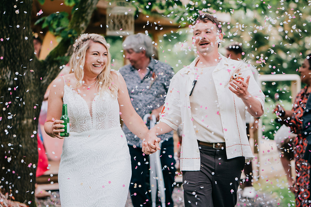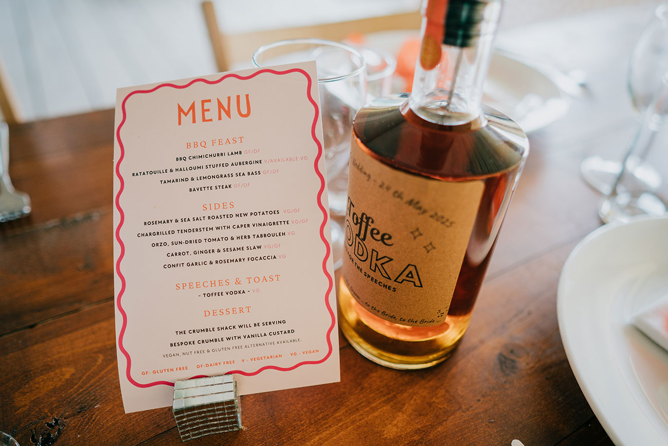 Their outdoor ceremony took place beneath the trees at the wedding pavilion, led by their friend Anna. “It was so fun and personal,” says Gemma. Guests were handed mini bottles of Babycham for a toast – a nod to Gemma’s favourite drink and a touching tribute to Adam’s mum.