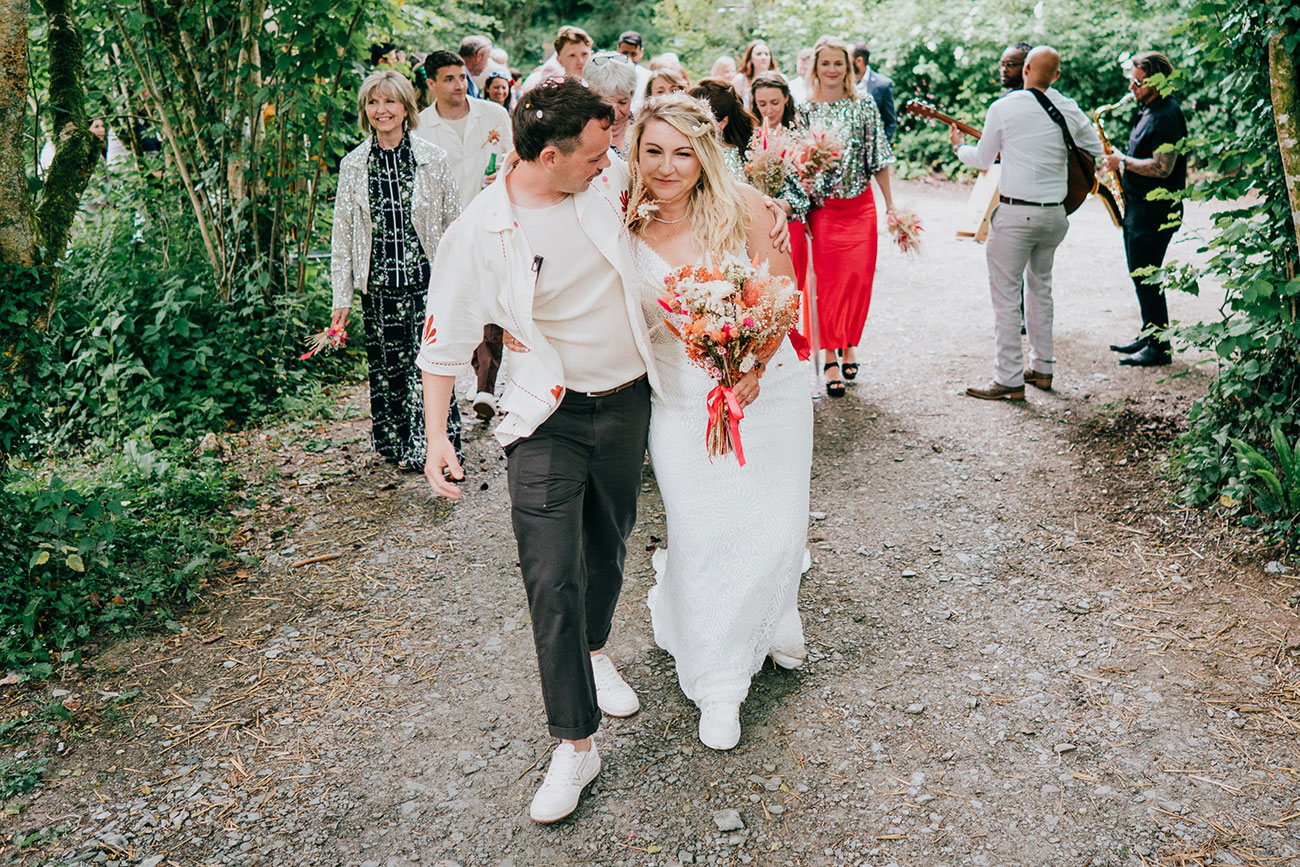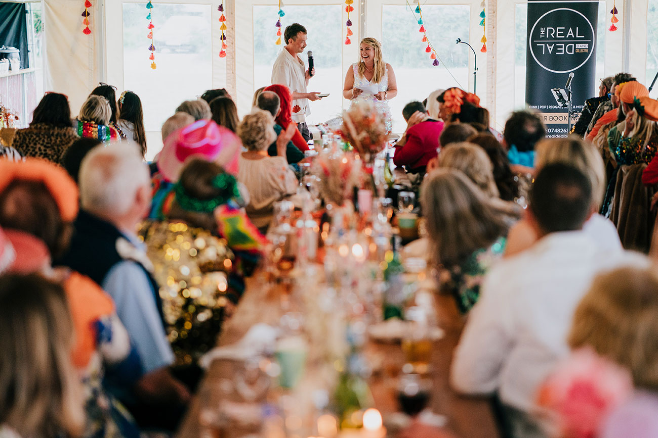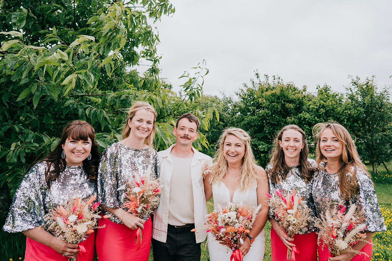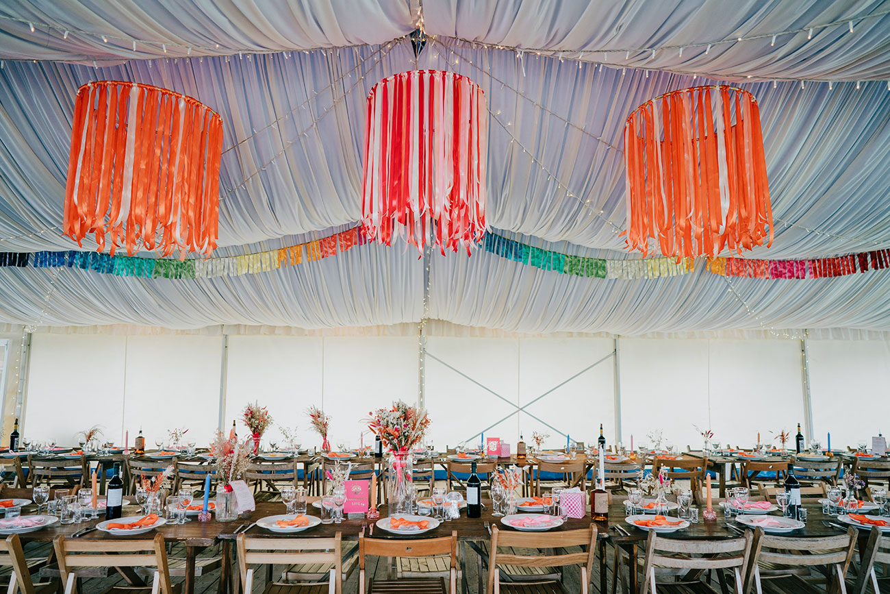 When it came to choosing a venue, Cornish Tipi Weddings instantly captured their hearts. “Driving in for the first time, there were butterflies fluttering, baby rabbits hopping around and peacocks! It felt magical,” says Gemma. The festival-loving couple were determined to create a celebration of colour, fun and high-energy moments. “Hot pink and orange were our main colours but the whole wedding was bursting with colour.”