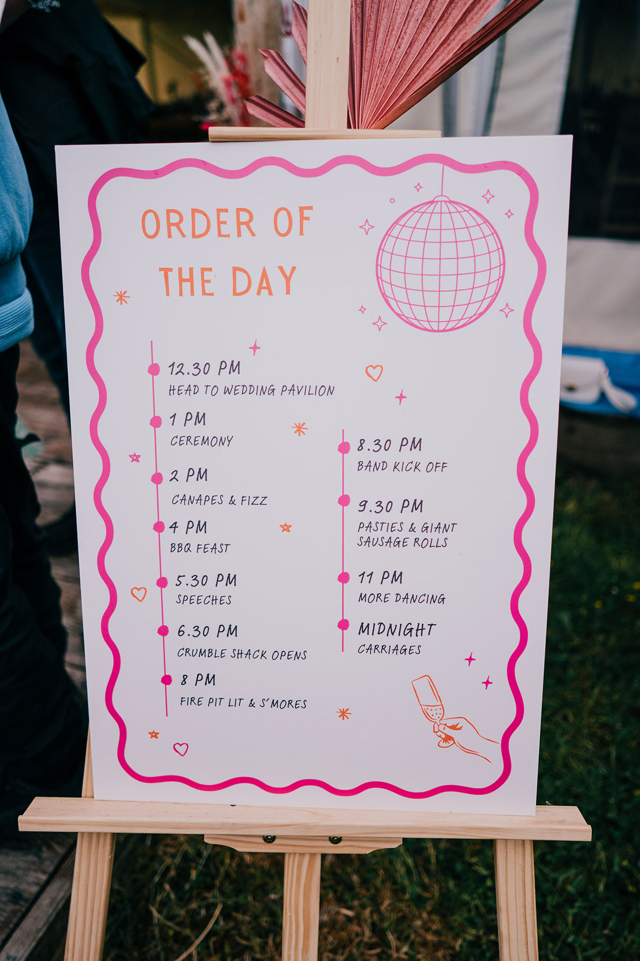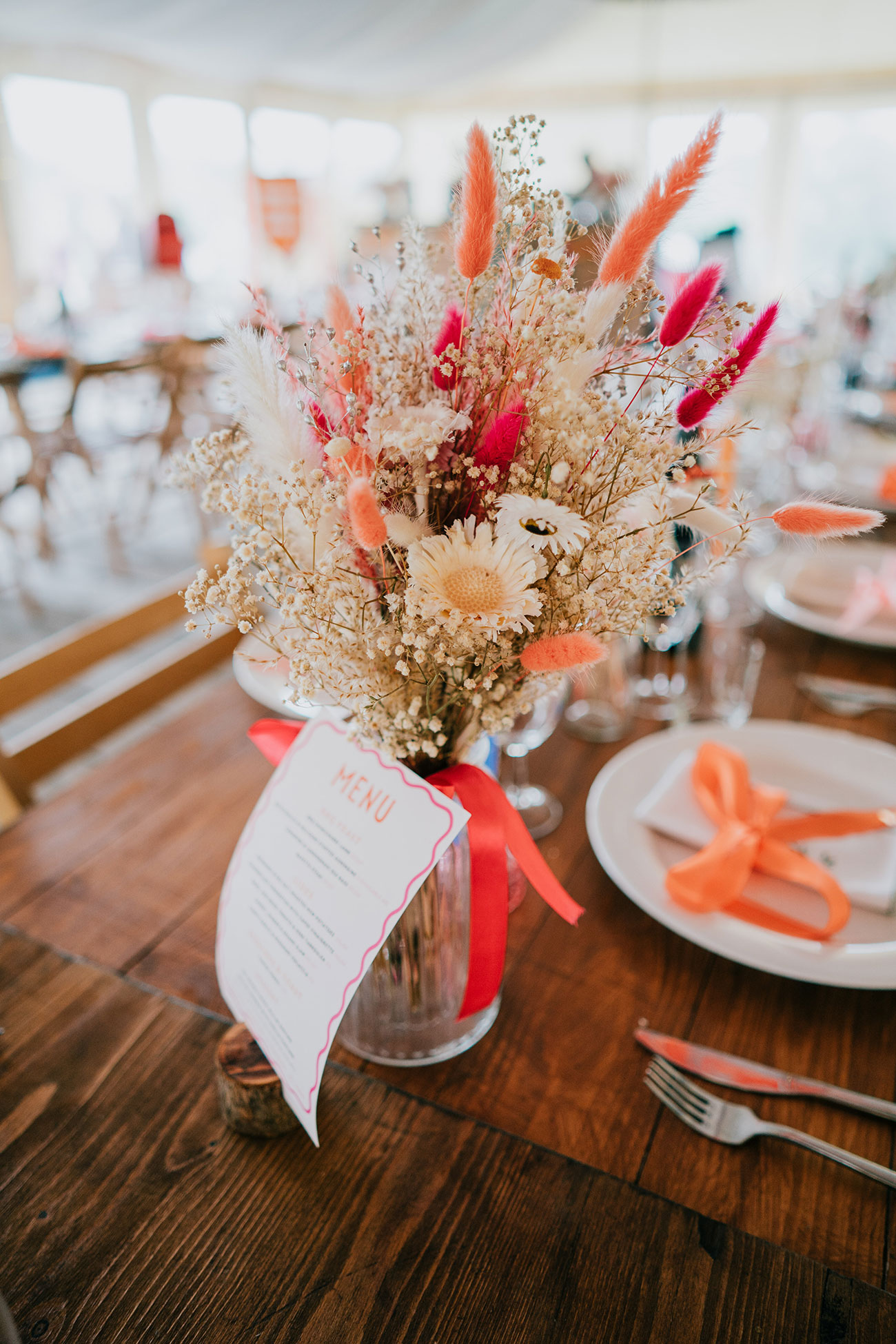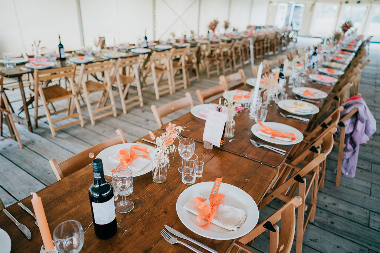When it came to choosing a venue, Cornish Tipi Weddings instantly captured their hearts. “Driving in for the first time, there were butterflies fluttering, baby rabbits hopping around and peacocks! It felt magical,” says Gemma. The festival-loving couple were determined to create a celebration of colour, fun and high-energy moments. “Hot pink and orange were our main colours but the whole wedding was bursting with colour.”