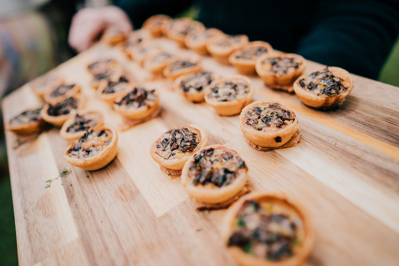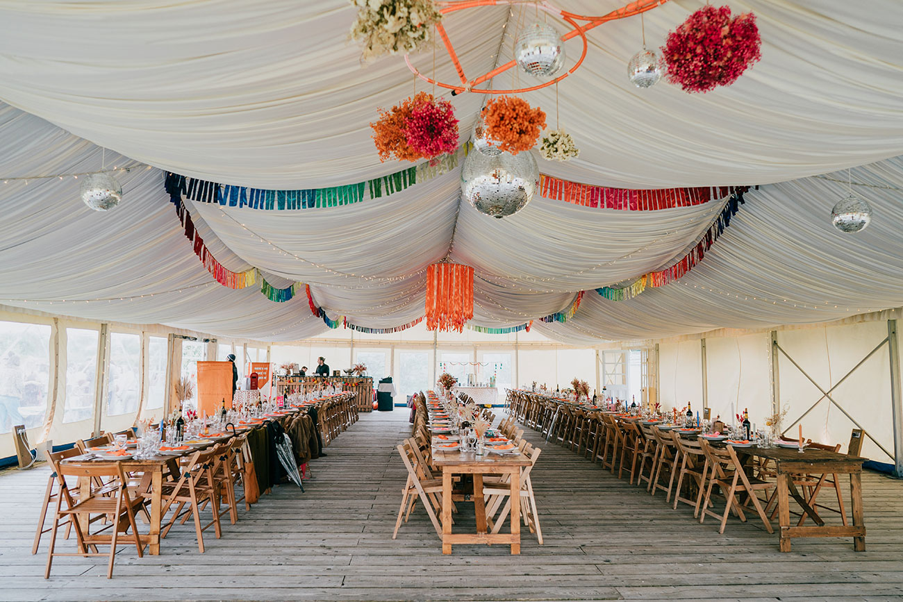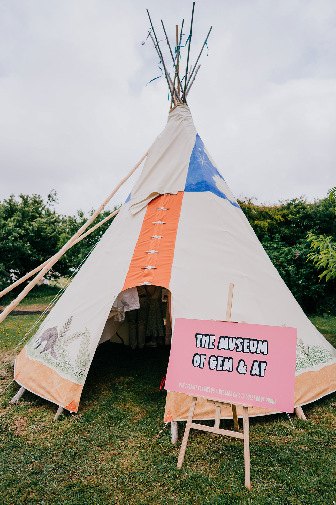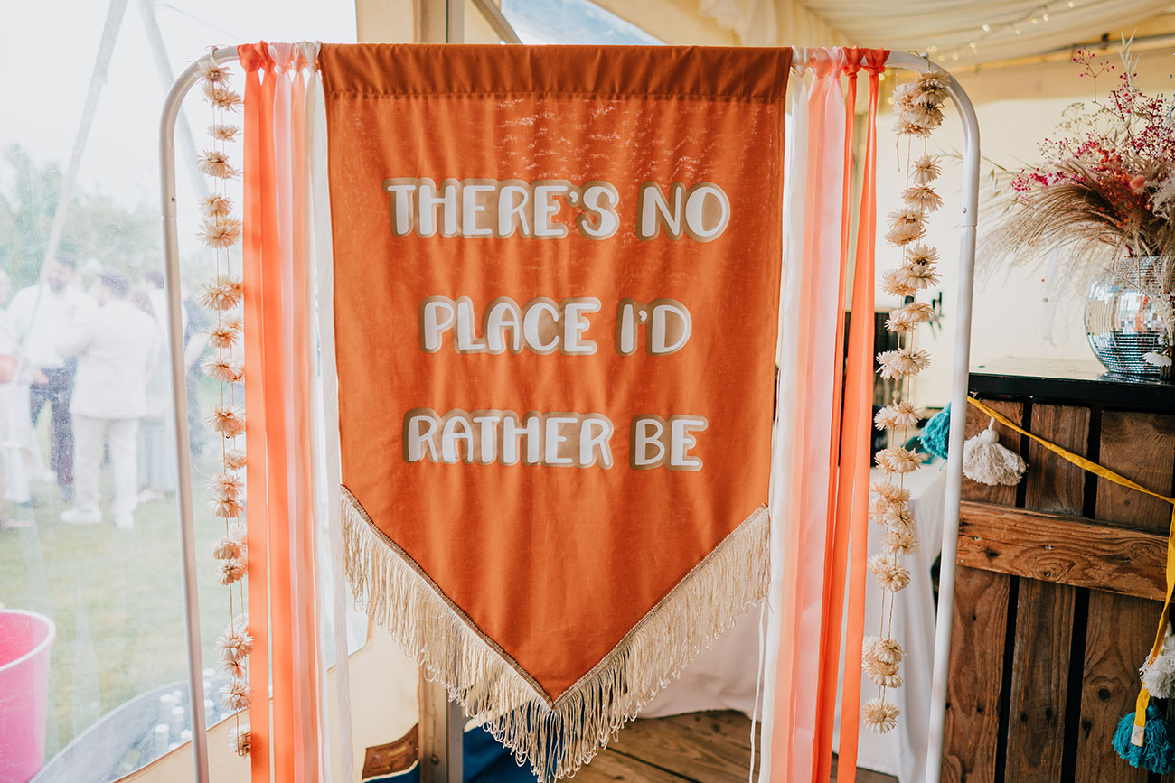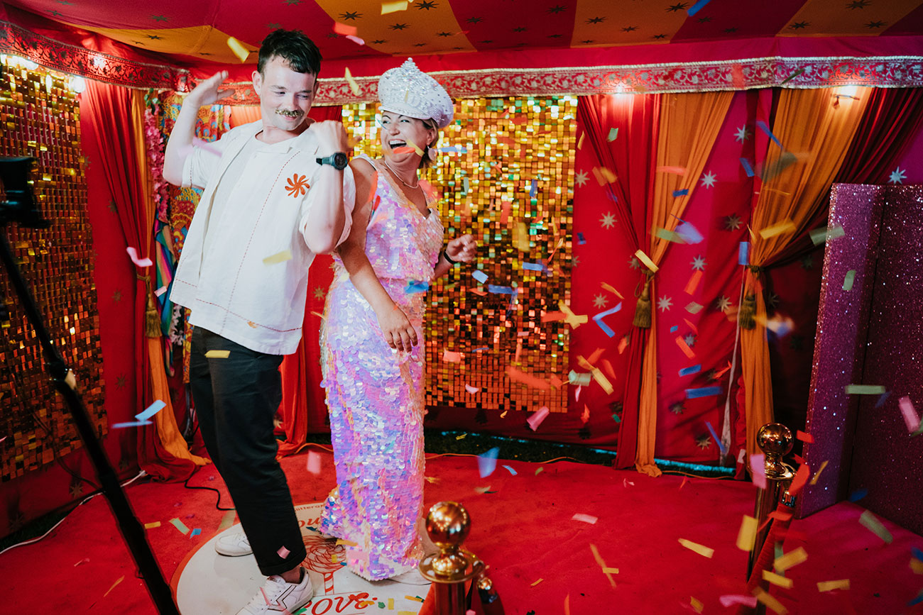 Led by The Real Deal Band, guests were then paraded through the woods to the marquee, where the festival vibes really kicked in. Canapés, candyfloss and a tent filled with festival outfits set the tone, alongside a glitter station, chill-out area and a 360 video booth. One tipi became ‘The Museum of Gem and Adam’, where guests displayed sentimental and funny objects from their lives. “The stories were brilliant,” says Gemma.