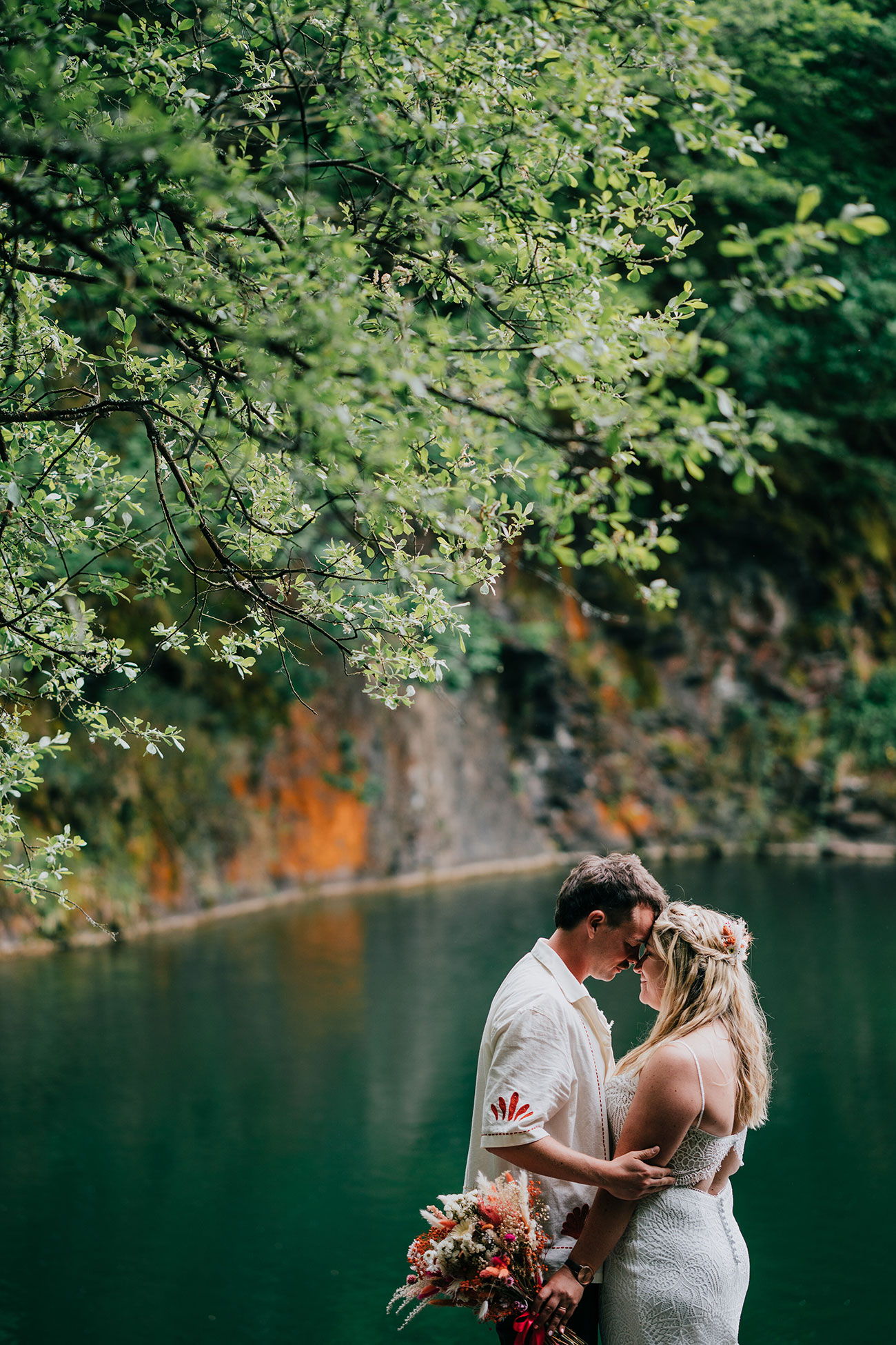 Mutual friends brought Gemma and Adam together during a day out in London. “We weren’t each other’s usual type,” laughs Gemma, “but happened to be the two single ones.” Romance quickly followed, and soon the pair made the move to Cornwall. At the end of their first season living by the sea, Adam planned a day centred around all of their favourite things in Newquay. After a hotel breakfast, beach walk and coffee they headed to Little Fistral for a dip – champagne in tow. “Adam pulled the ring from the leg of his wetsuit!” laughs Gemma.